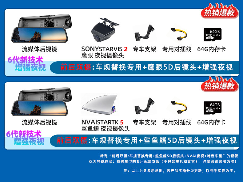| Package | Pure Rear View: Replacement Dedicated + Eagle Eye Starvis2 Rear Lens + Nvai Night Vision,Pure Rear View: Special Replacement + Shark Fin Startk5D Rear Lens + Nvai Night Vision,Dual Front and Rear Cameras: Replacement Kit + Enhanced Starvis 2 Rear Lens + Nvai Night Vision,Front and Rear Dual Cameras: Dedicated Replacement + Shark Fin Startk5D Rear Lens + Nvai Night Vision,Front and Rear Dual Cameras: Dedicated Replacement + Shark Fin Startk5D Rear Lens + Specific Models |