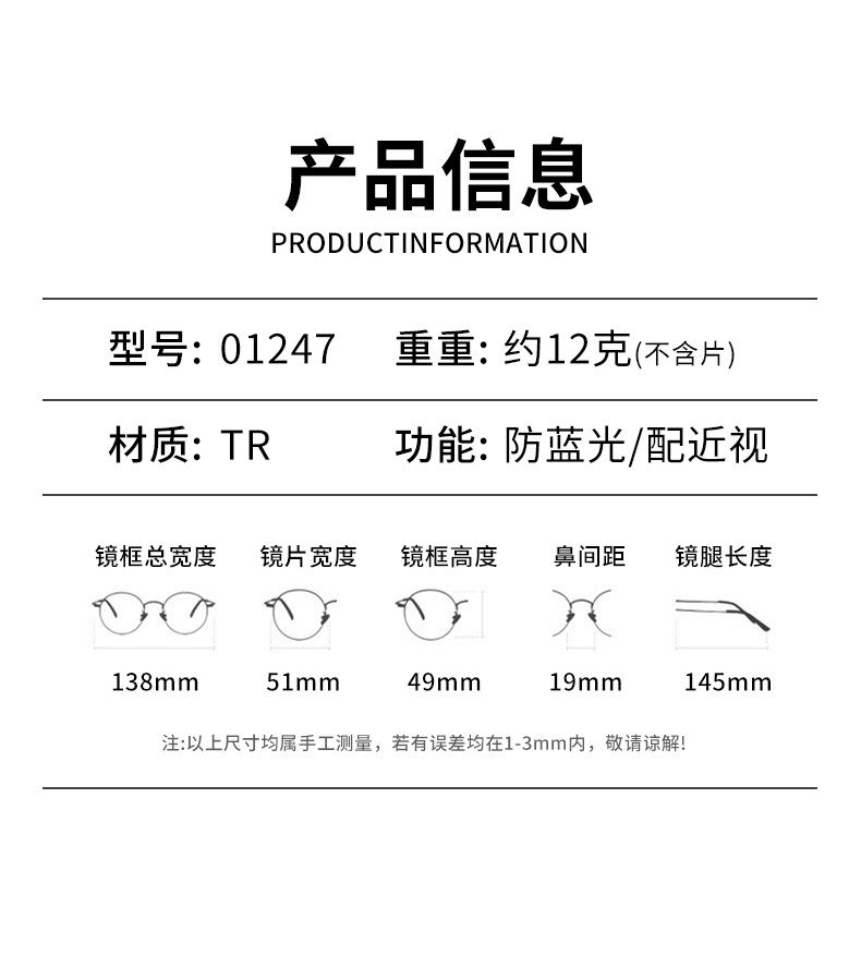 | Lens Refractive Index | 0-Degree Flat Light Without Degree (Anti-Blue Light Mirror and Anti-Radiation Lens),100-Degree Vision (1.56 Aspheric Lens),150 Degrees for Both Eyes (1.56 Aspherical Lens),200 Degrees for Both Eyes (1.56 Aspherical Lenses),250 Degrees for Both Eyes (1.56 Aspherical Lens),300 Degrees for Both Eyes (1.56 Aspherical Lenses),350 Degrees for Both Eyes (1.56 Aspherical Lens),400 Degrees for Both Eyes (1.56 Aspherical Lenses),450 Degrees for Both Eyes (1.56 Aspherical Lenses),500 Degrees for Both Eyes (1.56 Aspherical Lenses),550 Degrees for Both Eyes (1.56 Aspherical Lens),600 Degrees for Both Eyes (1.56 Aspherical Lenses),1.56 Aspherical Radiation-Proof Lens [Remark Degree],1.61 Aspherical Radiation-Proof Lens [Remarks on Degree],1.67 Aspherical Radiation-Proof Lens [Remark Degree],1.74 Aspherical Radiation-Proof Lenses [Remarks on Degree],1.56 Aspherical Radiation-Proof and Blue-Light-Proof Lenses [Remarks on Degree],1.61 Aspherical Anti-Radiation and Anti-Blue Light Lenses [Remarks on Degree],1.67 Aspherical Anti-Radiation and Anti-Blue Light Lenses [Remarks on Degree],1.74 Aspheric Anti-Radiation and Anti-Blue Light Lenses [Remarks on Degree] |