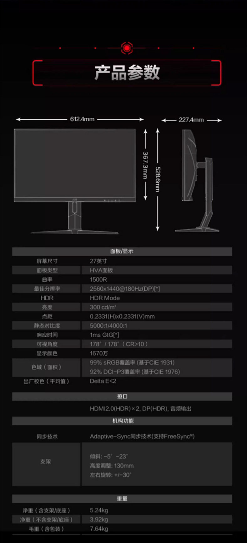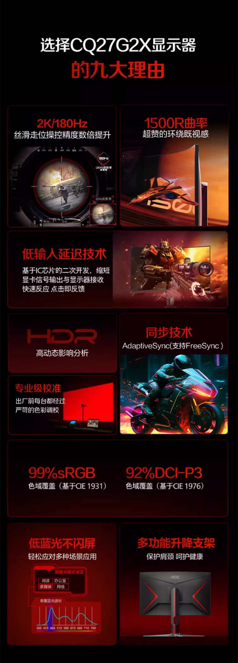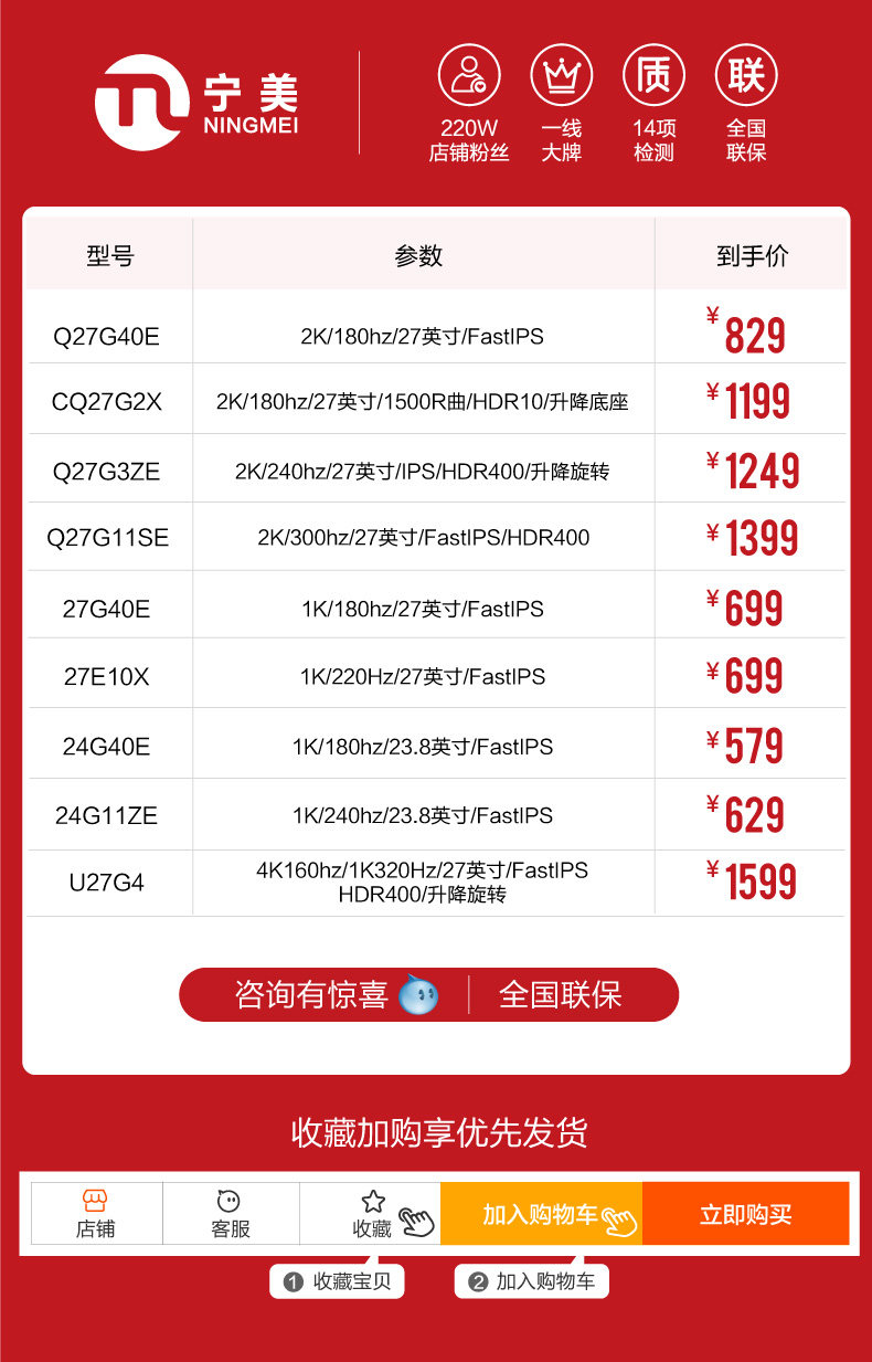 | Color Classification | [2K/200Hz/ 27inch /Fastips/Hdr400/Lifting and Rotating] Q27G3H,【2K/180Hz/Fast Ips】Q27G40E,【2K/180Hz/Fast Ips】Q27G11E,[2K/180Hz/ 27inch /1500R Curve/Hdr10/Lifting Base] Cq27G2X,[2K/240Hz/ 27inch /Ips/Hdr400/Lifting and Rotating] Q27G3Ze,【2K/300Hz/Fast Ips/Hdr400】 Q27G11Se,【1K/240Hz/ 27inch /Fast Ips】27G11Ze2,【1K/220Hz/ 27inch /Fast Ips】27E10X,【1K/180Hz/ 27inch /Fast Ips】27G40E,[1K/165Hz/ 27inch /1500R Curved Surface/Lifting Base] C27G2X,【1K/310Hz/ 24.5inch /Fast Ips/Hdr400】25G40Se,【1K/240Hz/ 23.8inch /Fast Ips】24G11Ze,【1K/180Hz/ 23.8inch /Fast Ips】24G40E,【1K/180Hz/Fast Ips】24G11E2,[4K/160Hz/ 27inch /Fastips/Hdr400/Lifting and Rotating] U27G10,[4K160Hz/Dual Mode 1K320Hz/ 27inch /Fastips/Lift and Rotate/Hdr400] U27G4 |