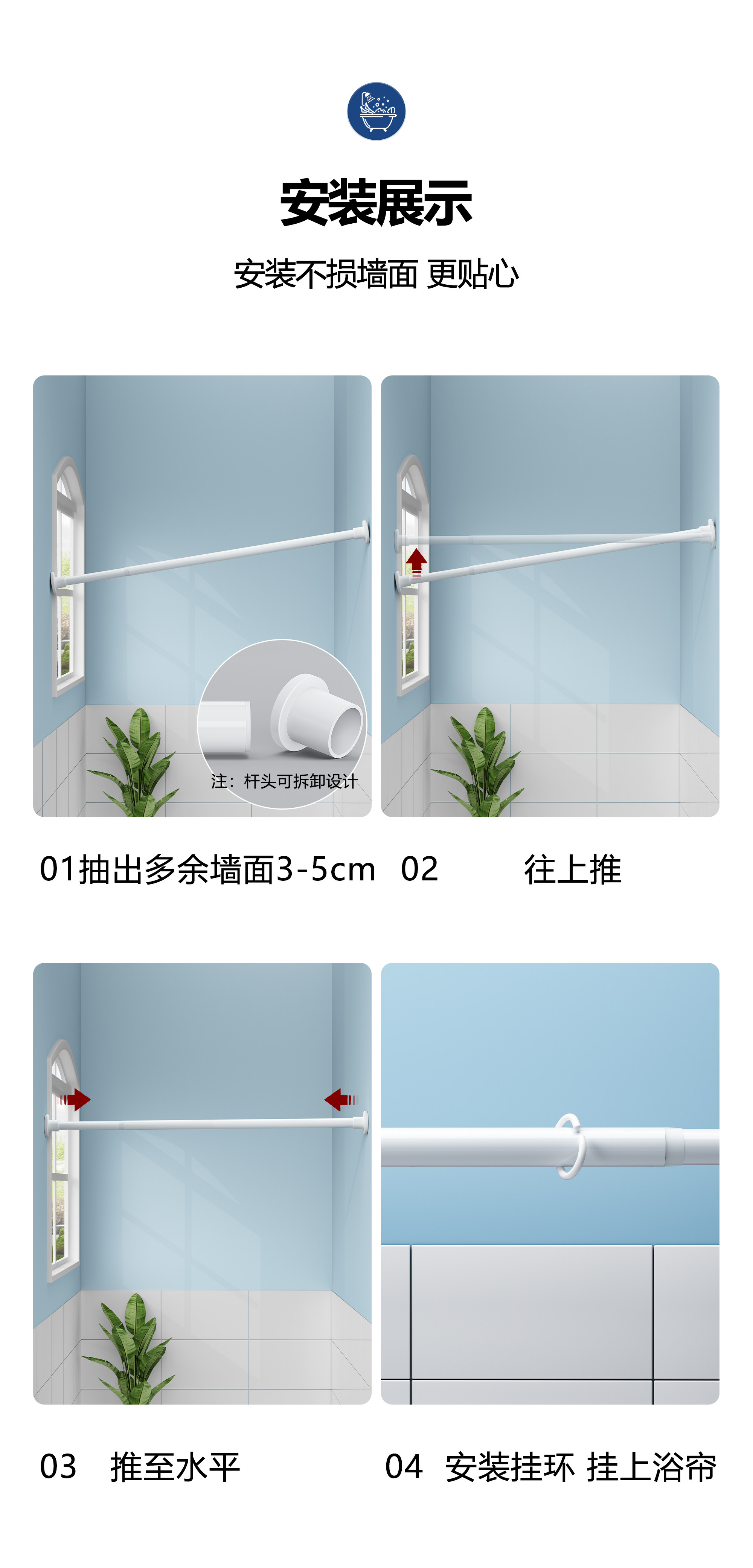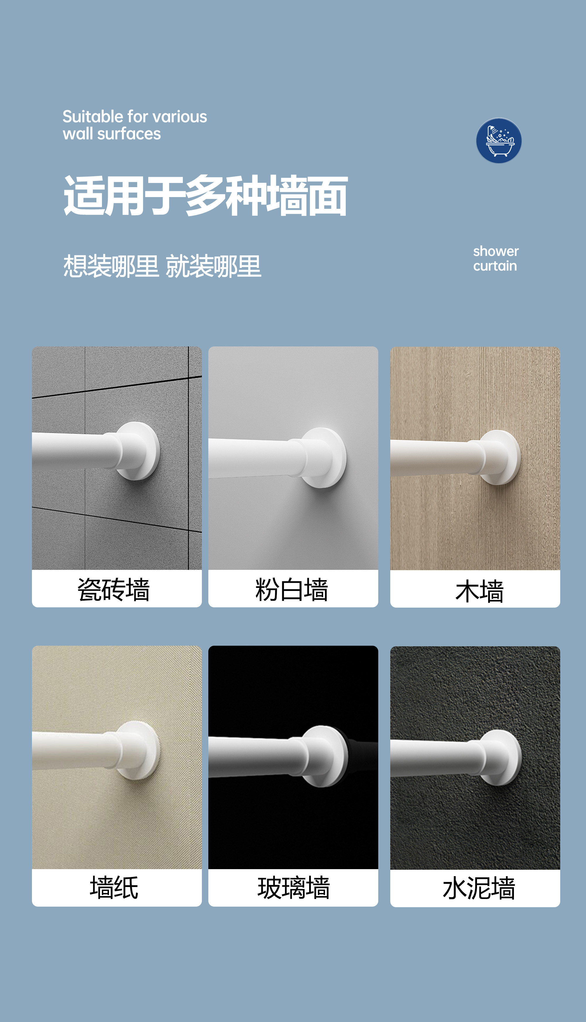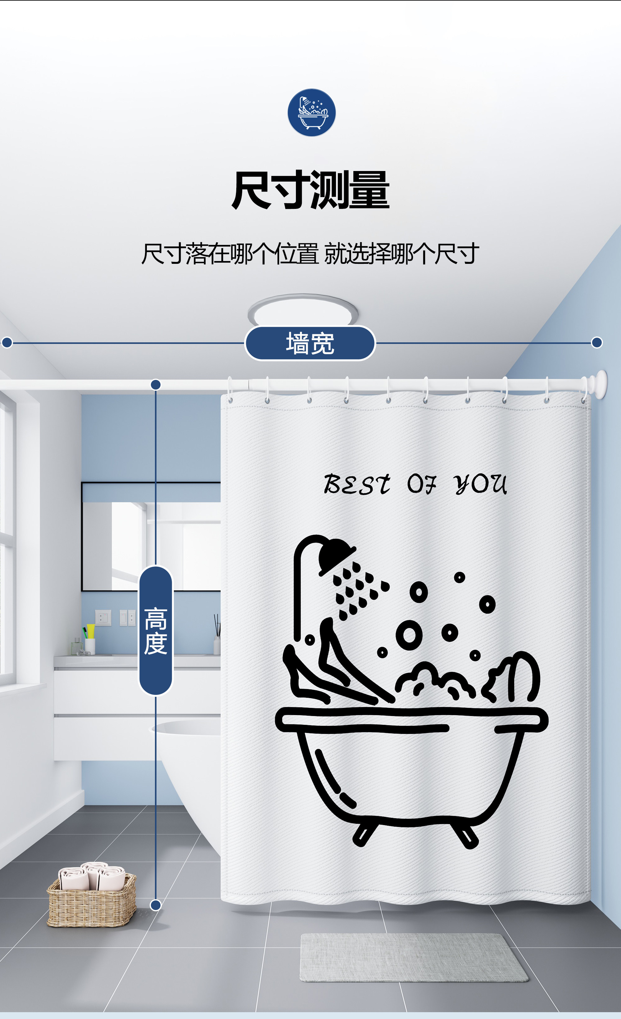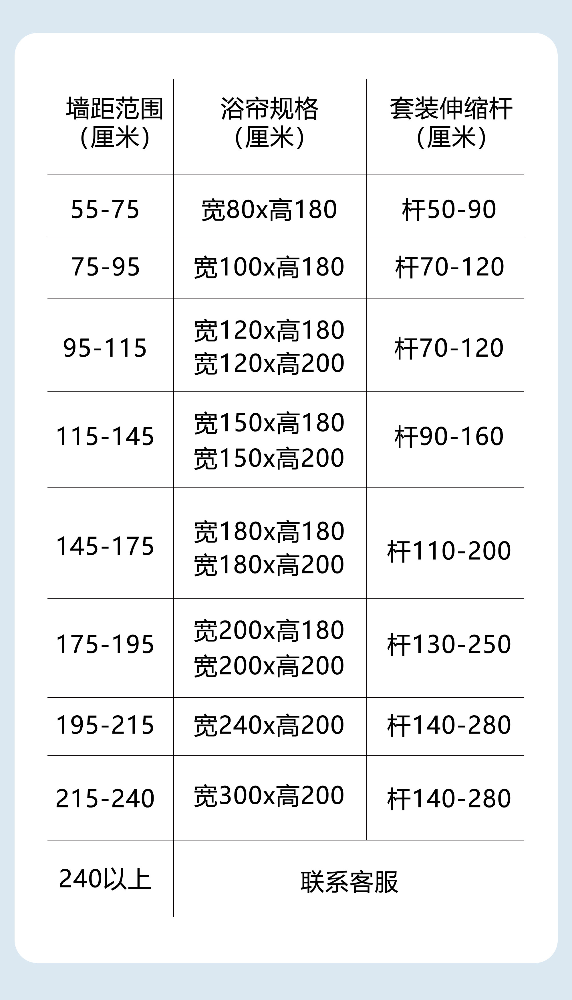 | Size | Suit (Applicable to Wall Width 55-75cm) Width 80*Height 180+0.8 Poles + Rings + Straps,Set (Applicable to Wall Width 75-90cm) Width 100*Height 180+1.2 Poles + Rings + Straps,Suit (Applicable to Wall Width 90-110cm) Width 120*Height 180+1.2 Poles + Rings + Straps,Suit (Applicable to Wall Width 90-110cm) Width 120*Height 200+1.2 Poles + Rings + Straps,Suit (Applicable to Wall Width 110-145cm) Width 150*Height 180+1.6 Poles + Rings + Straps,Suit (Applicable to Wall Width 110-145cm) Width 150*Height 200+1.6 Poles + Rings + Straps,Suit (Applicable to Wall Width 145-175cm) Width 180*Height 180+2.0 Pole + Ring + Strap,Suit (Applicable to Wall Width 145-175cm) Width 180*Height 200+2.0 Pole + Ring + Strap,Suit (Applicable to Wall Width 160-190cm) Width 200*Height 200+2.4 Poles + Rings + Straps,Suit (Applicable to Wall Width 160-190cm) Width 200*Height 240+2.4 Poles + Rings + Straps,Suit (Applicable to Wall Width 180-230cm) Width 240*Height 200+2.6 Poles + Rings + Straps,Suit (Applicable to Wall Width 220-260cm) Width 300*Height 200+3.0 Pole + Ring + Strap,Single Shower Curtain (Suitable for Wall Width 55-75cm) Width 80*Height 180+Loop+Tie,Single Shower Curtain (Suitable for Wall Width 75-90cm) Width 100*Height 180+Loop+Tie,Single Shower Curtain (Suitable for Wall Width 90-110cm) Width 120*Height 180+Loop+Tie,Single Shower Curtain (Suitable for Wall Width 90-110cm) Width 120*Height 200+Loop+Tie,Single Shower Curtain (Suitable for Wall Width 110-145cm) Width 150*Height 180+Loop+Tie,Single Shower Curtain (Suitable for Wall Width 110-145cm) Width 150*Height 200+Loop+Tie,Single Shower Curtain (Suitable for Wall Width 145-175cm) Width 180*Height 180+Loop+Tie,Single Shower Curtain (Suitable for Wall Width 145-175cm) Width 180*Height 200+Loop+Tie,Single Shower Curtain (Suitable for Wall Width 160-190cm) Width 200*Height 200+Loop+Tie,Single Shower Curtain (Suitable for Wall Width 160-190cm) Width 200*Height 240+Loop+Tie,Single Shower Curtain (Suitable for Wall Width 180-230cm) Width 240*Height 200+Loop+Tie,Single Shower Curtain (Suitable for Wall Width 220-260cm) Width 300*Height 200+Loop+Tie,Contact Customer Service for Customized Sizes |