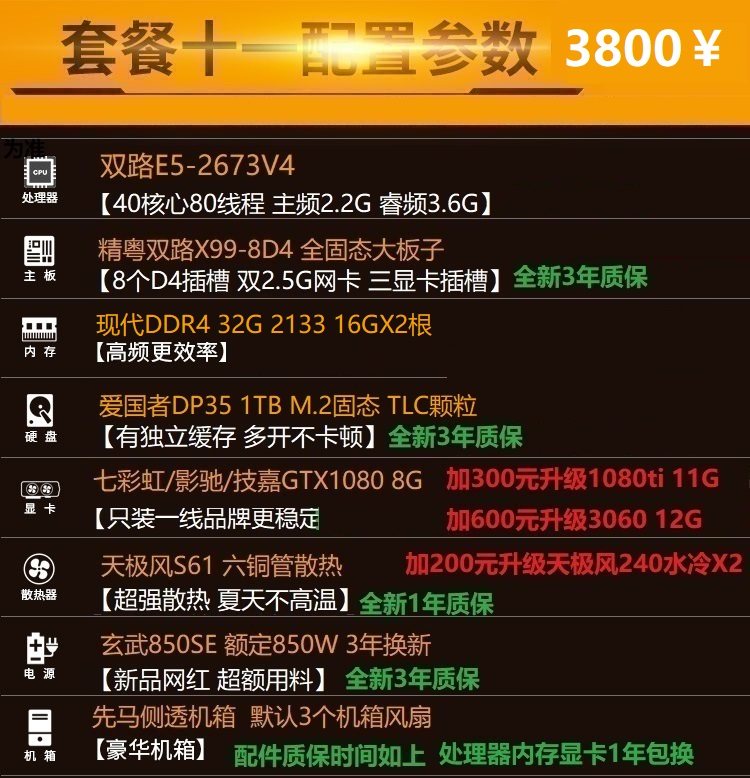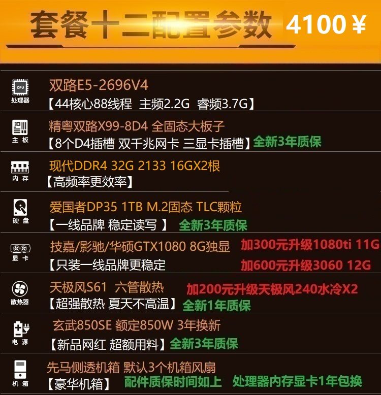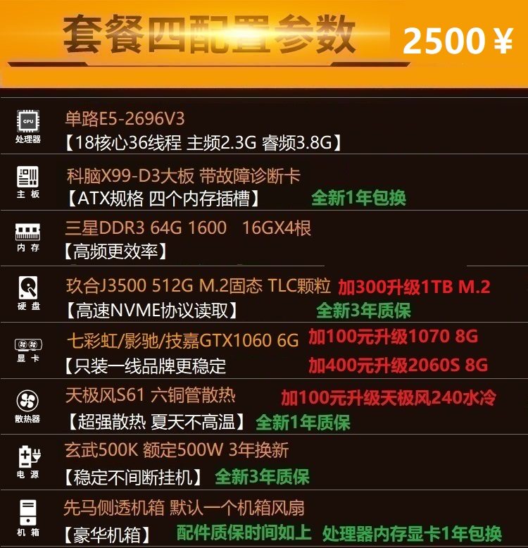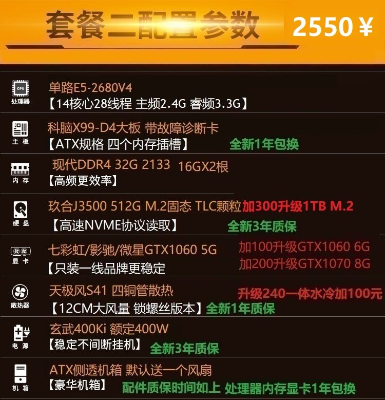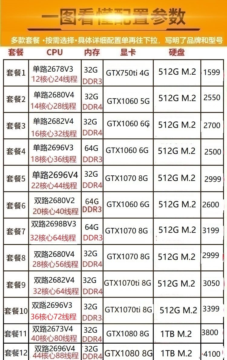 | Package Type | Package 1 Single Channel 2678V3+750Ti 4g,Package 2 Single Channel 2680V4+1060 5g,Package Three Single Channel 2682V4+1060 6g,Package 4 Single Channel 2696V3+1060 6g,Package 5 Single Channel 2696V4+1070 8g,Package 6 Dual Channel 2680V2+1060 6g,Package 7 Dual Channel 2698Bv3+1070 8g,Package 8 Dual Channel 2680V4+1070 8g,Package Nine Dual Channel 2682V4+1070Ti 8g,Package 10 Dual Channel 2696V3+1070Ti 8g,Package 11 Dual Channel 2673V4+1080 8g,Package 12 Dual Channel 2696V4+1080 8g |