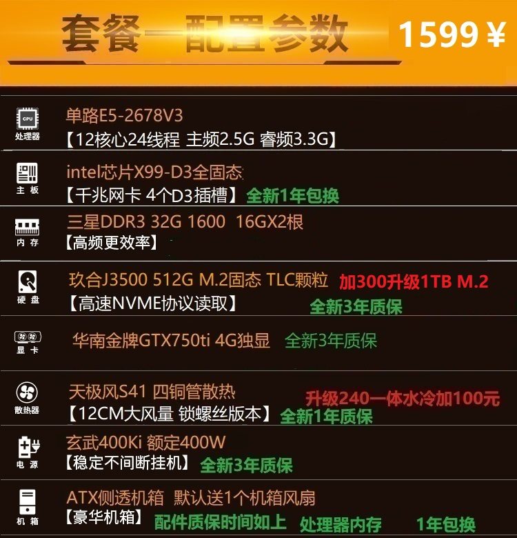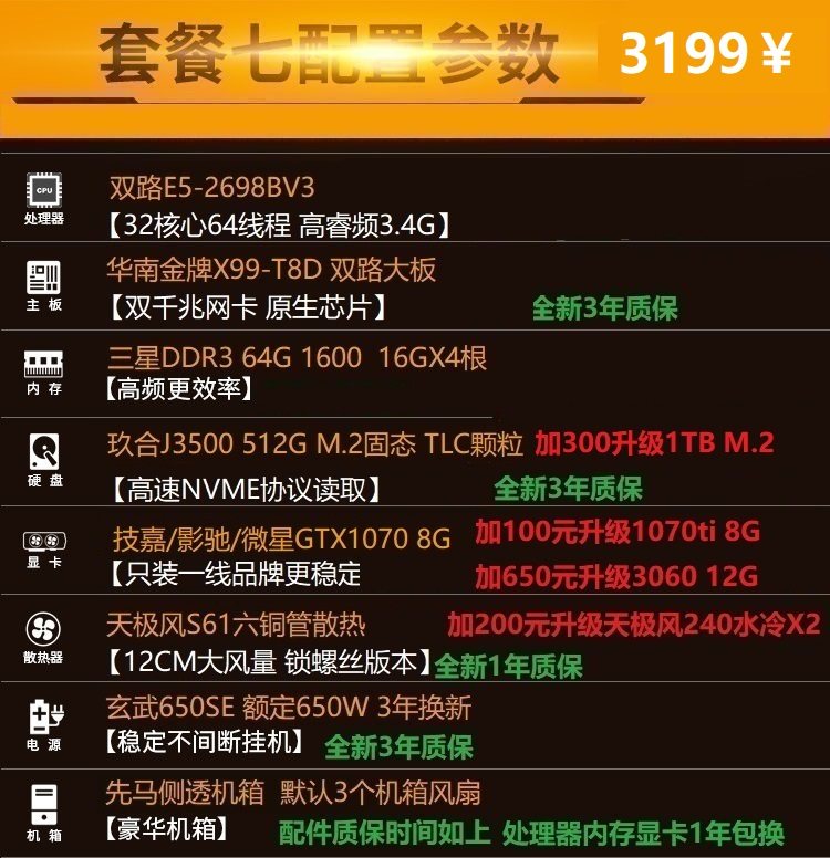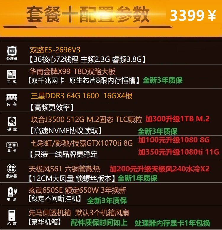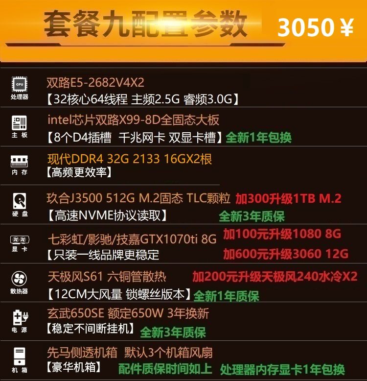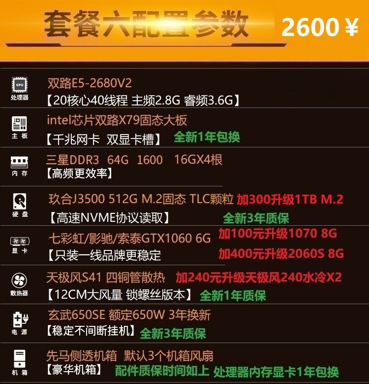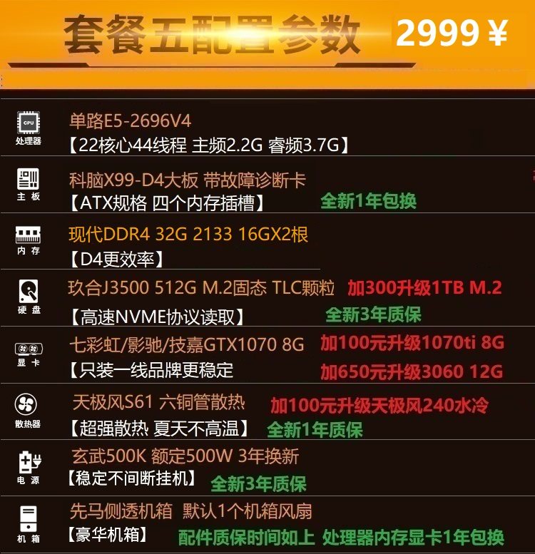 | Package Type | Package 1 Single Channel 2678V3+750Ti 4g,Package 2 Single Channel 2680V4+1060 5g,Package Three Single Channel 2682V4+1060 6g,Package 4 Single Channel 2696V3+1060 6g,Package 5 Single Channel 2696V4+1070 8g,Package 6 Dual Channel 2680V2+1060 6g,Package 7 Dual Channel 2698Bv3+1070 8g,Package 8 Dual Channel 2680V4+1070 8g,Package Nine Dual Channel 2682V4+1070Ti 8g,Package 10 Dual Channel 2696V3+1070Ti 8g,Package 11 Dual Channel 2673V4+1080 8g,Package 12 Dual Channel 2696V4+1080 8g |