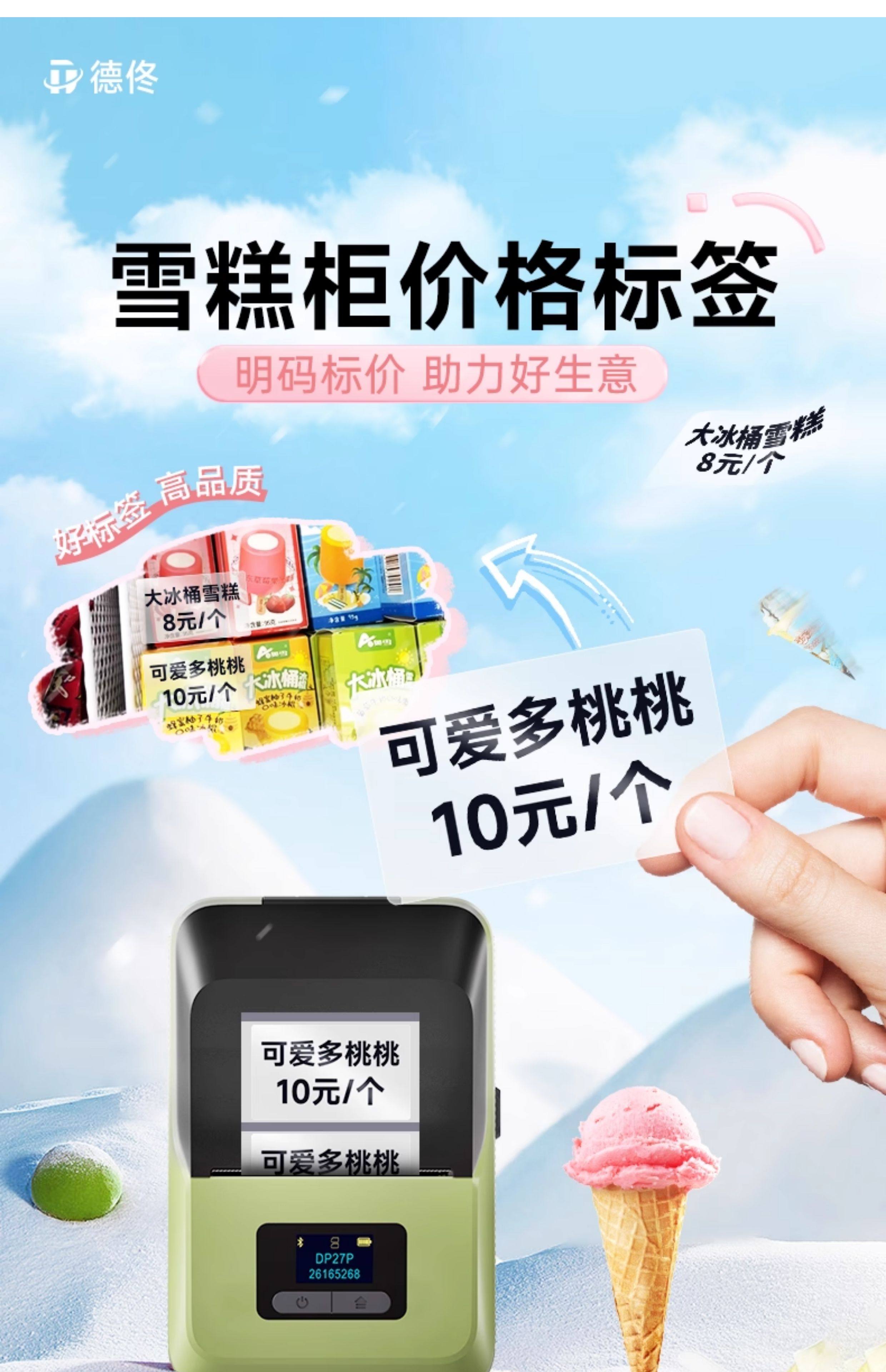 Detong Office Dp27P High-Definition Transparent Label Printer Can Be Connected to Mobile Phones, Transparent Ice Cream Sticker Printer, Pet Self-Adhesive Waterproof Label Qr Code Smart Handheld Small Label Machine