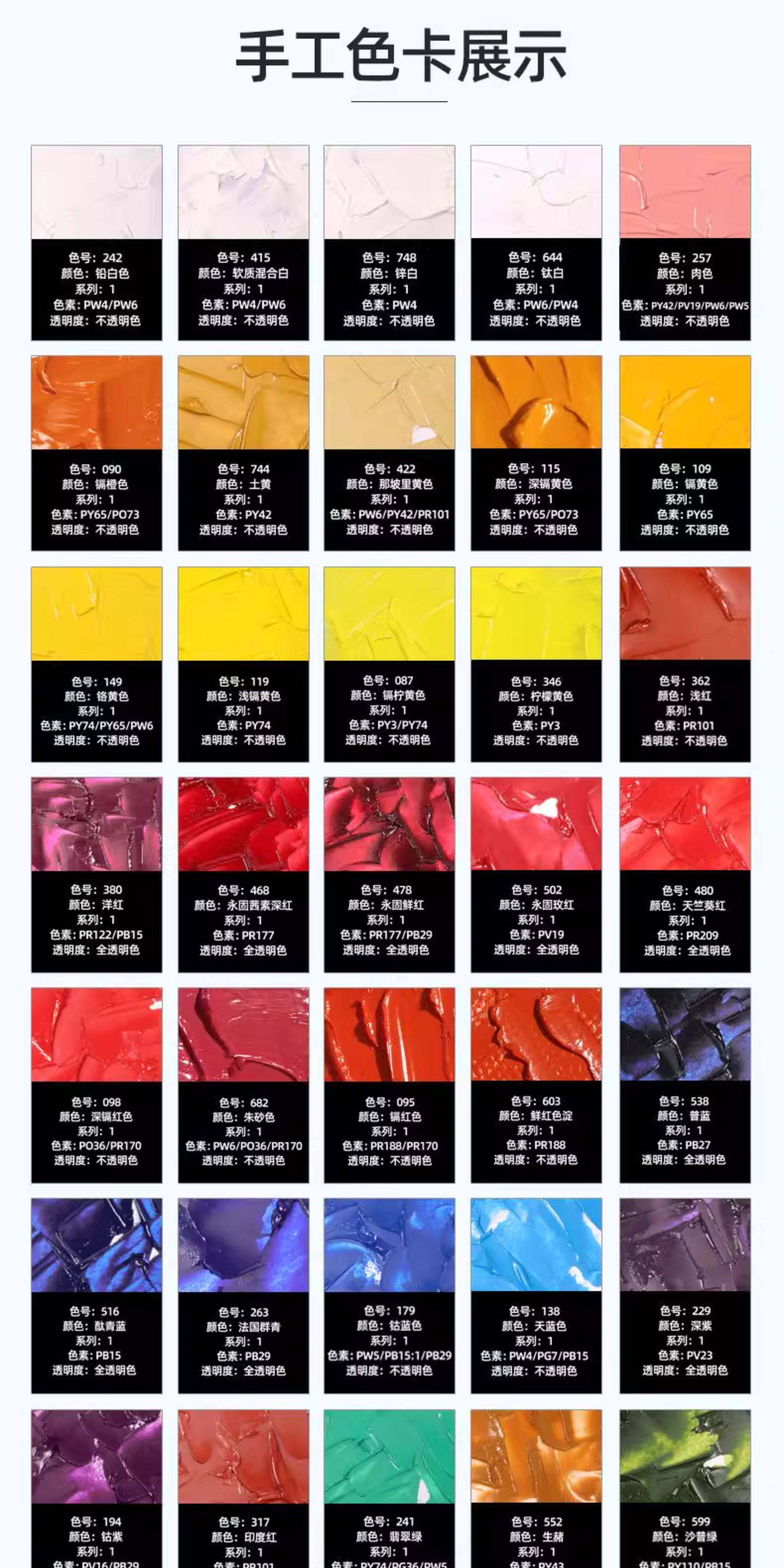 | Color Classification | Cinnabar Color,Sky Blue,Titanium White,Zinc White,Lead White,Lemon Yellow,Emerald Green,Fandai Brown,Earthy Green,Sharp Green,Raw Ochre,Phthalo Blue,Permanent Bright Red,Payne Gray,Napoli Yellow,Ivory Black,Nitrogen Yellow Green,Light Pink (Flesh Color),Deep Purple,Chrome Green,Light Cadmium Yellow,Cadmium Yellow,Deep Cadmium Red,Cooked Brown,Earthy Yellow,Bright Red,Raw Brown,Pulan,Permanent Rose Red,Geranium Red,Permanent Deep Anthracene Deep Red,Soft Blend White,Deep Patina,Nitrogen Brown,Light Red,Black Light,Indian Red,Quinacridone Deep Pink,Cobalt Purple,Deep Cadmium Yellow,Cadmium Bright Red,Cadmium Red,Cadmium Yellow,Cooked Ochre,Deep Blue Purple,Magenta,Cadmium Yellow,Emerald Green,Cobalt Blue,Phthalocyanine Deep Green,Permanent Light Green,French Ultramarine,Phthalocyanine Yellow-Green,Cadmium Orange,Commonly Used 12 Colors,Commonly Used 18 Colors,Commonly Used 24 Colors,Commonly Used 36 Colors,Commonly Used 44 Colors |