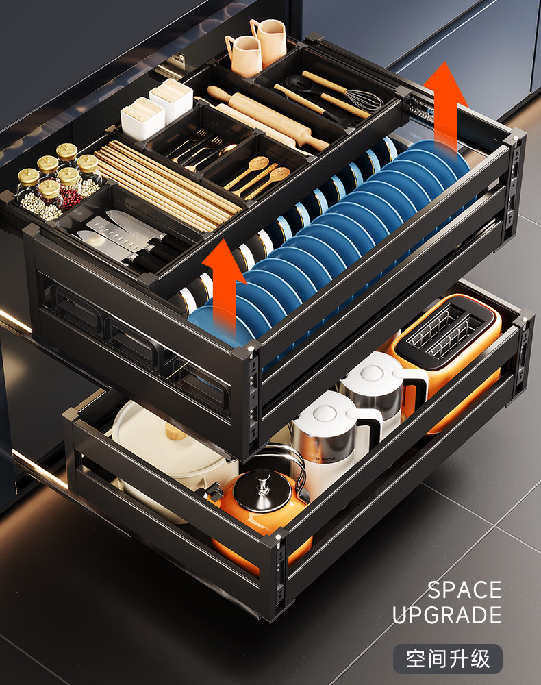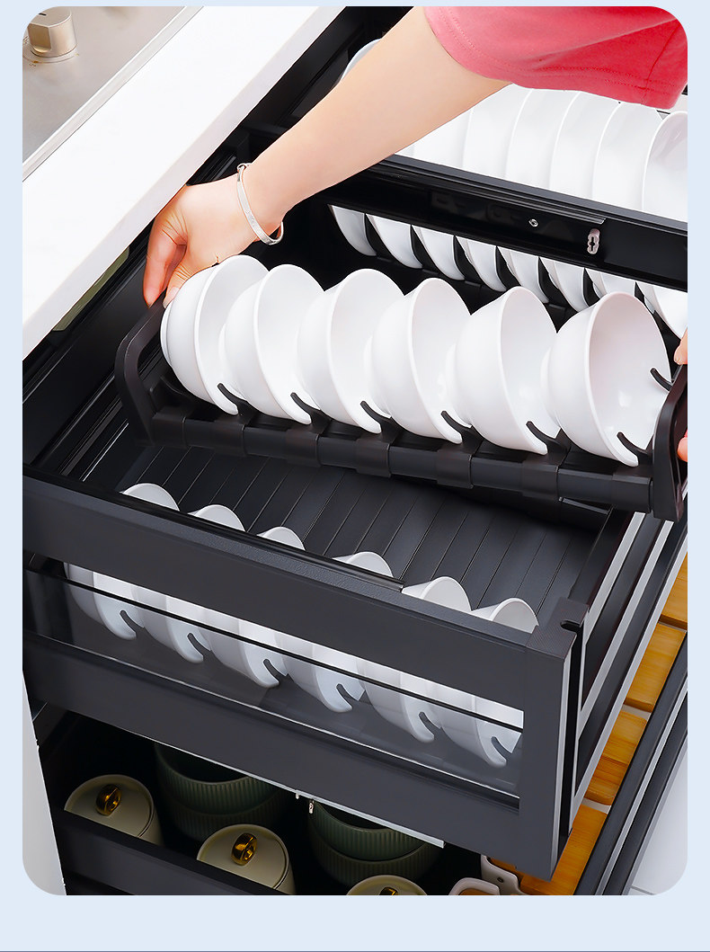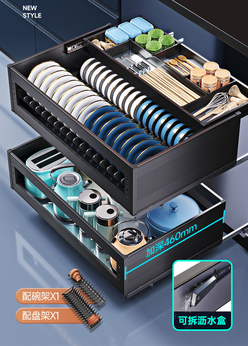 Pull-Out Kitchen Cabinet Double-Layer Drawer-Type Bowl Basket, Bowl Rack for Storing Bowls and Chopsticks, Kitchen Cabinet Storage, Built-In Bowl and Dish Deep Cabinet