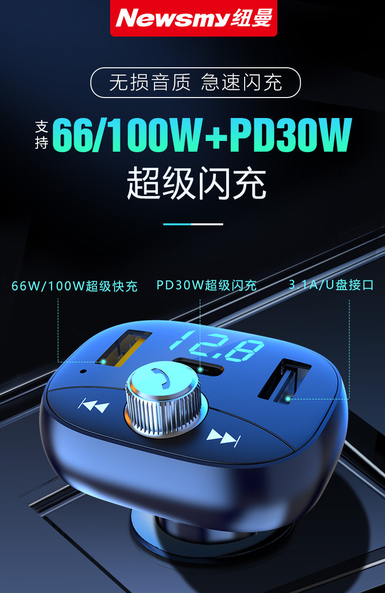 Newman Car Bluetooth Receiver Mp3 Player Lossless Sound Quality Cigarette Lighter Charger Super Pd Fast Charging
