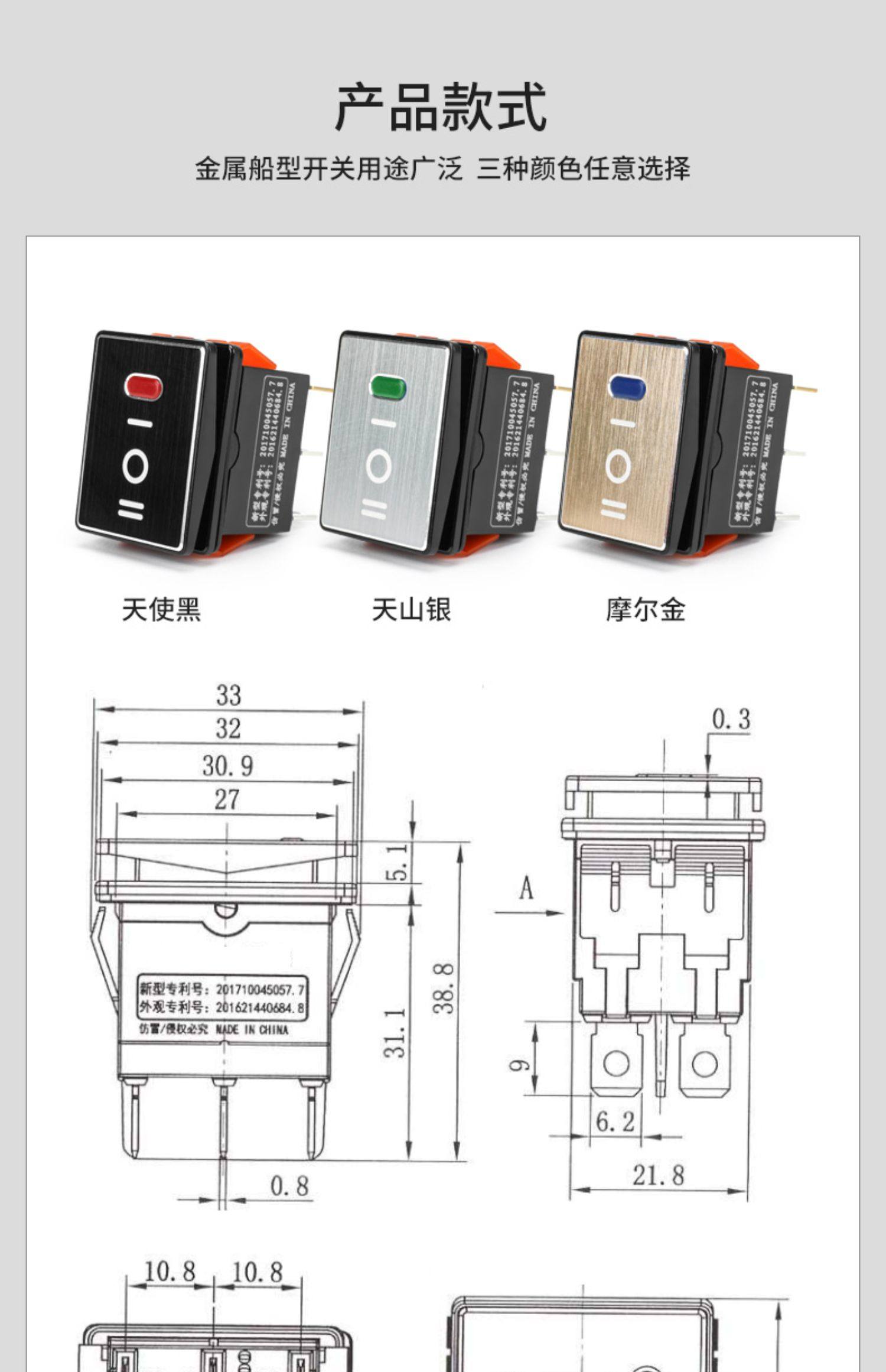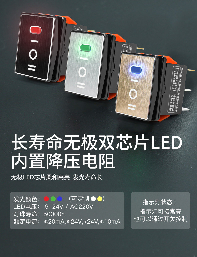 | Color Classification | Three-Position Boat Switch Kcd4--Gold Metal Panel-Red Light Dc9-24V,Three-Position Boat Switch Kcd4--Gold Metal Panel-Green Light Dc9-24V,Three-Position Boat Switch Kcd4--Gold Metal Panel-Blue Light Dc9-24V,Three-Position Boat Switch Kcd4--Gold Metal Panel-Red Light Ac220V,Three-Position Boat Switch Kcd4--Gold Metal Panel-Green Light Ac220V,Three-Position Boat Switch Kcd4--Gold Metal Panel-Blue Light Ac220V,Three-Position Boat Switch Kcd4--Black Metal Panel-Red Light Dc9-24V,Three-Position Boat Switch Kcd4--Black Metal Panel-Green Light Dc9-24V,Three-Position Boat Switch Kcd4--Black Metal Panel-Blue Light Dc9-24V,Three-Position Boat Switch Kcd4--Black Metal Panel-Red Light Ac220V,Three-Position Boat Switch Kcd4--Black Metal Panel-Green Light Ac220V,Three-Position Boat Switch Kcd4--Black Metal Panel-Blue Light Ac220V,Three-Position Boat Switch Kcd4--Silver Metal Panel-Red Light Dc9-24V,Three-Position Boat Switch Kcd4--Silver Metal Panel-Green Light Dc9-24V,Three-Position Boat Switch Kcd4--Silver Metal Panel-Blue Light Dc9-24V,Three-Position Boat Switch Kcd4--Silver Metal Panel-Red Light Ac220V,Three-Position Boat Switch Kcd4--Silver Metal Panel-Green Light Ac220V,Three-Position Boat Switch Kcd4--Silver Metal Panel-Blue Light Ac220V |