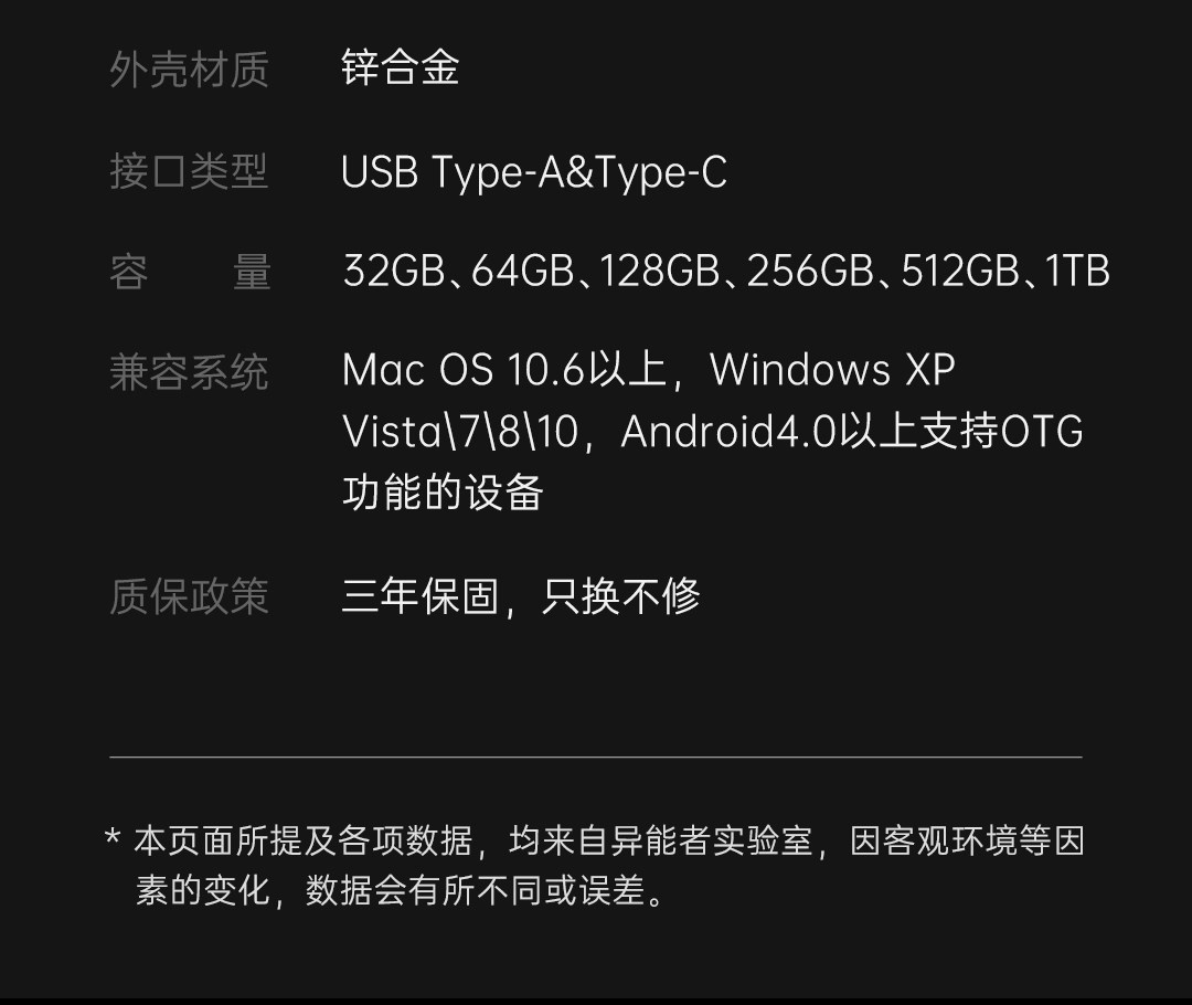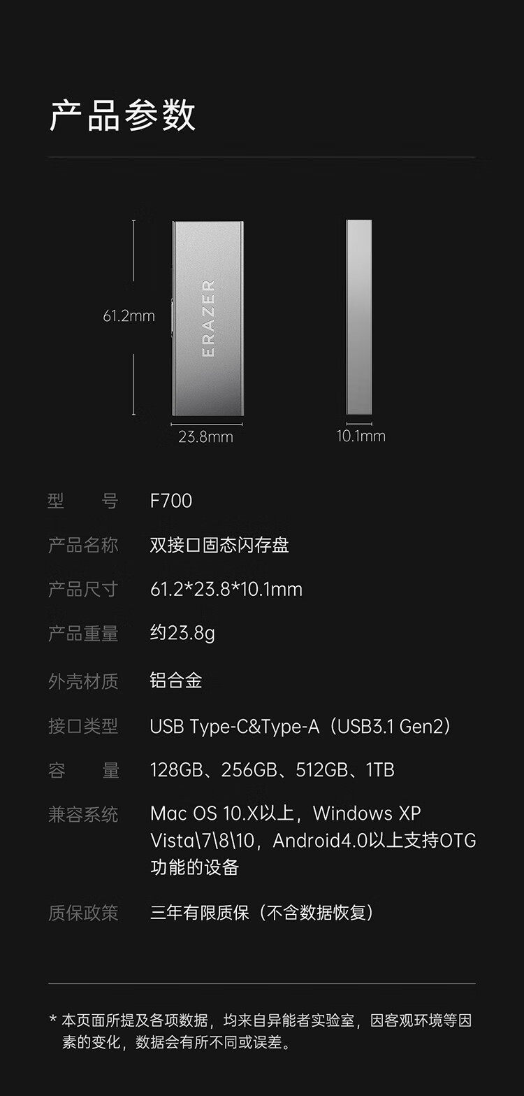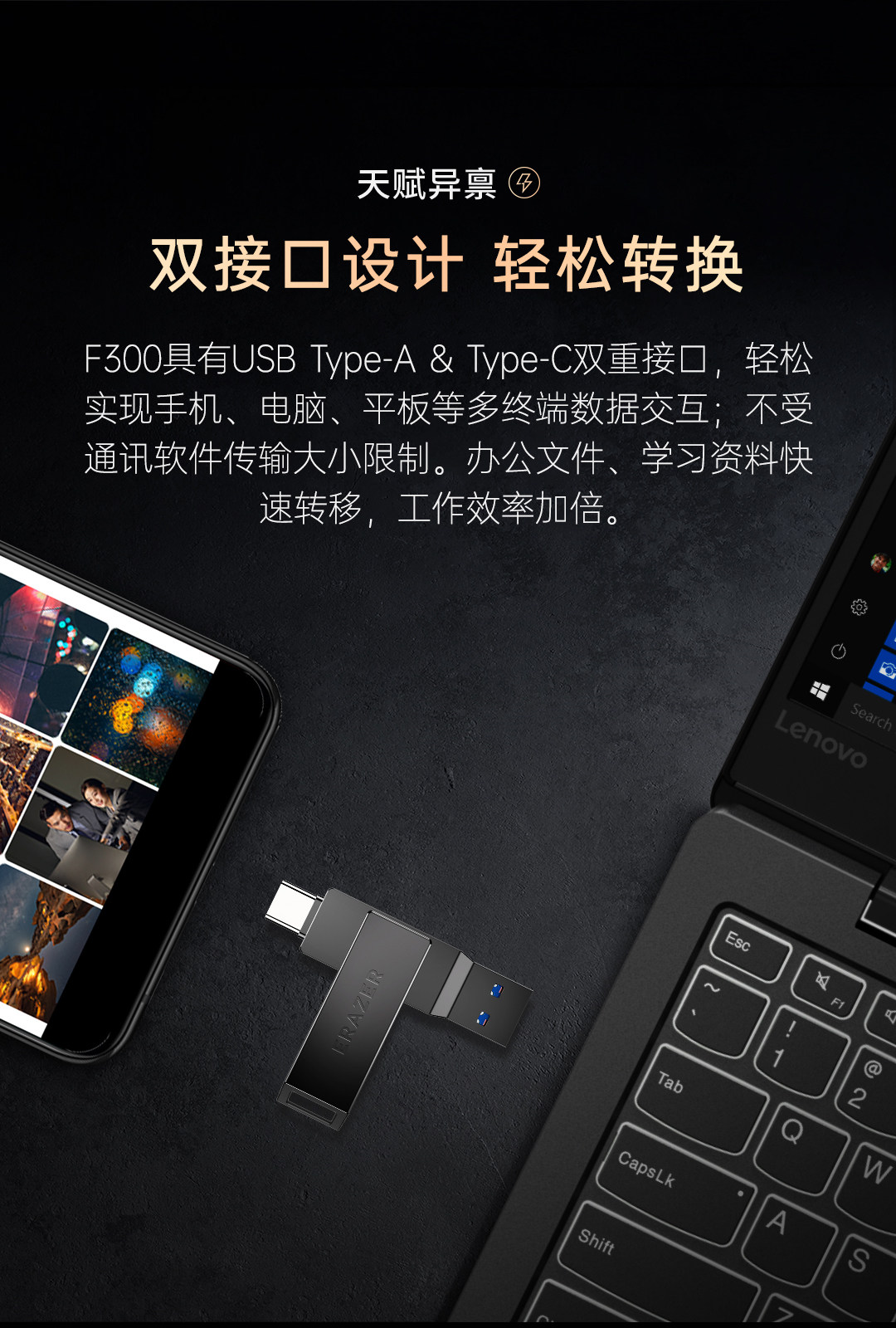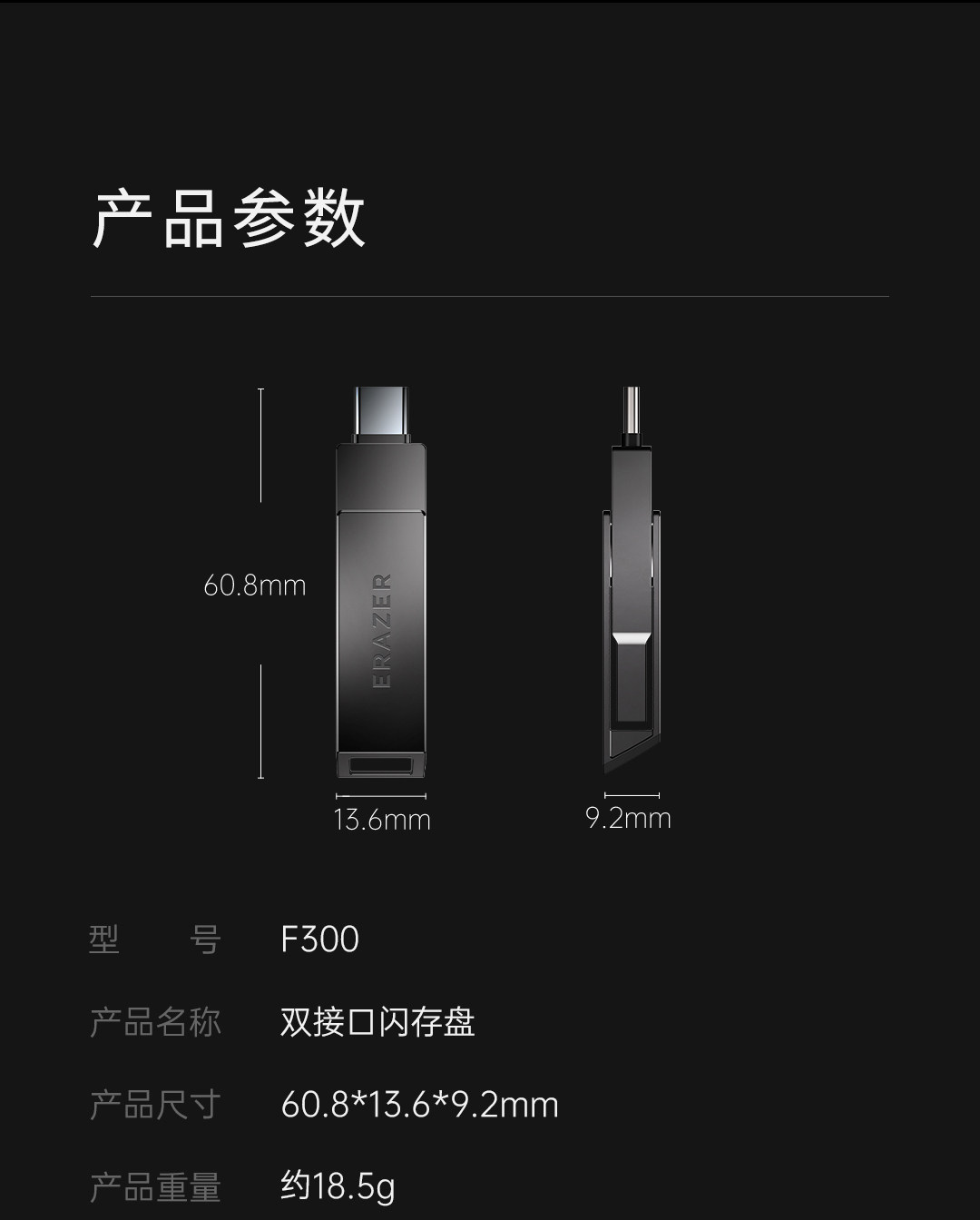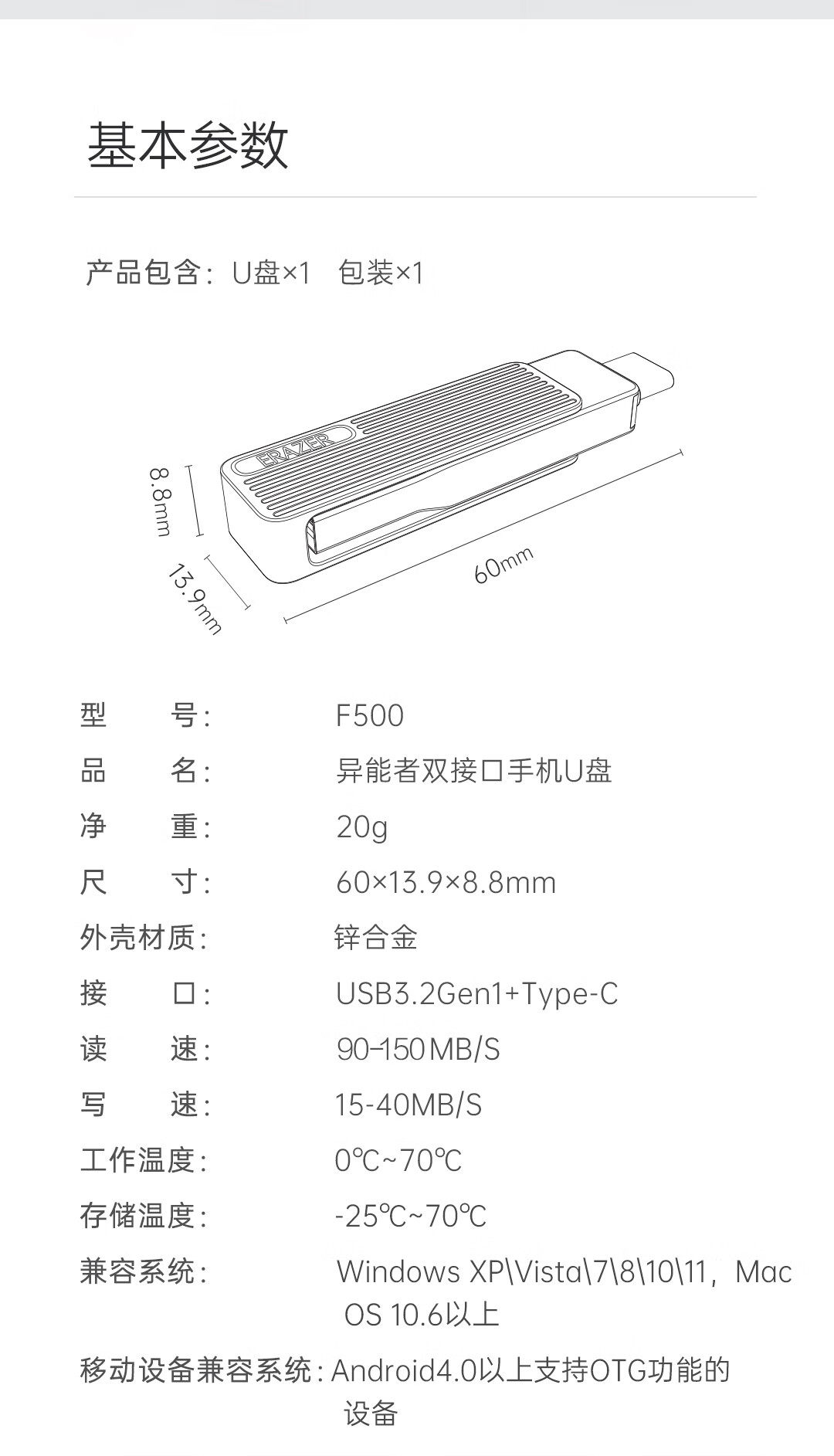 | Color Classification | Single Interface Standard USB Flash Drive [Usb2.0] F100,Single Interface High-Speed U Disk [Usb3.0] F100,Single Interface High-Speed U Disk [Usb3.2] F102,Dual Interface Gun Color [Reading Speed up to 150Mb/S] F300,Dual Interface Gun Color [Reading Speed up to 150Mb/S] F502,F503 Dual Interface Gun Color [Reading Speed up to 130Mb/S],Dual Interface Gun Color [Reading Speed up to 230Mb/S] F502 Max,Dual Interface Silver [Reading Speed up to 510Mb/S] Rotary F500 Pro,Dual Interface Gun Color [Reading Speed up to 540Mb/S] Two-Stage F601,Dual Interface Gun Color [Reading Speed up to 1000Mb/S] Two-Stage F801 |