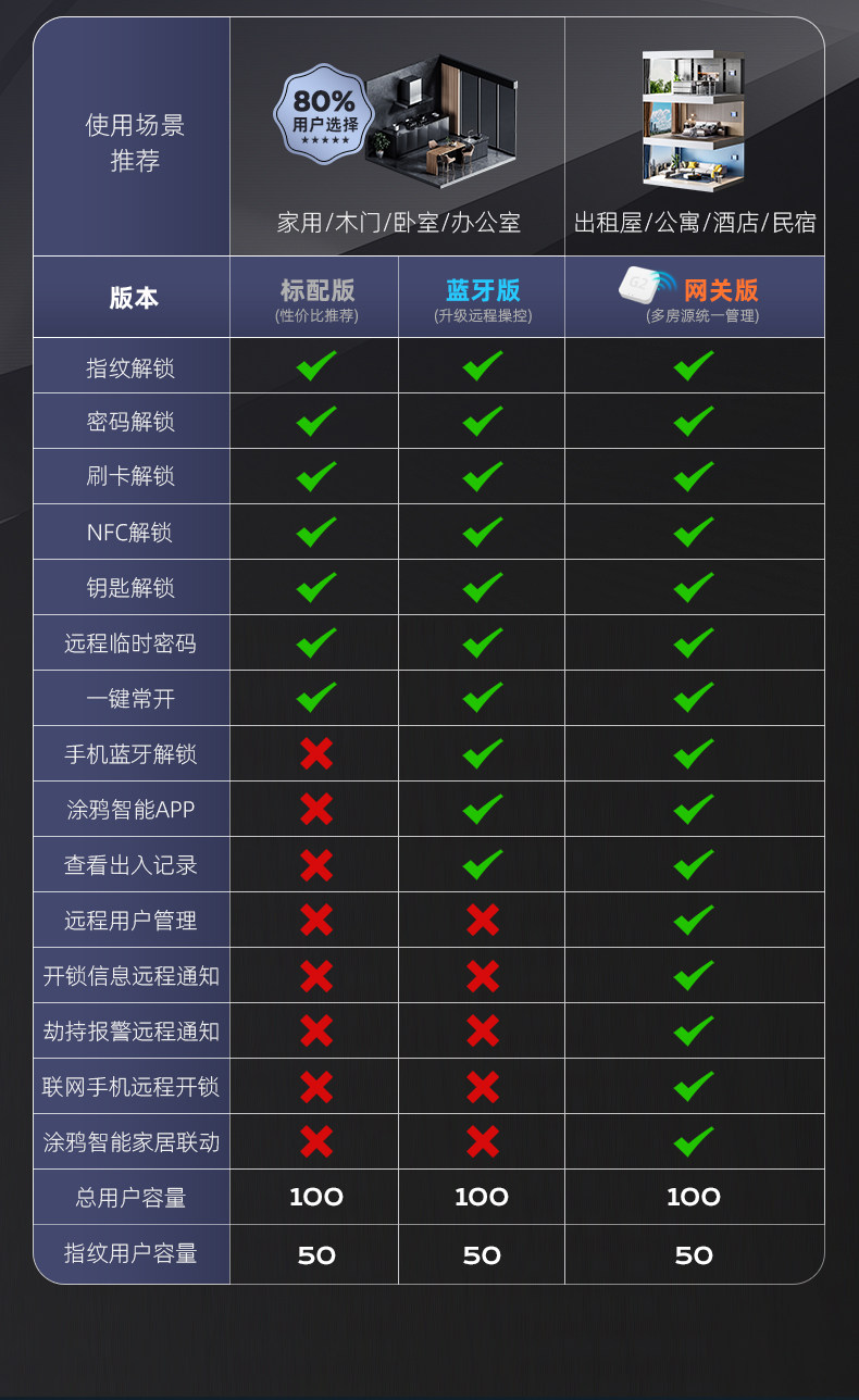 | Finish Color | [↓↓25-Year New Upgrade: Double-Row Button System + with Card Swipe + Remote Temporary Password↓↓],[Upgraded Double Row Buttons]Single Tongue - Standard Edition - Black,[Upgraded Double Row Buttons]Single Tongue - Standard Edition - Gray,[Upgraded Double Row Buttons]Split Style + Standard Edition + Black,[Upgraded Double Row Buttons]Split Style - Standard Edition - Gray,[Upgraded Double Row Buttons]All-In-One Model + Standard Edition + Black,[Upgraded Double Row Buttons]All-In-One - Standard Edition - Gray,[↓↓↓↓Bluetooth Version with App Is Better to Use↓↓↓↓],[Tuya Smart System]Single Tongue Style + Bluetooth Version + Black,[Tuya Smart System]Single Tongue - Bluetooth Version - Gray,[Tuya Smart System]Split Style - Bluetooth Version - Black,[Tuya Smart System]Split Style - Bluetooth Version - Gray,[Tuya Smart System]All-In-One - Bluetooth Version - Black,[Tuya Smart System]All-In-One - Bluetooth Version - Gray,[↓↓↓↓The Gateway Version Is More Convenient for Network Management↓↓↓↓],[Networked Remote Control System]Single Tongue - Gateway Version - Black,[Networked Remote Control System]Single Tongue - Gateway Version - Gray,[Networked Remote Control]Split Model - Gateway Version - Black,[Networked Remote Control]Split Model - Gateway Version - Gray,[Networked Remote Control]All-In-One - Gateway Edition - Black,[Networked Remote Control]All-In-One - Gateway Edition - Gray,(Single Fingerprint Version) Single Tongue Model - Obsidian Black,(Single Fingerprint Version) Split Version-Obsidian Black,(Single Fingerprint Version) All-In-One Model - Obsidian Black |