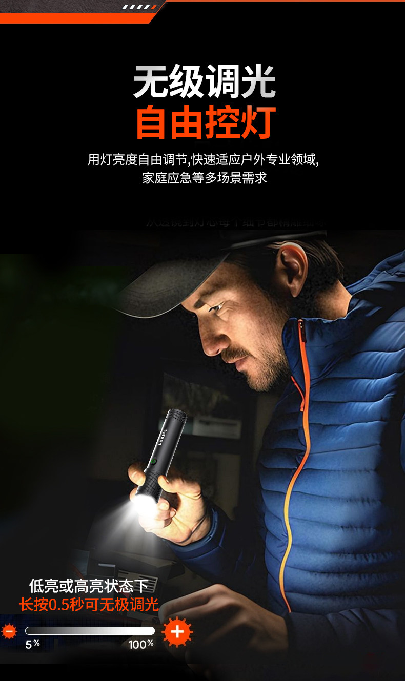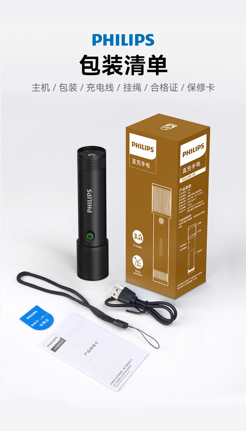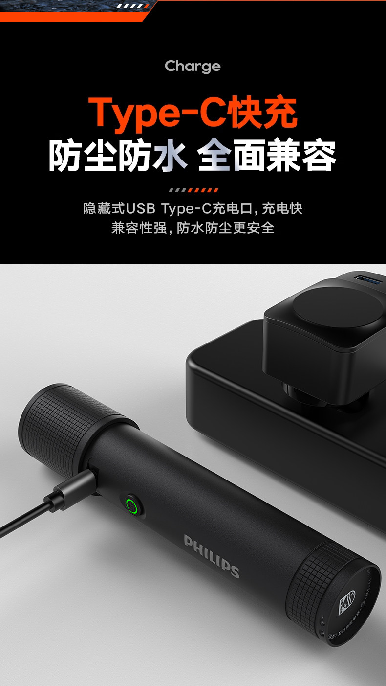 Philips Flashlight Strong Light Rechargeable Flashlight Ultra-Bright Long-Range Portable Home Outdoor Emergency Lighting Self-Defense Flashlight
