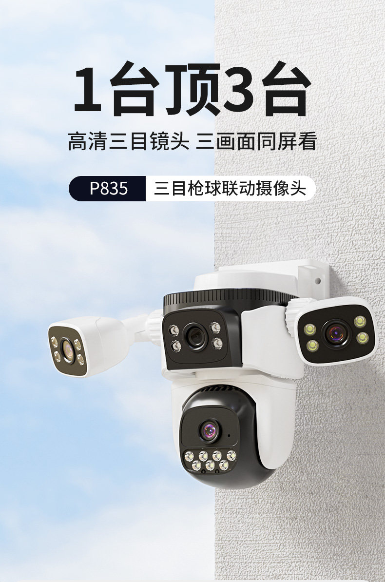 Wireless Wifi Three-Screen Camera for Home Use, Remote 360-Degree No-Dead-Angle 4g Monitor, Outdoor High-Definition