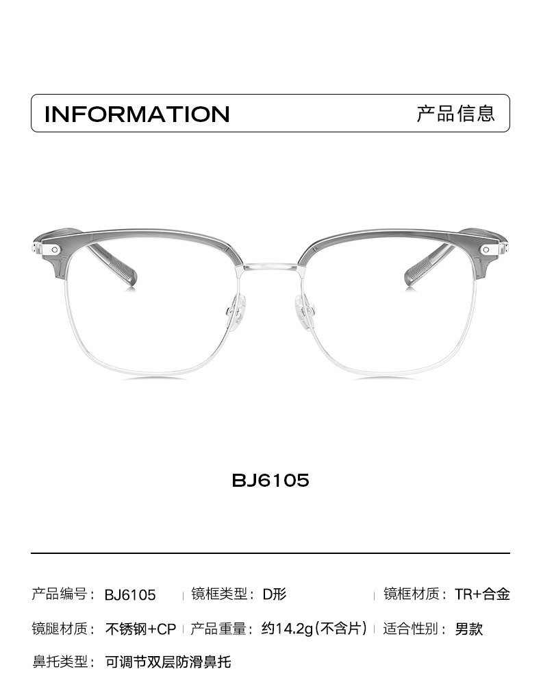 | Color Classification | ↓↓↓ Scroll down for Details and Coupons to Enjoy Additional Discounts ↓↓↓,[Tr+ Alloy] Bj6105B16 Silver/Transparent Gray Frame (Unisex),Lin Tong Style [Tr + Titanium Alloy] Ba6001B16 Silver / Light Grey Frame (Unisex),[Titanium Alloy] Ba7009B15 Silver/Upper Eyebrow Semi-Gloss Matte Black Frame,[Tr+ Alloy] Bj6105B15 Silver/Upper Eyebrow Bright Black Frame (Same Style for Men and Women),[Tr+ Alloy] Bj6105B10 Deep Gunmetal/High Brow Gloss Black Frame,[Tr+ Alloy] Bj6105B12 Gold/Upper Brow Glossy Black Frame,[Tr+ Alloy] Bj6105B90 Silver/Transparent Frame with Raised Brow Bridge,Upgraded Model [Tr+Alloy] Bj6182B16 Silver/Transparent Gray Frame Above Eyebrows (Same Style for Men and Women),Upgraded Model [Tr+Alloy] Bj6182B15 Silver/Upper Eyebrow Bright Black Frame (Same Style for Men and Women),[Tr+Titanium Alloy] Ba6001B15 Silver/Upper Eyebrow Bright Black Frame,[Tr+Titanium Alloy] Ba6001B10 Deep Gun/Upper Eyebrow Bright Black Frame,[Titanium Alloy] Ba7009B11 Dark Gun Color/Upper Eyebrow Semi-Glossy Matte Black Frame,[Titanium Alloy] Ba7009B70 Light Gunmetal/Upper Eyebrow Matte Dark Blue Frame,[Tr+ Alloy / Runs Large] Bj6205B16 Silver / Gradient Grey Frame,[Tr+ Alloy / Runs Large] Bj6205B15 Silver / Gloss Black Frame Above the Brows,[Tr+ Alloy / Runs Large] Bj6205B10 Deep Gunmetal / Gloss Black Frame,[Tr+ Alloy / Runs Large] Bj6205B26 Silver / Transparent Cold Tea Grey Frame (Upper Brow),[Parameters of Each Model] Please Scroll down for Detailed Parameters |