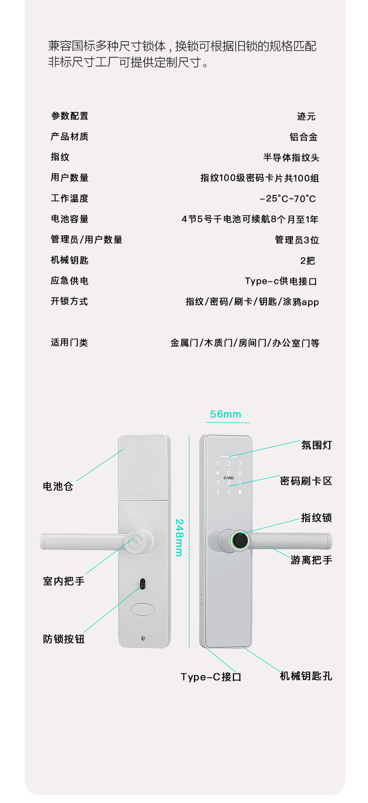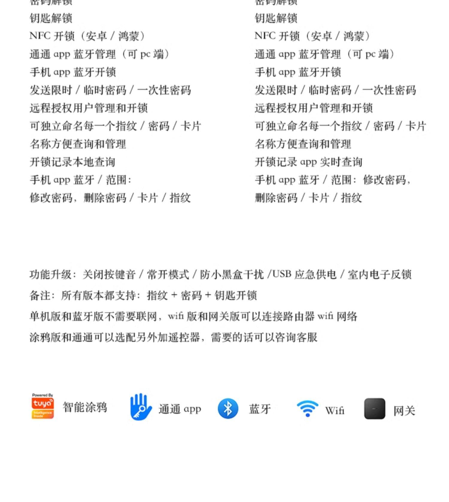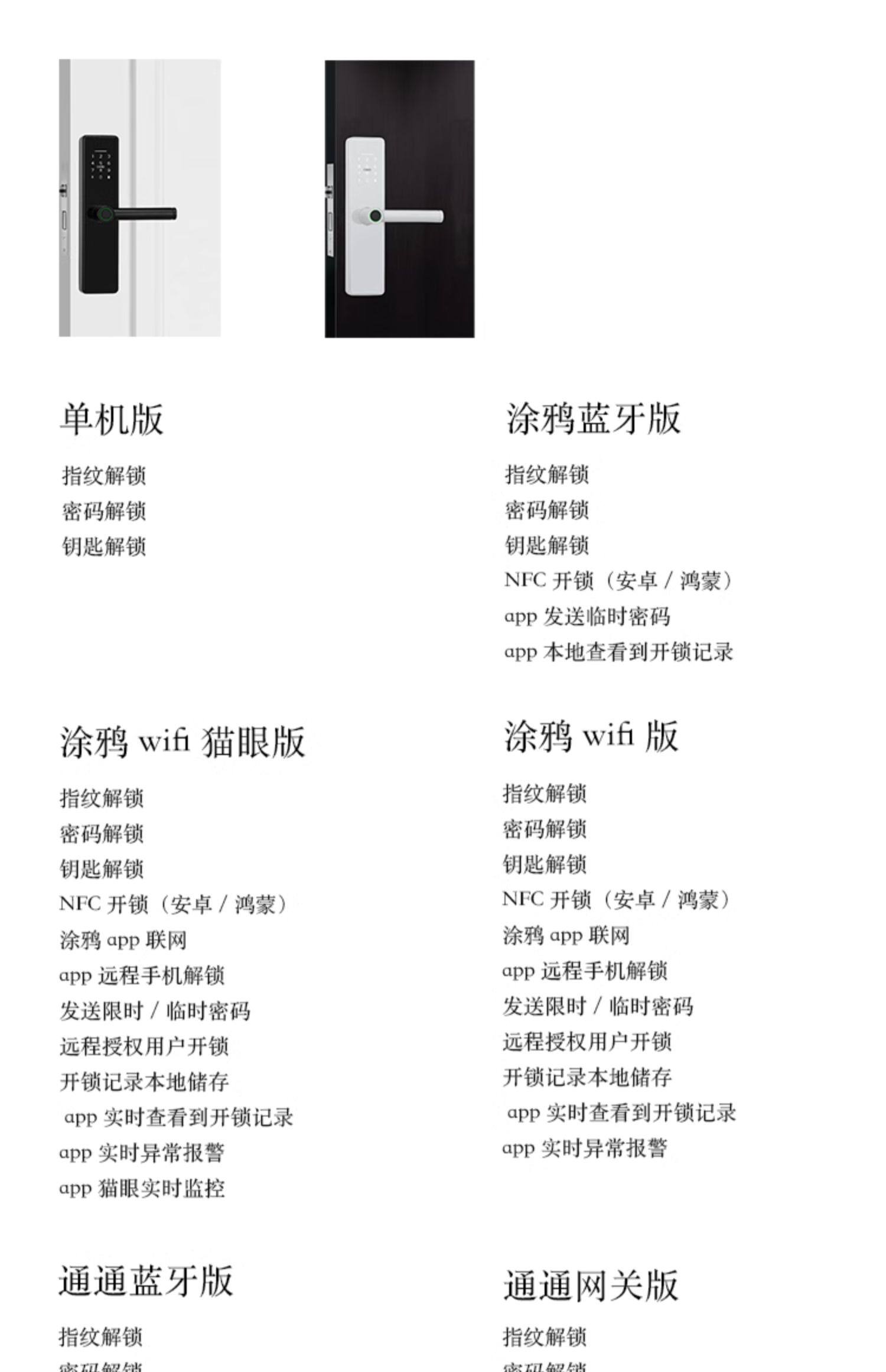 | Finish Color | White [Graffiti Bluetooth Version] + Installation Guide,Black [Graffiti Bluetooth Version] + Installation Guide,White [Graffiti Wifi Version] + Installation Guide,Black [Graffiti Wifi Version] + Installation Guide,White [Graffiti Wifi Peephole Camera] + Installation Guide,Black [Graffiti Wifi Peephole] + Installation Guide,White [Tongtong Bluetooth Version] + Installation Guidance,Black [Tongtong Bluetooth Version] + Installation Guidance,White [Stand-Alone Version] + Installation Guidance,Black [Stand-Alone Version] + Installation Guidance,Double Door Fake Lock/Decorative Lock |