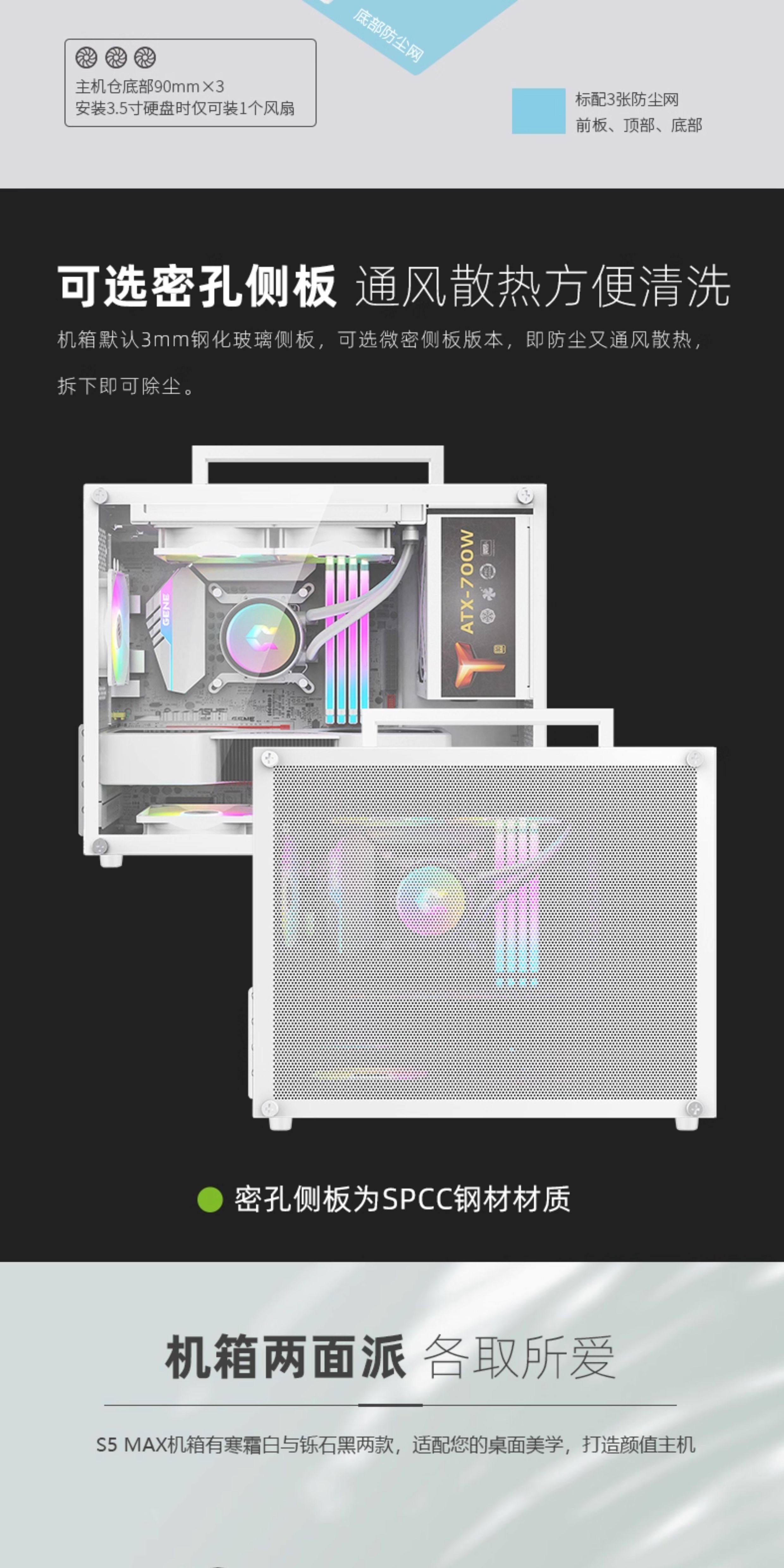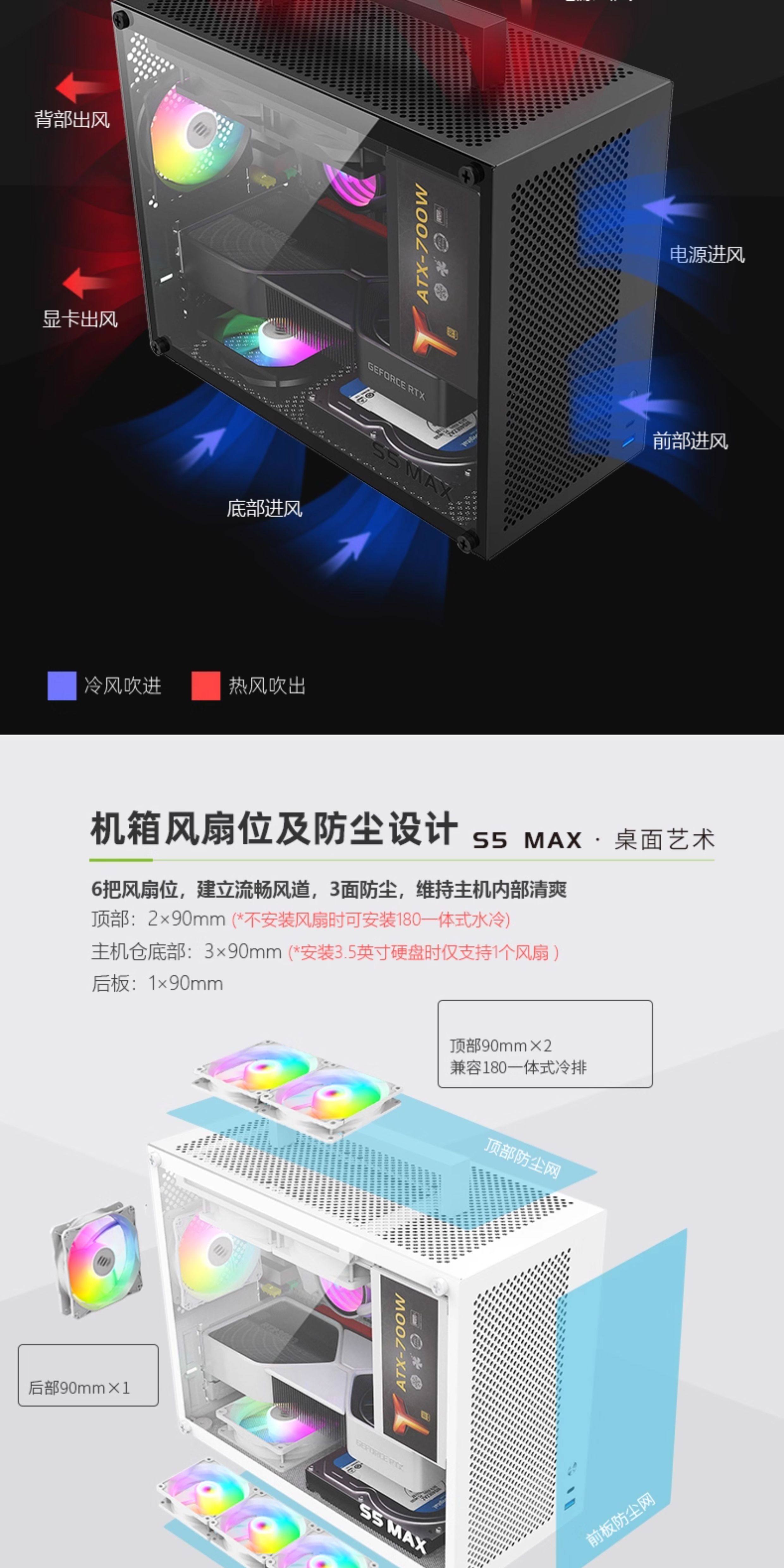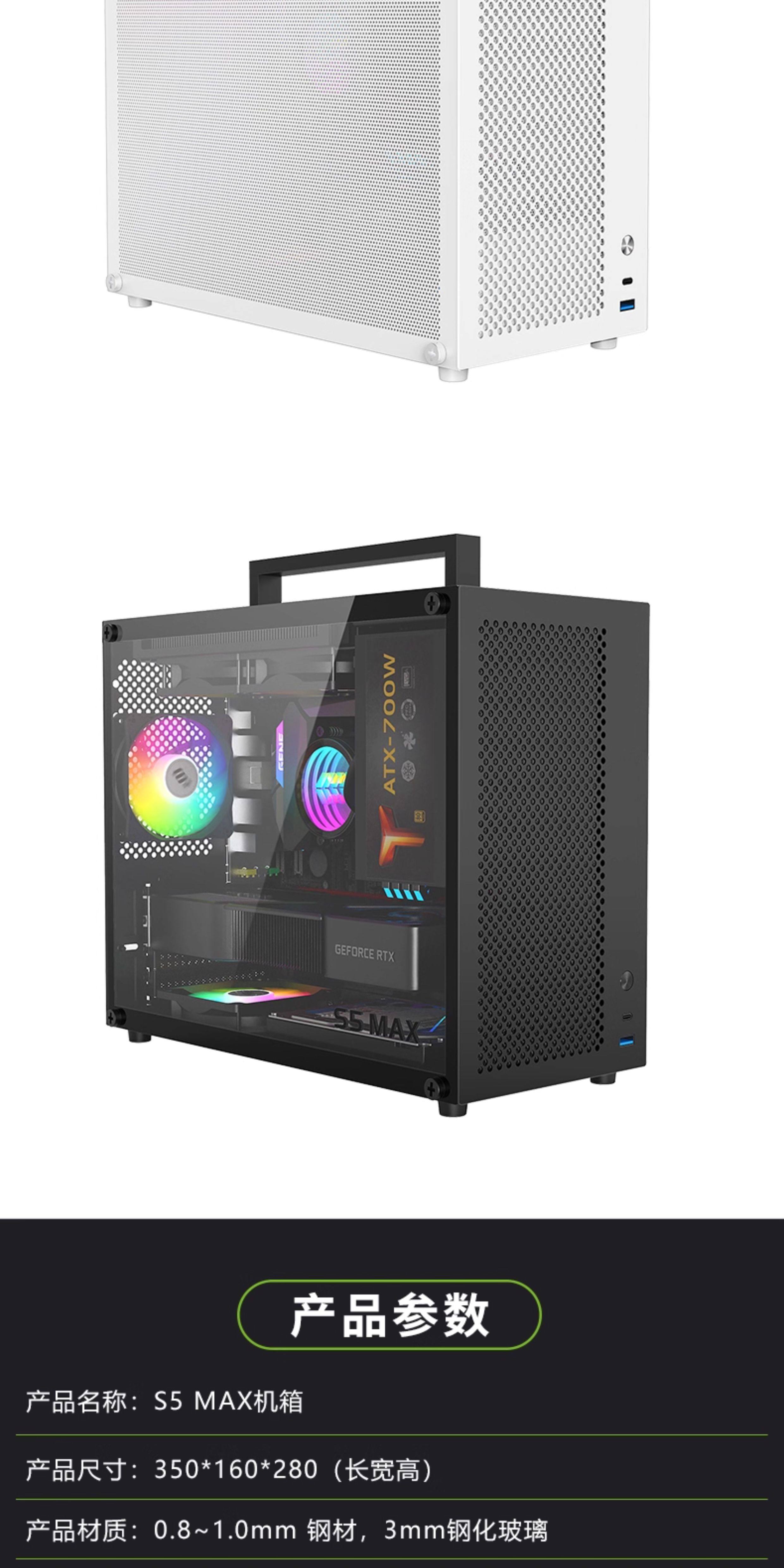 | Color Classification | S5-Max Black Stand-Alone Chassis,S5-Max White Single Case,S5-Max White Chassis + 3 White Light Fans,S5-Max White Chassis + 3 Argb Fans,S5-Max White Chassis + 6 White Light Fans,S5-Max White Chassis + 6 Argb Fans,S5-Max White Chassis + Z135 White Light Radiator + 6 White Light Fans,S5-Max White Chassis + Z135 Argb Radiator + 6 Argb Fans,S5-Max White Chassis + Fish Nest 180 Water Cooling Radiator,S5-Max White Chassis + 500W White Label Power Supply,S5-Max White Chassis + 600W Silver Power Supply,S5-Max White Chassis + 700W Silver Module Power Supply,S5-Max Black Chassis + 3 White Light Fans,S5-Max Black Chassis + 6 White Light Fans,S5-Max Black Chassis + 3 Argb Fans,S5-Max Black Chassis + 6 Argb Fans,S5-Max Black Chassis + Z135 White Light Radiator + 6 White Light Fans,S5-Max Black Chassis + Z135 Argb Radiator + 6 Argb Fans,S5-Max Black Chassis + Fish Nest 180 Water Cooling Radiator,S5-Max Black Chassis + 600W Silver Power Supply,S5-Max Black Chassis + 700W Silver Module Power Supply |
