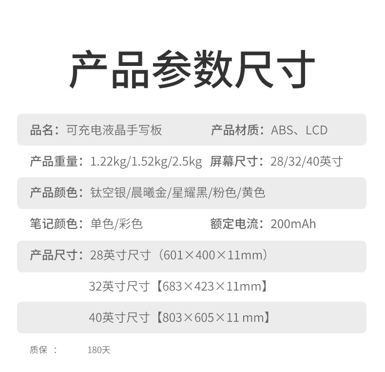 | Color Classification | 28inch Eye-Protecting Yellow Color Screen [Double-Sided] + 2 Magnetic Pens + Charging Cable,28inch Eye Protection Pink Color Screen [Double-Sided] + 2 Magnetic Pens + Charging Cable,28inch Yellow Highlight Monochrome [Double-Sided] + 2 Magnetic Pens + Charging Cable,28inch Pink Highlight Monochrome [Double-Sided] + 2 Magnetic Pens + Charging Cable,32inch Eye-Protecting Yellow Color Screen [Double-Sided] + 2 Magnetic Pens + Charging Cable,32inch Eye Protection Pink Color Screen [Double-Sided] + 2 Magnetic Pens + Charging Cable,40inch Titanium Silver Monochrome [Double-Sided Eye Protection Highlight] + Free Double Hooks + 2 Pens,40inch Yellow Monochrome [Double-Sided Eye Protection Highlight Model] + Free Double Hooks + 2 Pens,40inch Star Black Monochrome [Double-Sided Eye Protection Highlight Model] + Free Double Hooks + 2 Pens,40inch Yellow Color Screen [Double-Sided Eye Protection Highlight Model] + Free Double Hooks + 2 Pens,40inch Pastel Screen [Double-Sided Eye Protection Highlight Model] + Free Double Hooks + 2 Pens,40inch Silver [Double-Sided Eye Protection Highlight Model] Single Color + Solid Wood Stand + Double Hooks + 2 Pens,40inch Yellow [Double-Sided Eye Protection Highlight Model] Single Color + Solid Wood Stand + Double Hooks + 2 Pens,40inch Black [Double-Sided Eye Protection Highlight Model] Single Color + Solid Wood Stand + Double Hooks + 2 Pens,40inch Yellow [Double-Sided Eye Protection Highlight Model] Color Screen + Solid Wood Stand + Double Hooks + 2 Pens,40inch Pink [Double-Sided Eye Protection and High-Brightness Model] Color Screen + Solid Wood Stand + Double Hooks + 2 Pens |