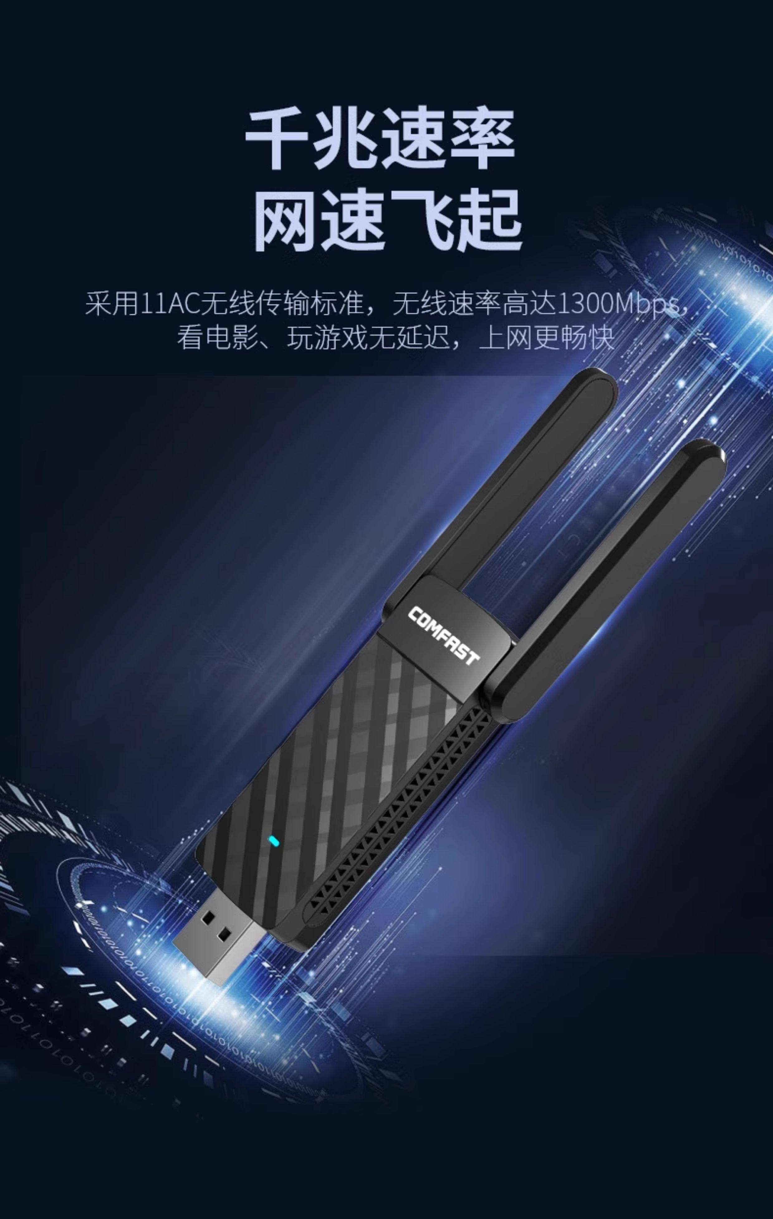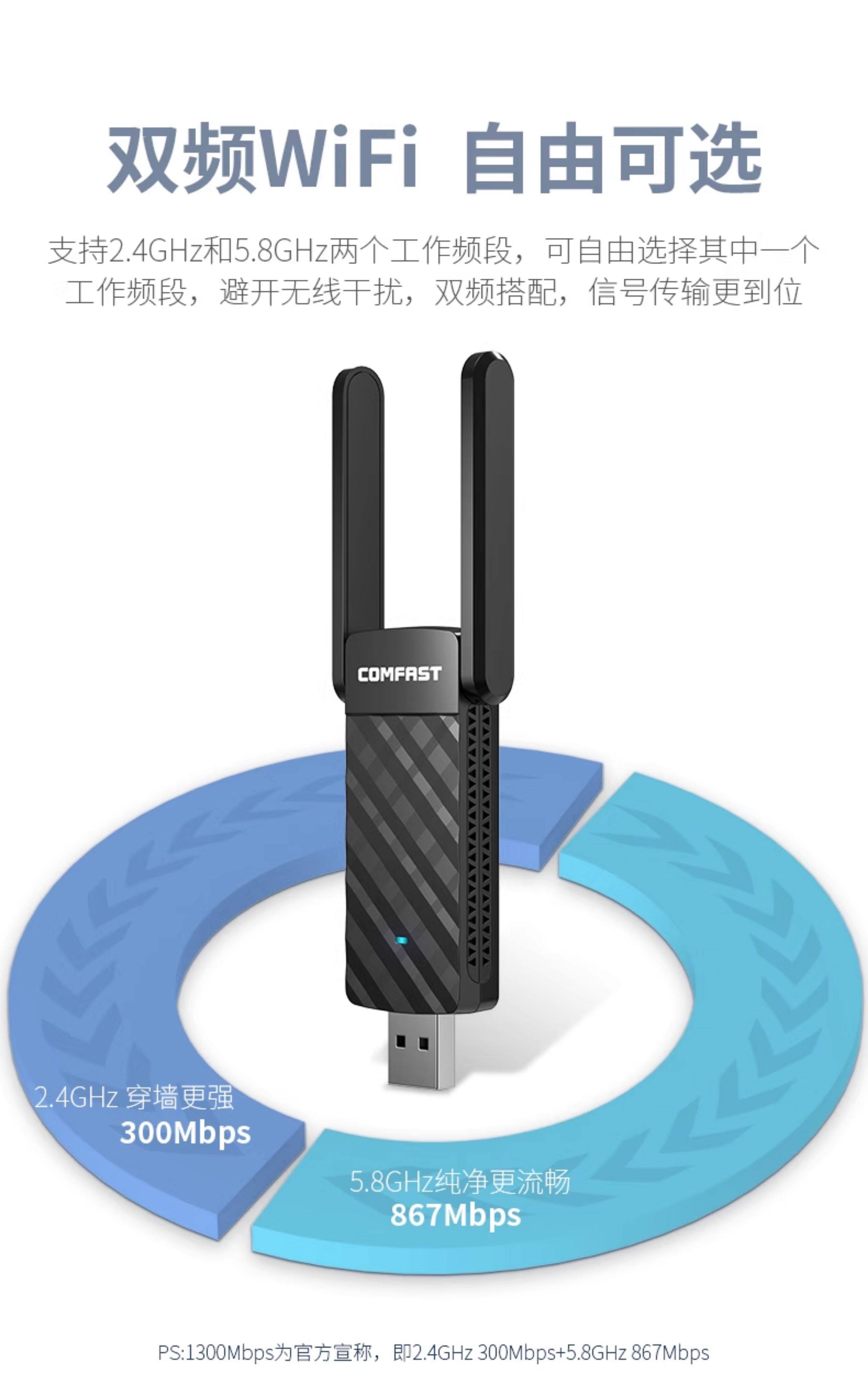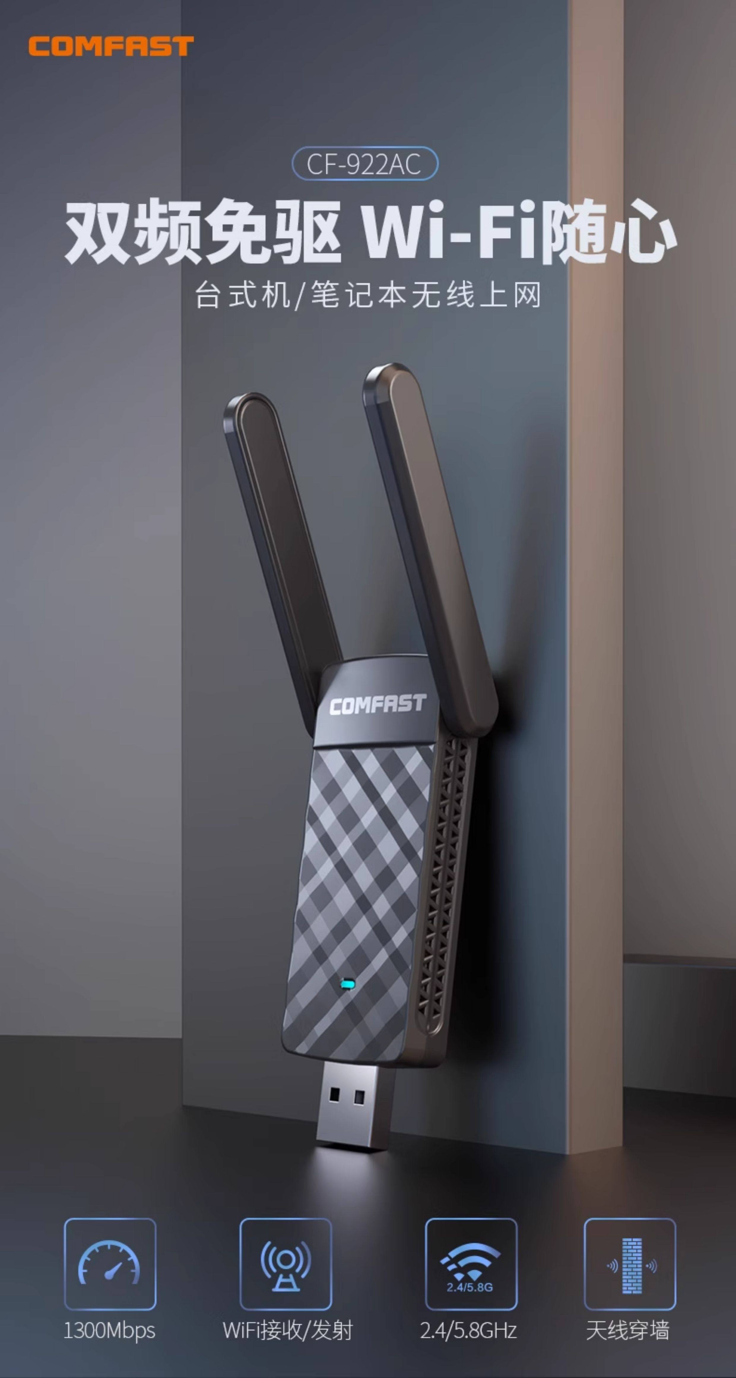 Comfast Cf-922Ac Wireless Network Card Desktop 1300m Dual-Band 5g High-Power Wall-Penetrating Wifi Receiver Notebook Gigabit USB External Wireless Network Signal Receiver