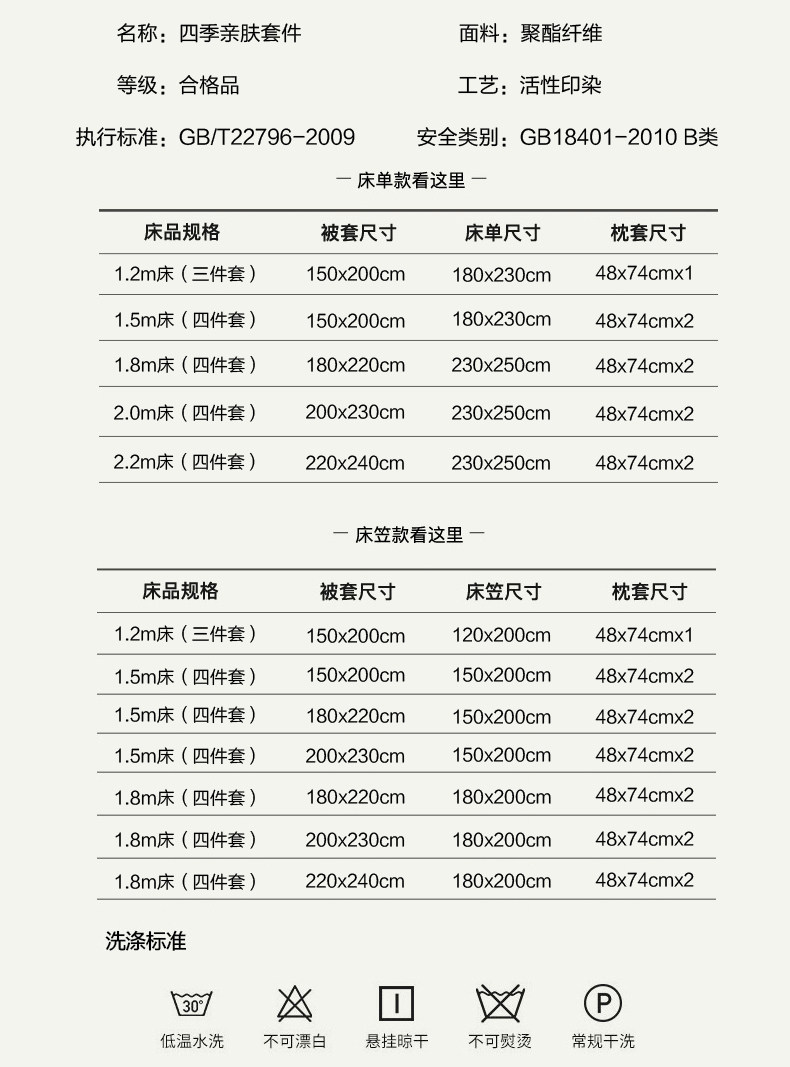 | Applicable Bed Size | Bed Sheet 1.2m Bed [Quilt Cover 150X200Cm] Three-Piece Set,Bed Sheets 1.5m Bed [Quilt Cover 150X200Cm] Four-Piece Set,Bed Sheets 1.8m Bed [Quilt Cover 180X220Cm] Four-Piece Set,Bed Sheets 2.0m Bed [Quilt Cover 200X230Cm] Four-Piece Set,Bed Sheets 2.2m Bed [Quilt Cover 220X240Cm] Four-Piece Set,Fitted Sheet 1.2m Bed [Quilt Cover 150X200Cm] Three-Piece Set,Fitted Sheet 1.5m Bed [Quilt Cover 150X200Cm] Four-Piece Set,Fitted Sheet 1.5m Bed [Quilt Cover 180X220Cm] Four-Piece Set,Fitted Sheet 1.5m Bed [Quilt Cover 200X230Cm] Four-Piece Set,Fitted Sheet 1.8m Bed [Quilt Cover 180X220Cm] Four-Piece Set,Fitted Sheet 1.8m Bed [Quilt Cover 200X230Cm] Four-Piece Set,Fitted Sheet 1.8m Bed [Quilt Cover 220X240Cm] Four-Piece Set |