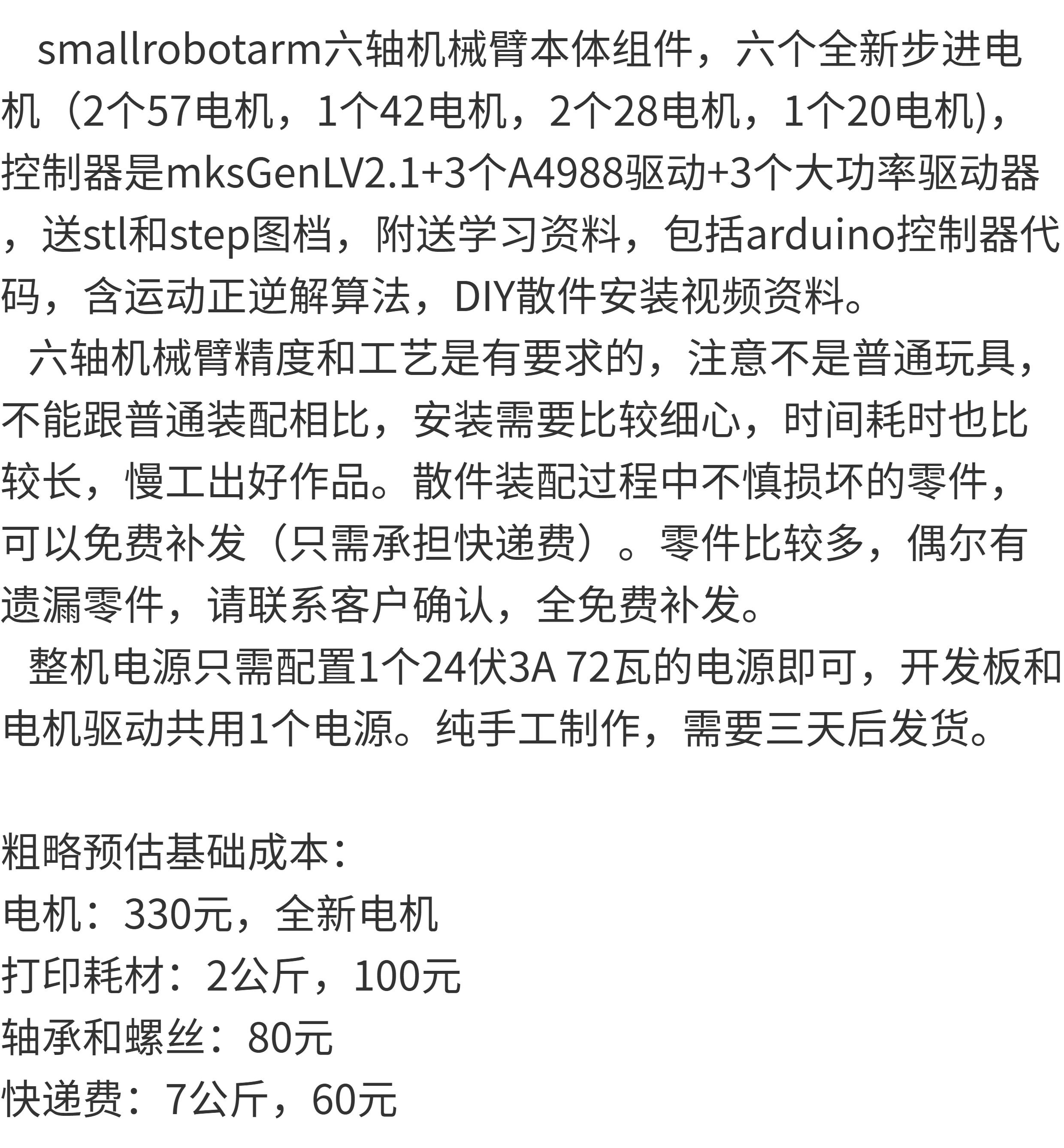 | Color Classification | ćKit AćMain Body (Printed Parts + Bearings + Screws + Three Shafts + Timing Pulley + Timing Belt), Motor Not Included,[Parts B] Main Body (Printed Parts + Bearings + Screws + Three Shafts + Synchronous Wheels + Synchronous Belts + 6 Stepper Motors),[Parts C] All-Inclusive Parts (6 Stepper Motors + All Parts) + Controller (Mks Development Board + 3 A4988 Drivers + 3 Large Drivers + Ps2 Handle + Power Supply),ćFinished Product AćComplete Controller (Mks Controller + 3 A4988 Drivers + 3 Large Drivers + Transparent Case + Ps/2 Gamepad + Power Supply),[Finished Product B] Main Body (Complete Body, Without Controller, Will Be Shipped 7 Days after Placing the Order),[Accessory 1] Power Supply 24V 3A 72W, with Plug,[Accessory 2] Movable Guide Rail (Including Aluminum Alloy Track, Belt, Roller, 42 Stepper Motor),[Accessory 3] Fine Repair Tools (5 Small Files + 1 Carving Knife),ćAccessory 4ć(if the Baidu Cloud Download Is Unavailable Due to Network Issues, You Can Opt for a Kingston 64Gb USB Drive Containing the Complete Learning Materials. Please Note That This Must Be Purchased Together with the Product.) |