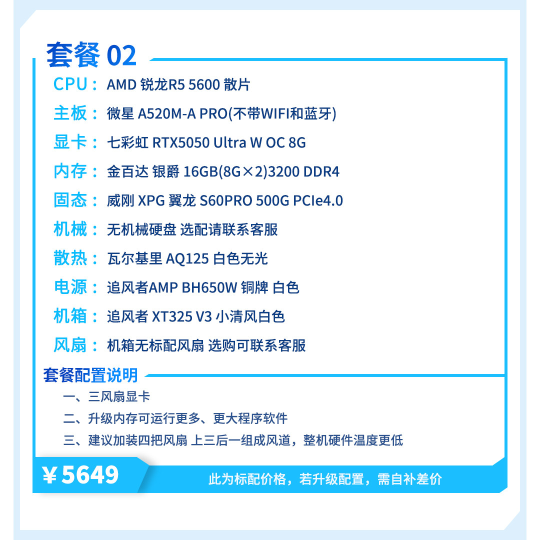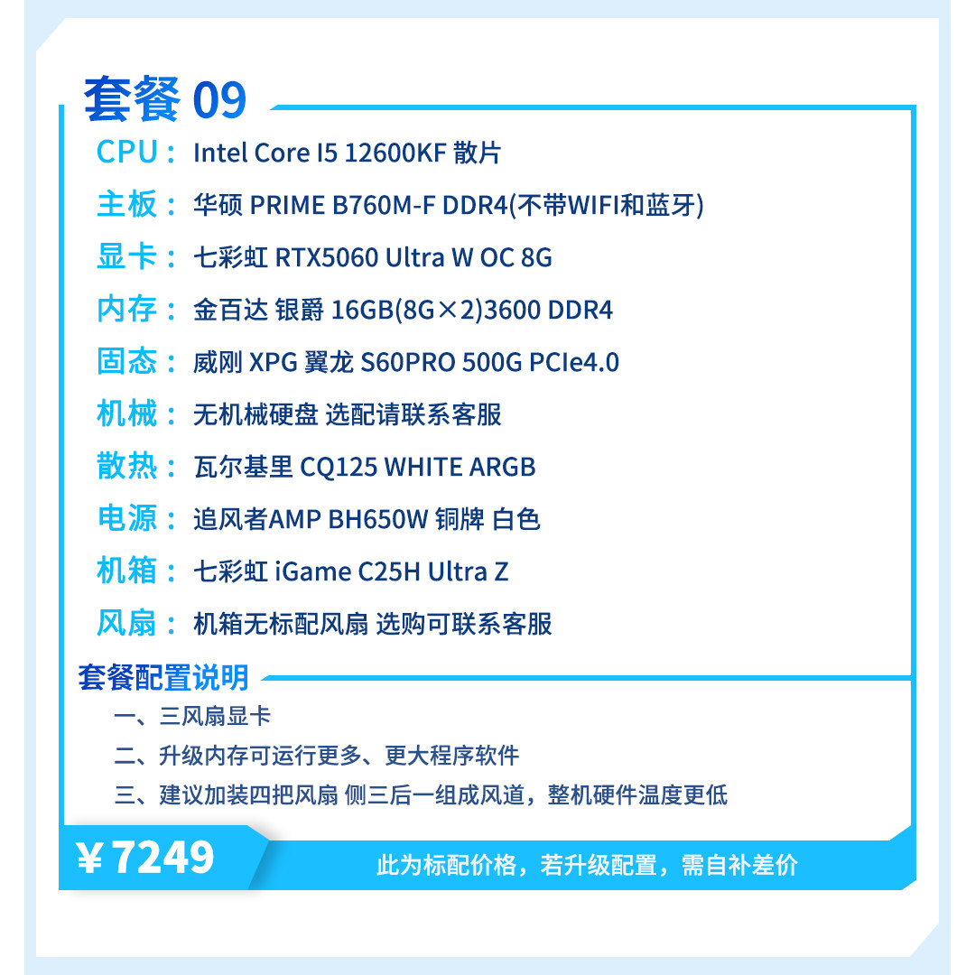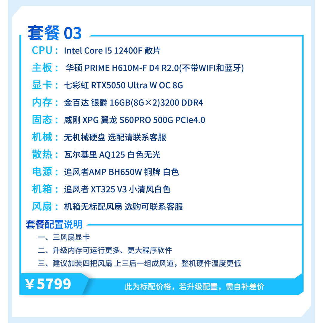 | Package Type | Package 1 (12100F+5050 Ultra),Package 2 (5600+5050 Ultra),Package Three (12400F+5050 Ultra),Package 4 (12100F+5060 Ultra),Package Five (5600+5060 Ultra),Package Six (12400F+5060 Ultra),Package 7 (5700X+5060 Ultra),Package Eight (7500F+5060 Ultra),Package Nine (12600Kf+5060 Ultra),Package Ten (9600X+5060 Ultra),Package 11 (14600Kf+5060 Ultra),Package 12 (9700X+5060 Ultra),Package Thirteen (14600Kf+5060 Ultra) |