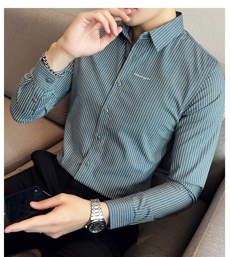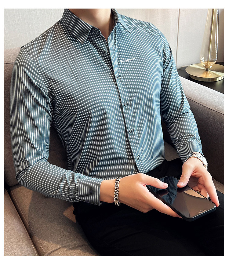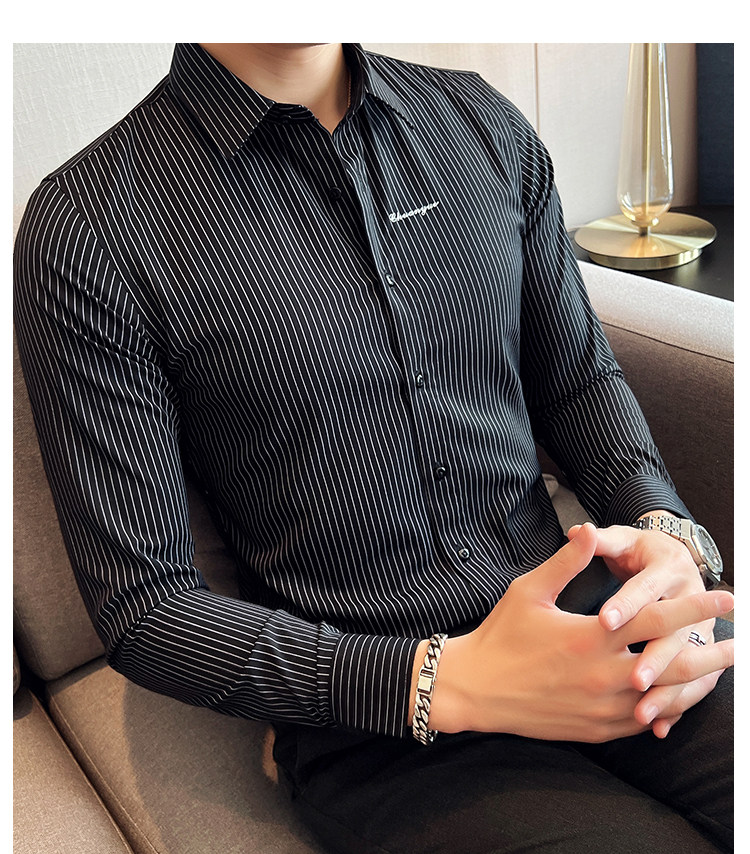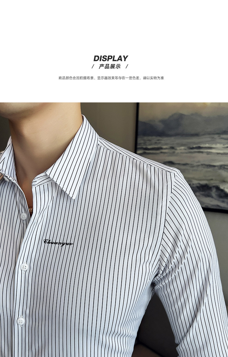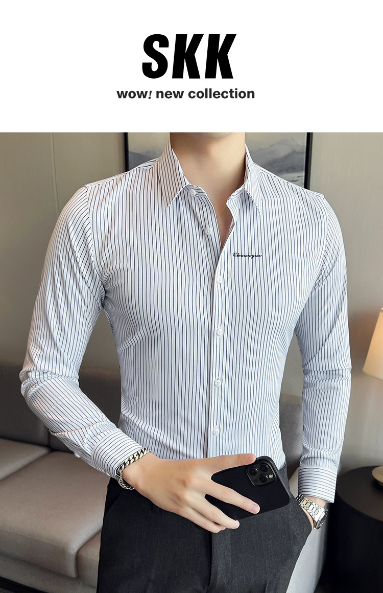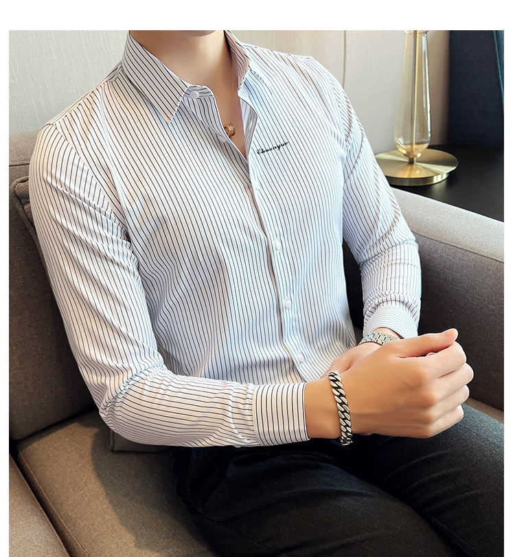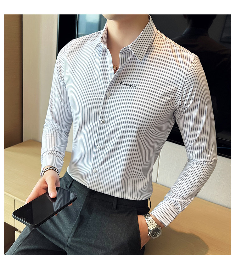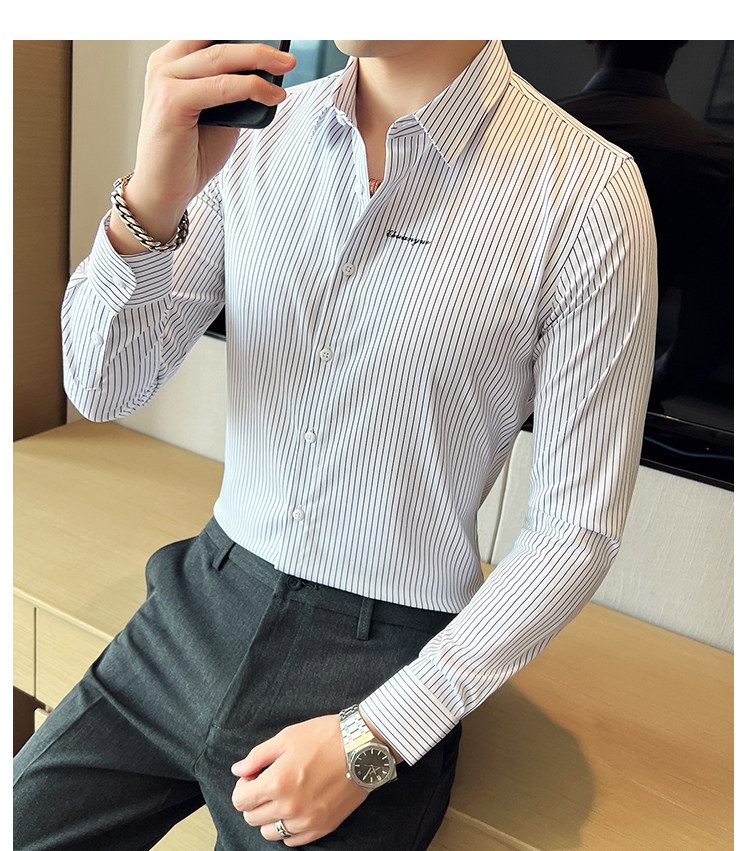 Men's Long-Sleeve Spring and Autumn White Shirt, Business Slim-Fit Professional Formal Embroidered Striped Shirt, Casual Youth Base Layer Trendy