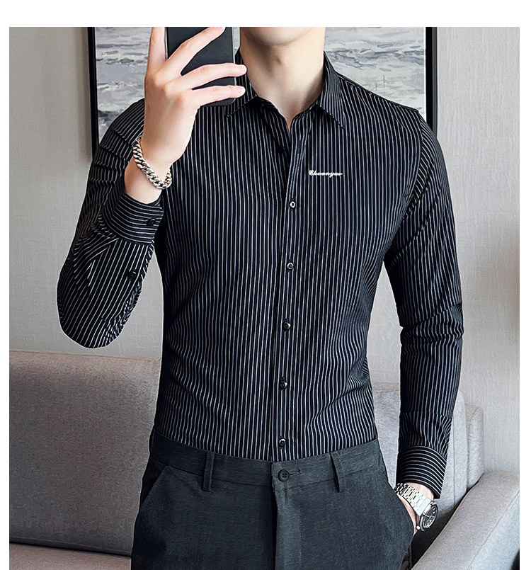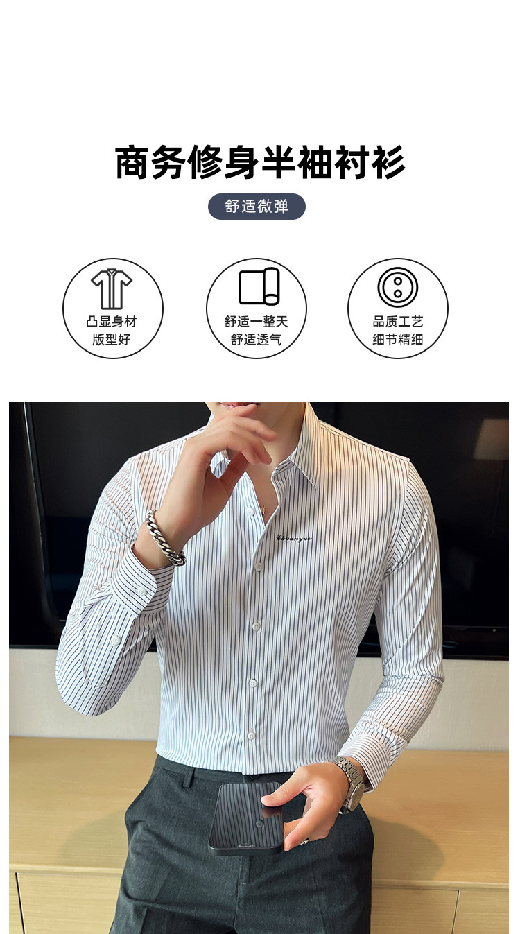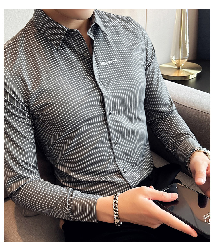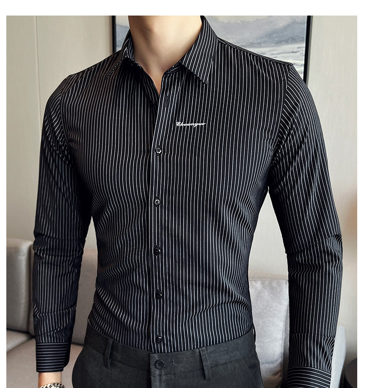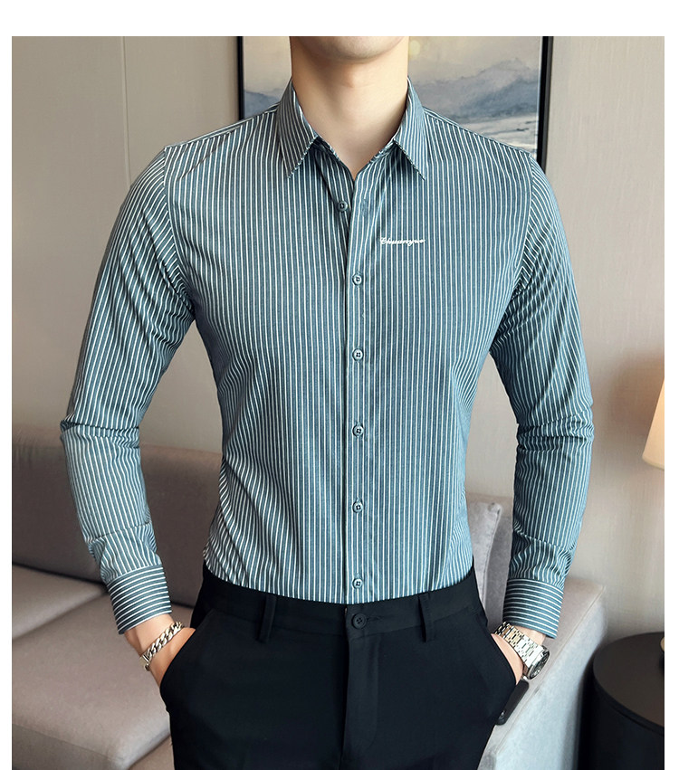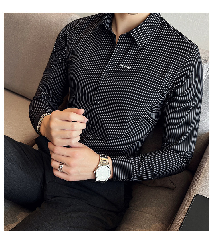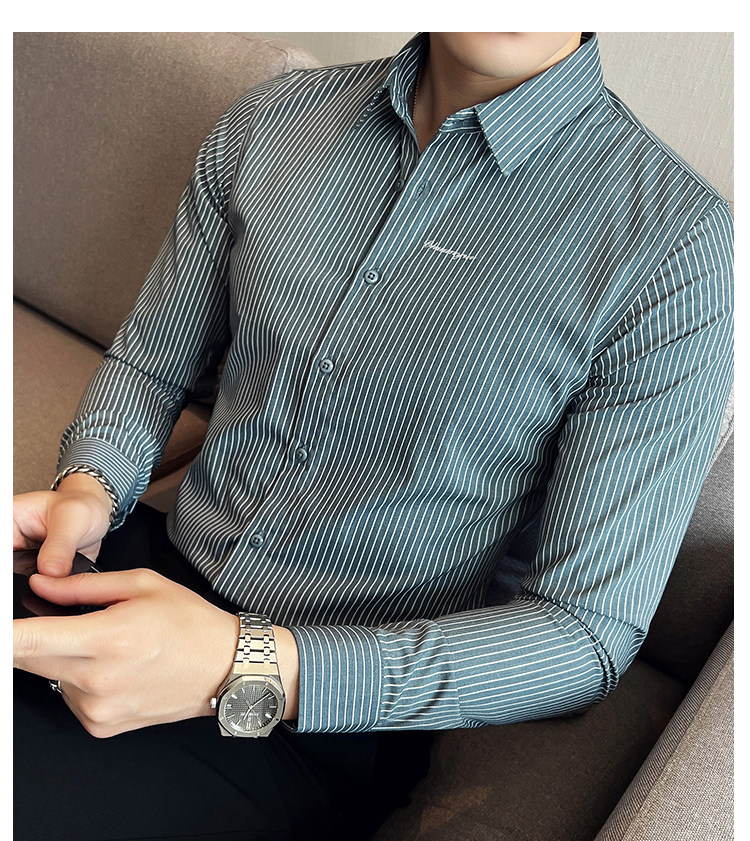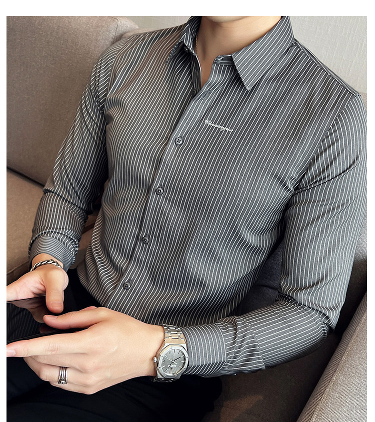 Men's Long-Sleeve Spring and Autumn White Shirt, Business Slim-Fit Professional Formal Embroidered Striped Shirt, Casual Youth Base Layer Trendy