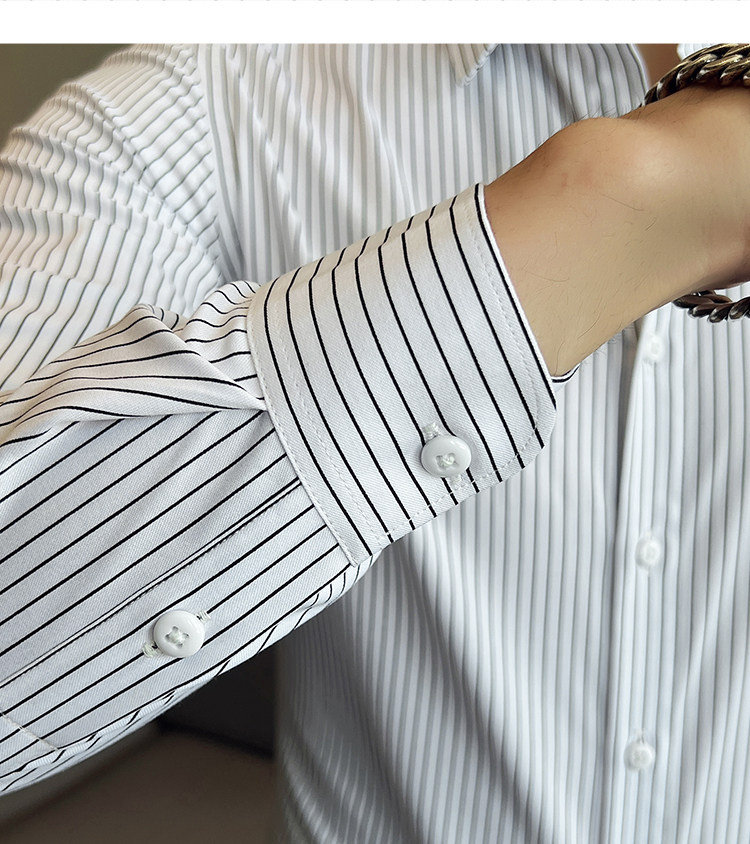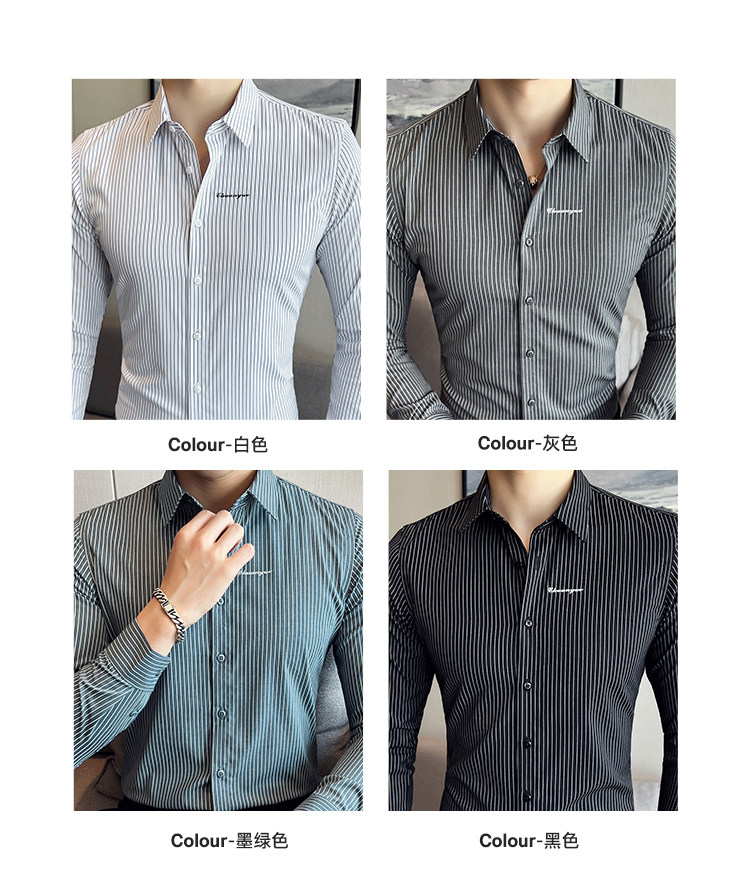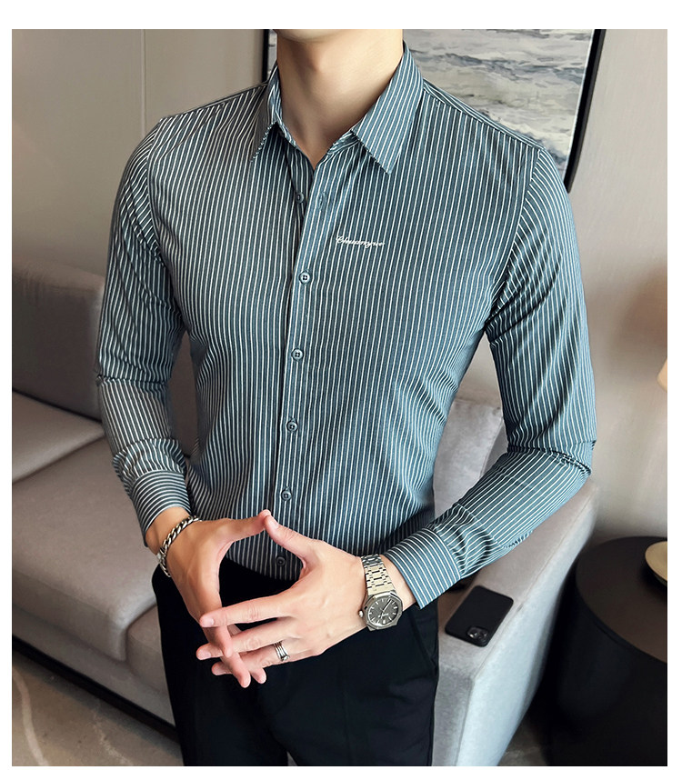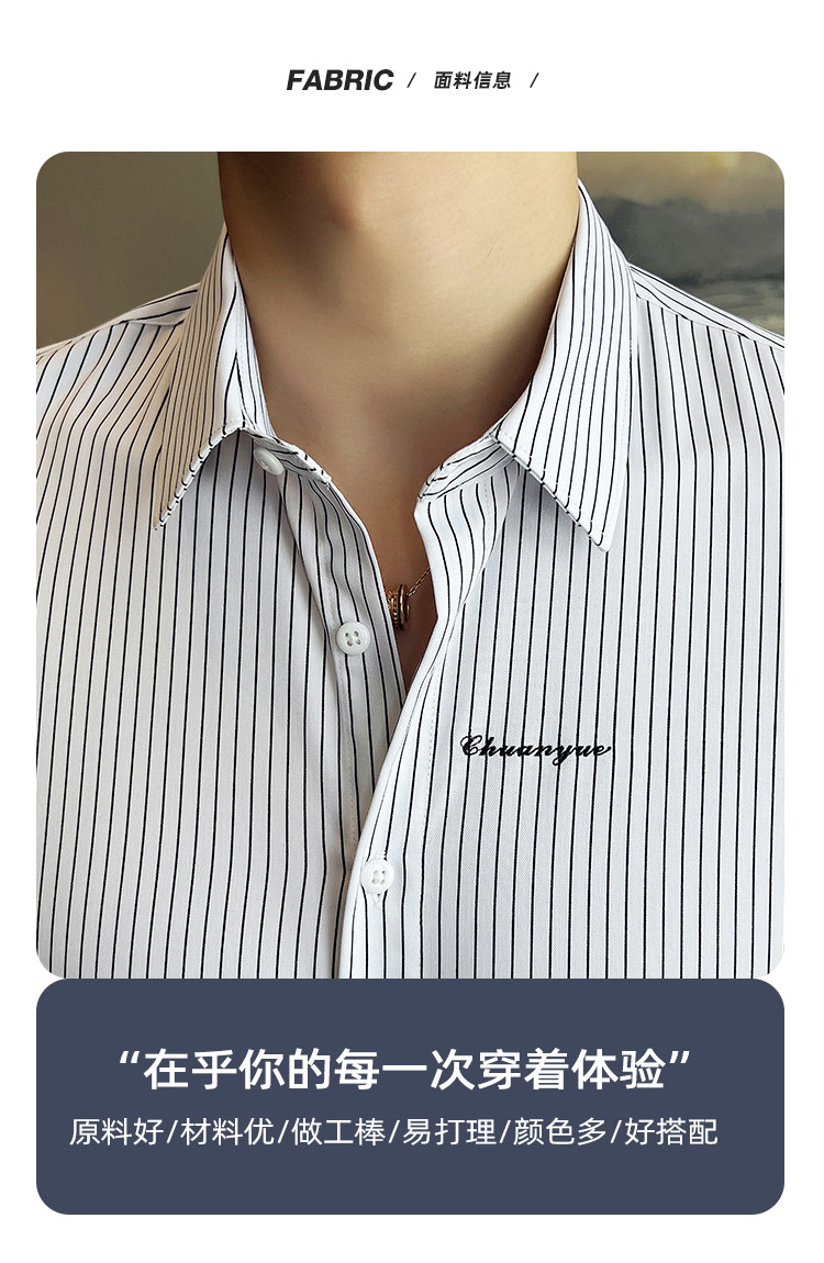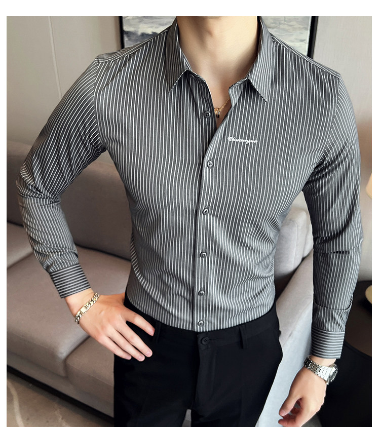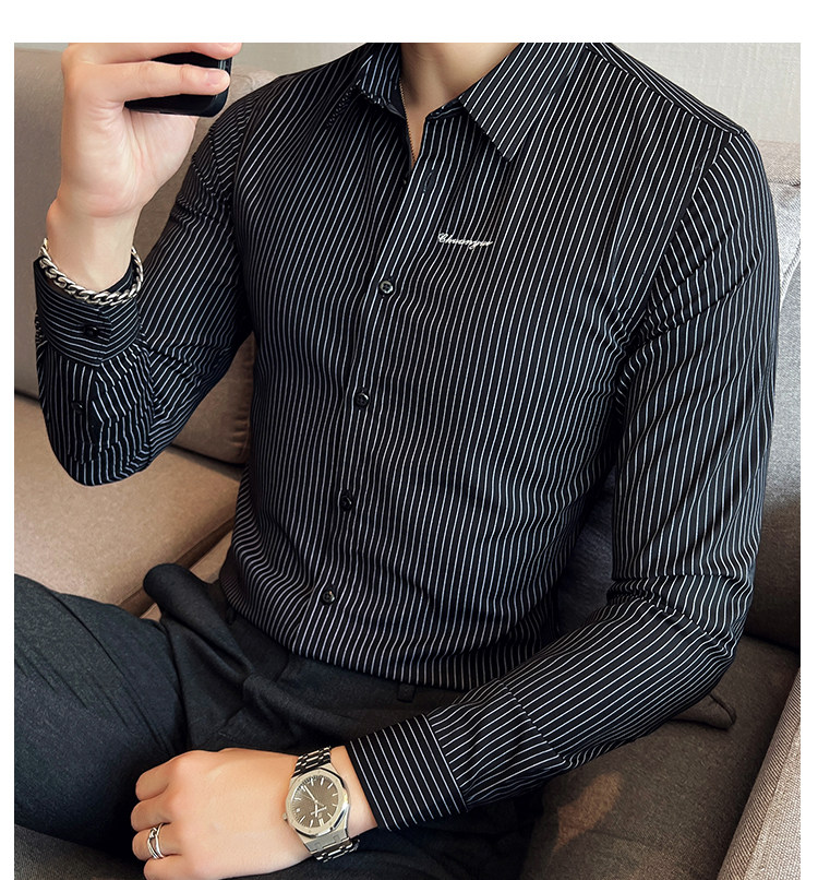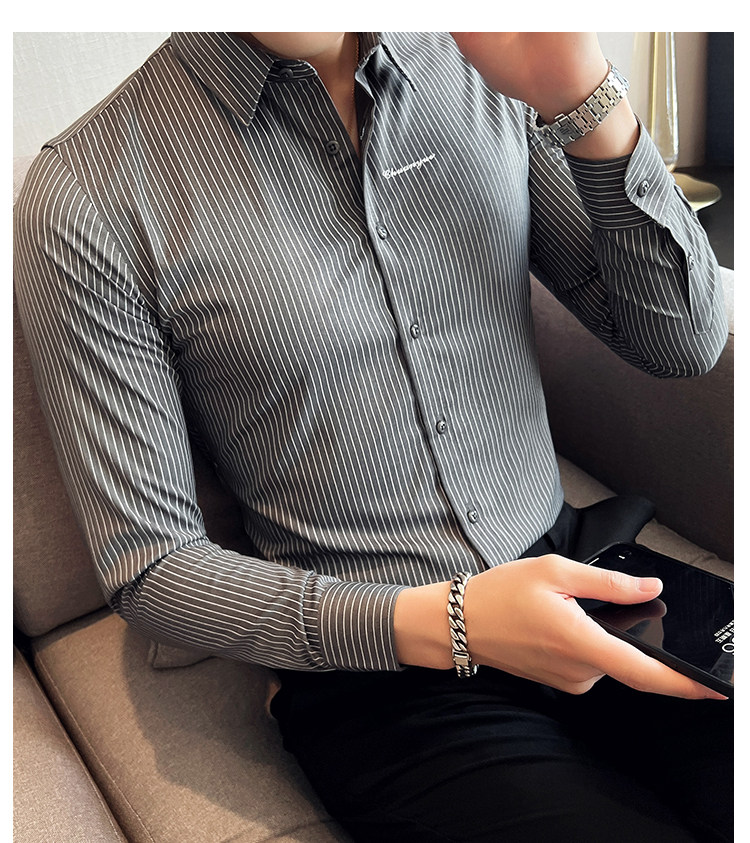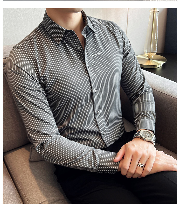 Men's Long-Sleeve Spring and Autumn White Shirt, Business Slim-Fit Professional Formal Embroidered Striped Shirt, Casual Youth Base Layer Trendy
