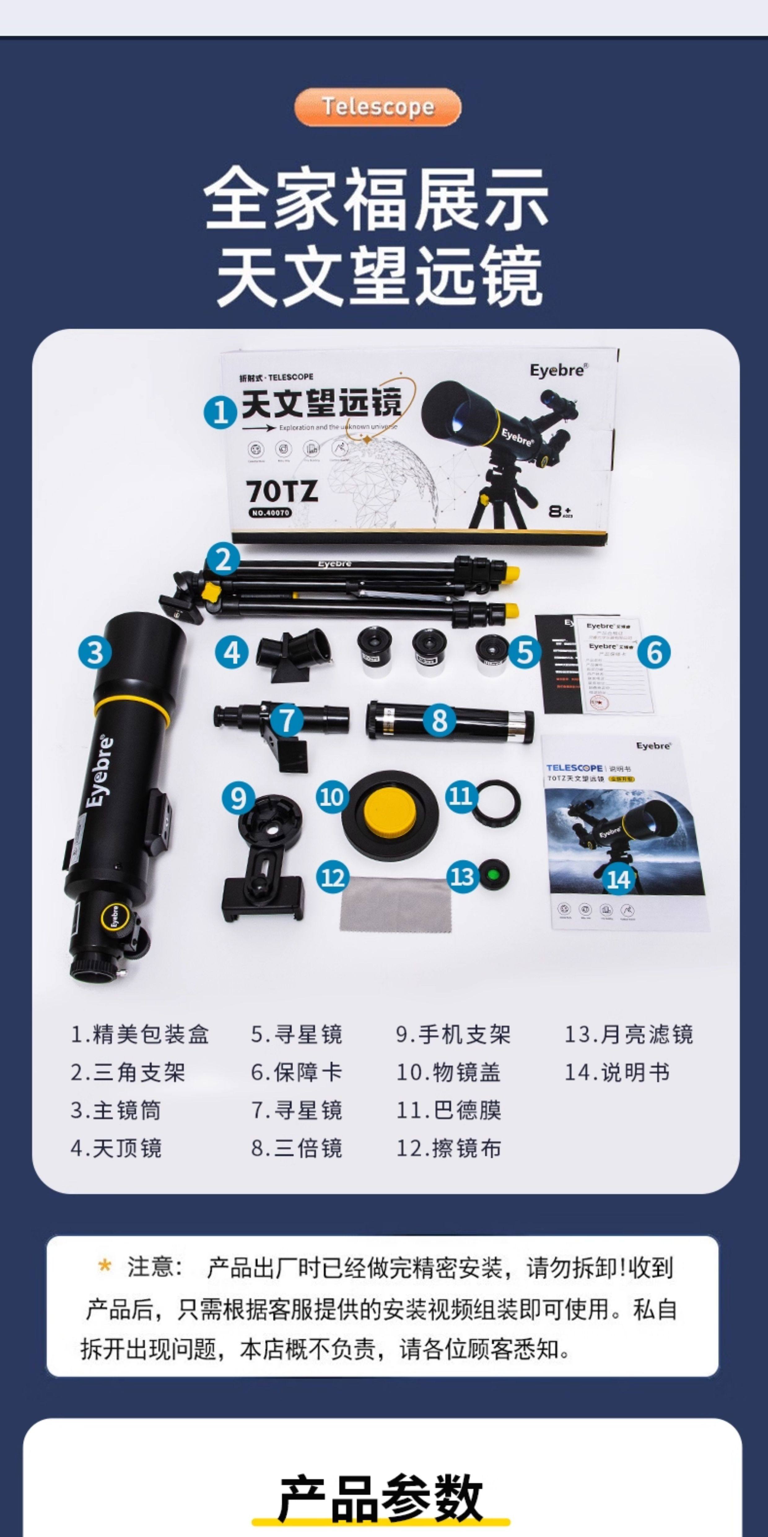 | Color Classification | The Product Has Been Installed with Precision When It Leaves the Factory, Please Do Not Disassemble It! after Receiving It, Just Contact Customer Service to Get the Assembly Video. Our Store Will Not Be Responsible for Any Problems if You Disassemble It Privately.,[Professional Upgraded Version] Advanced Astronomical Telescope [Free Bluetooth Selfie-Phone Holder-Bader Film],[Professional Grade] Astronomical Telescope [Basic Model] + Free Small Gift Pack,[Yuanfeng Blue] Basic Model of Astronomical Telescope,[Yuanfeng Blue] Basic Astronomical Telescope + Moon Filter,[Yuanfeng Blue] Basic Astronomical Telescope + Moon Filter + Mobile Phone Holder,Basic Star-Finding Telescope,Entry-Level Telescope Kit with Moon Filter,Entry-Level Telescope Kit with Moon Filter and Phone Adapter |
