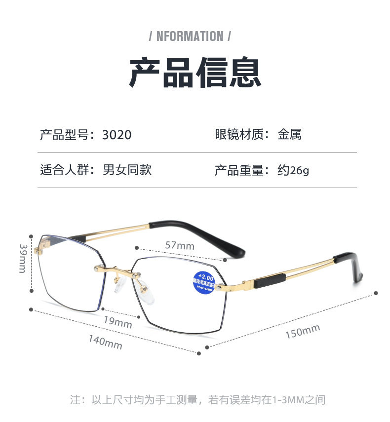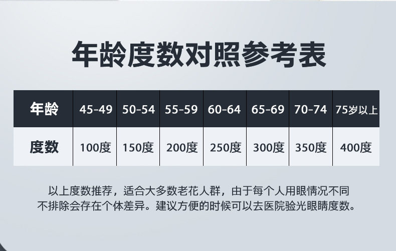 | Color Classification | Black Gold Frame [45-49 Years Old, Refer to 100 Degrees],Black Gold Frame [50-54 Years Old, Refer to 150 Degrees],Black Gold Frame [55-59 Years Old, Refer to 200 Degrees],Black Gold Frame [60-64 Years Old Reference 250 Degrees],Black Gold Frame [65-69 Years Old, Refer to 300 Degrees],Black Gold Frame [70-74 Years Old, Reference 350 Degrees],Black Gold Frame [400 Degrees for Those over 75 Years Old],Black and Silver Frame [45-49 Years Old, Refer to 100 Degrees],Black and Silver Frame [50-54 Years Old, Refer to 150 Degrees],Black and Silver Frame [55-59 Years Old, Refer to 200 Degrees],Black and Silver Frame [60-64 Years Old, Refer to 250 Degrees],Black and Silver Frame [65-69 Years Old, Refer to 300 Degrees],Black and Silver Frame [70-74 Years Old, Reference 350 Degrees],Black and Silver Frame [400 Degrees for Those over 75 Years Old] |