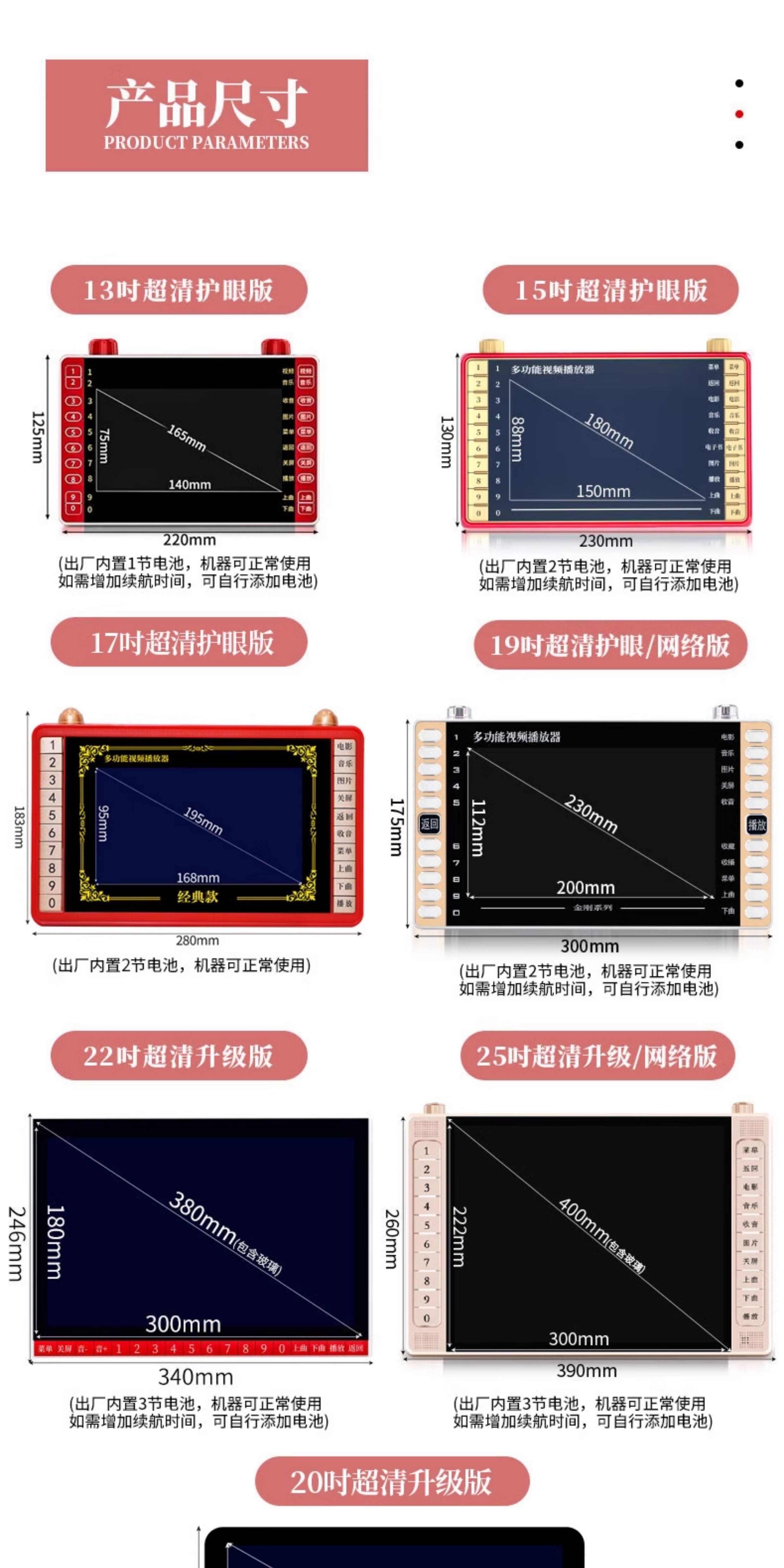 | Color Classification | 13inch Ultra-Clear Version Standard Version [Need to Provide Your Own Card/U Disk],13inch Ultra-Clear Version + Free [16Gu Disk/Built-In 578 Files],13inch Ultra-Clear Version + Free [32Gu Disk/Built-In 1122 Files],13inch Ultra-Clear Version + Free [64Gu Disk/Built-In 1695 Files],13inch Ultra-Clear Version + Free [128Gu Disk/Built-In 2163 Files],13inch Ultra-Clear Version + Free [256Gu Disk/Built-In 2688 Files],15inch Ultra-Clear Version Standard Version [Need to Provide Your Own Card/U Disk],15inch Ultra-Clear Version + Free [16Gu Disk/Built-In 578 Files],15inch Ultra-Clear Version + Free [32Gu Disk/Built-In 1122 Files],15inch Ultra-Clear Version + Free [64Gu Disk/Built-In 1695 Files],15inch Ultra-Clear Version + Free [128Gu Disk/Built-In 2163 Files],15inch Ultra-Clear Version + Free [256Gu Disk/Built-In 2688 Files],17inch Ultra-Clear Eye Protection Version. [You Need to Provide Your Own Card/U Disk],17inch Ultra-Clear Eye Protection Version + Free [16Gu Disk/Built-In 578 Files],17inch Ultra-Clear Eye Protection Version + Free. [32Gu Disk/Built-In 1122 Files],17inch Ultra-Clear Eye Protection Version + Free [64Gu Disk/Built-In 1695 Files],17inch Ultra-Clear Eye Protection Version + Free [128Gu Disk/Built-In 2163 Files],17inch Ultra-Clear Eye Protection Version + Free [256Gu Disk/Built-In 2688 Files],17inch Ultra-Clear Dvd Version Standard Version [Can Hold Discs],17inch Ultra-Clear Dvd Version + Free [16Gu Disk/Built-In 578 Files],17inch Ultra-Clear Dvd Version + Free [32Gu Disk/Built-In 1122 Files],17inch Ultra-Clear Dvd Version + Free [64Gu Disk/Built-In 1695 Files],19inch Ultra-Clear Version Standard Version [Need to Provide Your Own Card/U Disk],19inch Ultra-Clear Version + Free [16Gu Disk/Built-In 578 Files],19inch Ultra-Clear Version + Free [32Gu Disk/Built-In 1122 Files],19inch Ultra-Clear Version + Free [64Gu Disk/Built-In 1695 Files],19inch Ultra-Clear Version + Free [128Gu Disk/Built-In 2163 Files],19inch Ultra-Clear Version + Free [256Gu Disk/Built-In 2688 Files],19inch Ultra-Clear Network Version [Online Film and Television + Bluetooth],19inch Ultra-Clear Network Version + Free [32Gu Disk/Built-In 1122 Files] Online Movies and Tv + Bluetooth,19inch Ultra-Clear Network Version + Free [64Gu Disk/Built-In 1695 Files] Online Movies and Tv + Bluetooth,19inch Ultra-Clear Network Version + Free [128Gu Disk/Built-In 2163 Files] Online Movies and Tv + Bluetooth,20inch Ultra-Clear Upgraded Version Comes Standard [You Need to Provide Your Own Card/U Disk],20inch Ultra-Clear Upgraded Version + Free [32Gu Disk/Built-In 1122 Files],20inch Ultra-Clear Upgraded Version + Free [64Gu Disk/Built-In 1695 Files],20inch Ultra-Clear Upgraded Version + Free [128Gu Disk/Built-In 2163 Files],20inch Ultra-Clear Upgraded Version + Free [256Gu Disk/Built-In 2688 Files],22inch Ultra-Clear Upgraded Version Comes Standard [You Need to Provide Your Own Card/U Disk],22inch Ultra-Clear Upgraded Version + Free [16Gu Disk/Built-In 578 Files],22inch Ultra-Clear Upgraded Version + Free [32Gu Disk/Built-In 1122 Files],22inch Ultra-Clear Upgraded Version + Free [64Gu Disk/Built-In 1695 Files],22inch Ultra-Clear Upgraded Version + Free [128Gu Disk/Built-In 2163 Files],22inch Ultra-Clear Upgraded Version + Free [256Gu Disk/Built-In 2688 Files],25inch Ultra-Clear Upgraded Version Standard Version [Requires Your Own Card/U Disk],25inch Ultra-Clear Upgraded Version + Free [16Gu Disk/Built-In 578 Files],25inch Ultra-Clear Upgraded Version + Free [32Gu Disk/Built-In 1122 Files],25inch Ultra-Clear Upgraded Version + Free [64Gu Disk/Built-In 1695 Files],25inch Ultra-Clear Upgraded Version + Free [128Gu Disk/Built-In 2163 Files],25inch Ultra-Clear Upgraded Version + Free [256Gu Disk/Built-In 2688 Files],25inch Ultra-Clear Dvd Playback Version [Requires Your Own Card/U Disk],25inch Ultra-Clear Dvd Playback Version + Free [16Gu Disk/Built-In 578 Files],25inch Ultra-Clear Dvd Playback Version + Free [32Gu Disk/Built-In 1122 Files],25inch Ultra-Clear Dvd Playback Version + Free [64Gu Disk/Built-In 1695 Files],25inch Ultra-Clear Dvd Playback Version + Free [128Gu Disk/Built-In 2163 Files],25inch Ultra-Clear Dvd Playback Version + Free [256Gu Disk/Built-In 2688 Files],25inch Ultra-Clear Network Version + [Online Movies + Bluetooth],25inch Ultra-Clear Network Version + Free [16Gu Disk/Built-In 578 Files] (Online Movies and Tv) + Bluetooth,25inch Ultra-Clear Network Version + Free [32Gu Disk/Built-In 1122 Files] (Online Movies and Tv) + Bluetooth,25inch Ultra-Clear Network Version + Free [64Gu Disk/Built-In 1695 Files] (Online Movies and Tv) + Bluetooth,25inch Ultra-Clear Network Version + Free [128Gu Disk/Built-In 2163 Files] (Online Movies and Tv) + Bluetooth,Eight-Core Touch Screen Network Version + 128Gu Disk + Massive Online Movies and Tv Shows [Can Be Used as a Karaoke Machine],Eight-Core Touch Screen Network Version + 256Gu Disk + Massive Online Movies and Tv Shows [Can Be Used as a Karaoke Machine] |