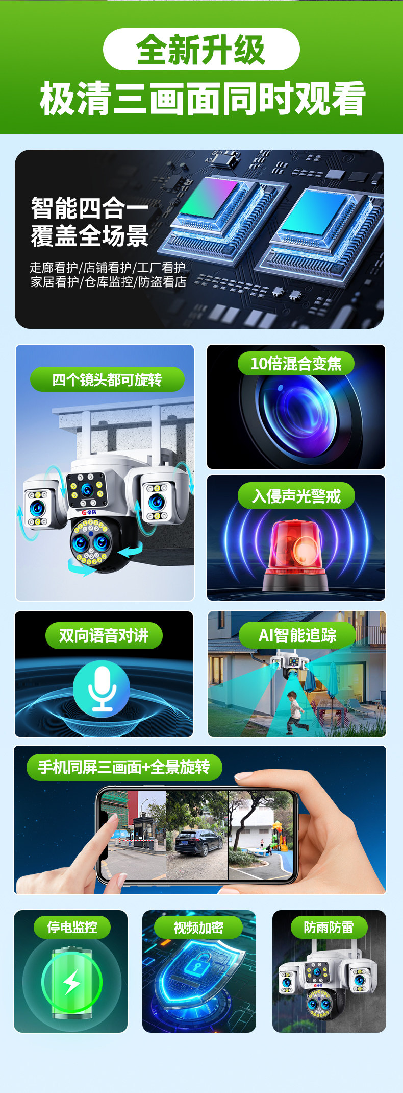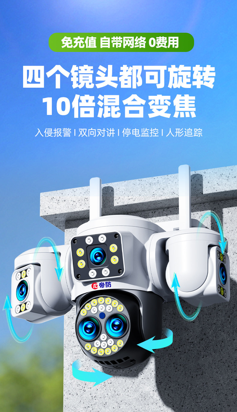 | Color Classification | Wifi Version [Ultra-Clear Dual Lens, Dual Screen] 1 Unit Is Equivalent to 2 Units + Sound and Light Alarm + Active Defense + Intercom + Tracking + Panoramic Monitoring,Wifi Version [Ultra-Clear Three Lenses + 10X Zoom] 100m See the License Plate Clearly + Sound and Light Alarm + Active Defense + Intercom + Tracking + Panoramic Monitoring,Wifi Version [Ultra-Clear Three Lenses + 10X Zoom + Power Outage Monitoring] 100m See the License Plate Clearly + Sound and Light Alarm + Active Defense + Intercom + Tracking + Panoramic Monitoring,Wifi Version [Detachable Rotatable Triple Lens + Triple Screen] See License Plates and Faces Clearly + Audible and Visual Alarm + Active Defense + Two-Way Talk + Tracking + Panoramic Monitoring,Wifi Version [Detachable Rotatable Triple Lens + Triple Screen + Power Outage Monitoring] See License Plates and Faces Clearly + Audible and Visual Alarm + Active Defense + Two-Way Talk + Tracking + Panoramic Monitoring,Wifi Version [Rotatable Four Lenses + 10X Zoom] 100m See the License Plate Clearly + Sound and Light Alarm + Active Defense + Intercom + Tracking + Panoramic Monitoring,Wifi Version [Rotatable Quad Lens + 10X Zoom + Power Outage Monitoring] 100m See License Plates Clearly + Audible and Visual Alarm + Active Defense + Two-Way Talk + Tracking + Panoramic Monitoring,4g Version (No Top-Up Required - 99 Years of Data Included) [Rotating Quad Lens + 10X Zoom] 100m See License Plates Clearly + Audible and Visual Alerts + Active Defense + Two-Way Talk + Tracking + Remote Monitoring Without Network Connection,4g Version (No Top-Up Required - 99 Years of Data Included) [Rotating Quad Lens + 10X Zoom + Power Outage Monitoring] 100m Crystal-Clear License Plate Recognition + Audible and Visual Alerts + Active Defense + Two-Way Talk + Tracking + Remote Monitoring Without Cellular Network,4g Version (No Top-Up Required - Includes 99 Years of Data) [Ultra-Hd Dual Lens, Dual Screen] 1 Device Does the Work of 2 + Audible & Visual Alerts + Active Defense + Two-Way Talk + Tracking + Remote Monitoring (No Network Required),4g Solar-Powered Camera (No Top-Up Required - Includes 99 Years of Data) [Ultra-Wide Angle Dual Lens + 30-Day Ultra-Long Battery Life] No Electricity or Network Needed - Remote 360° Mobile Phone Monitoring |