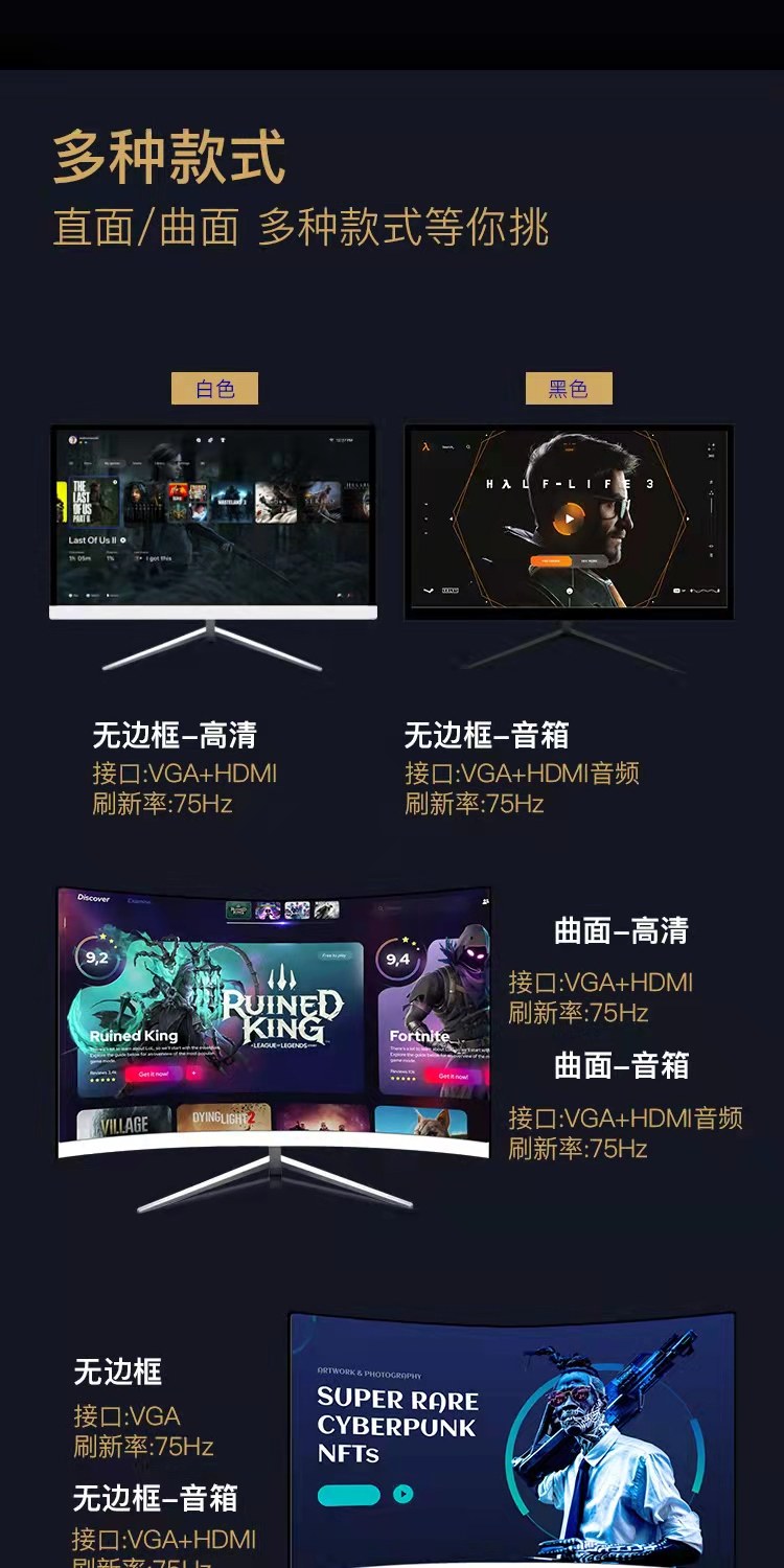 | Color Classification | 24inch Direct-Facing Bezel-Less Hdmi+Vga,24inch Curved Surface Borderless Hdmi+Vga,24inch Direct-Facing Bezel-Less Hdmi+Vga+Audio,24inch Curved Surface Borderless Hdmi+Vga+Audio,27inch Direct-Facing Bezel-Less Hdmi+Vga,27inch Curved Surface Borderless Hdmi+Vga,27inch Direct-Facing Bezel-Less Hdmi+Vga+Audio,27inch Curved Surface Borderless Hdmi+Vga+Audio,32inch Direct-Facing Bezel-Less Hdmi+Vga,32inch Direct-Facing Bezel-Less Hdmi+Vga+Audio |