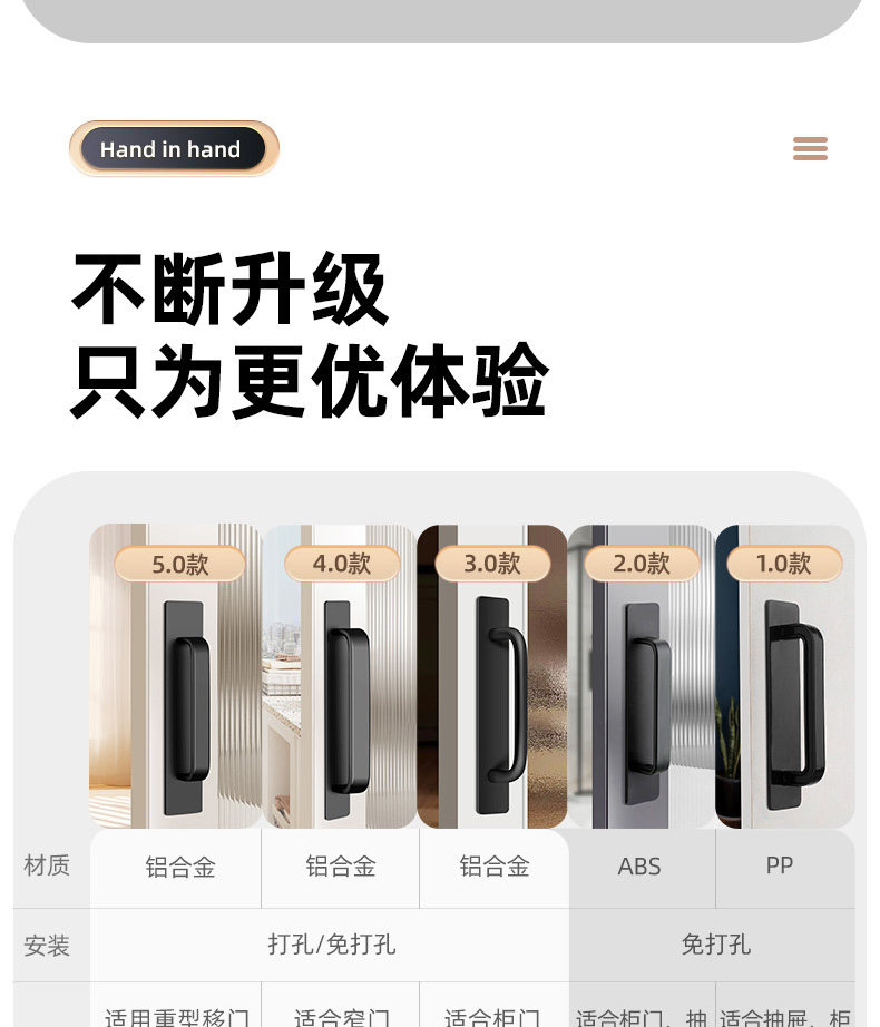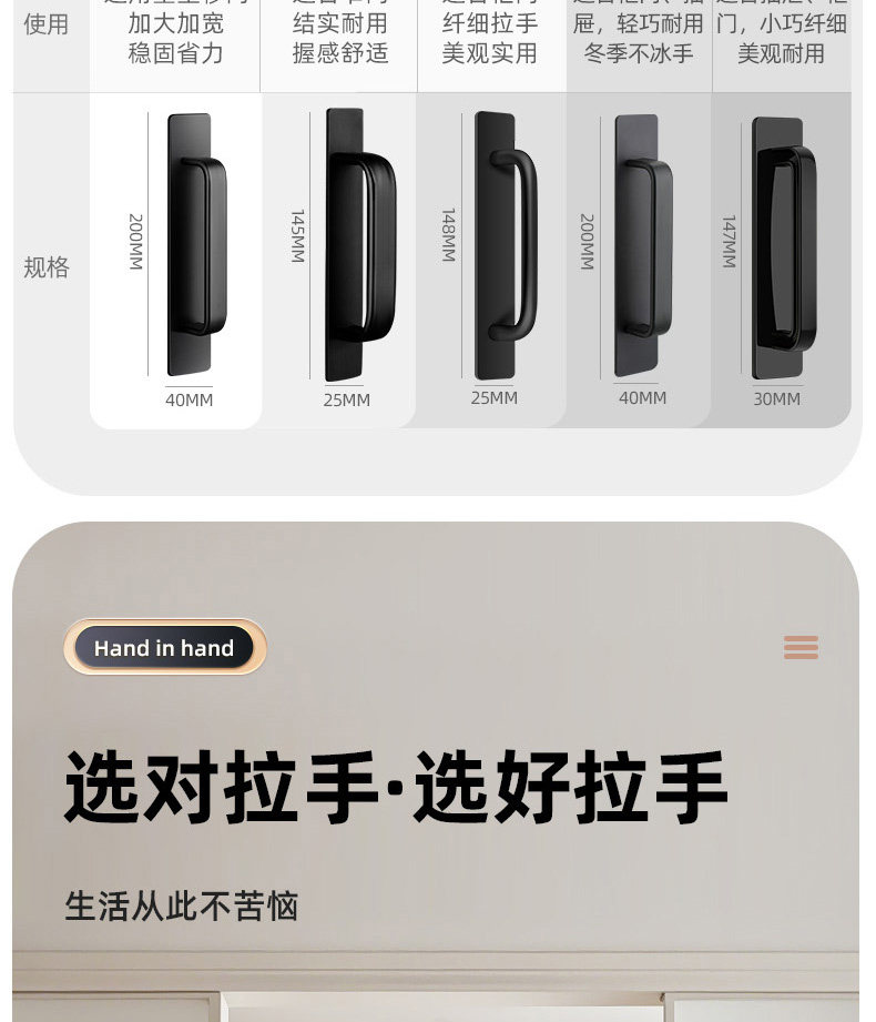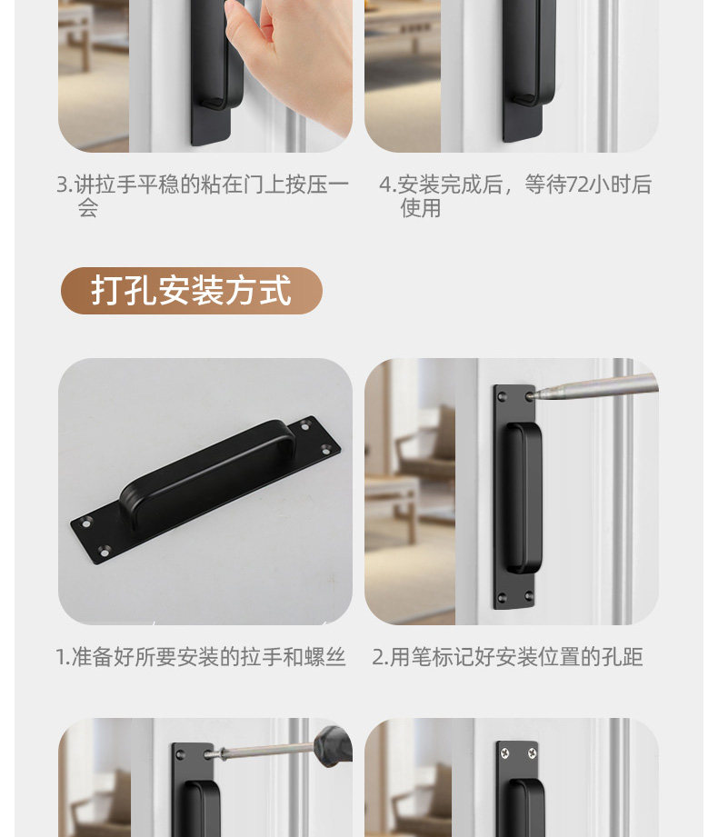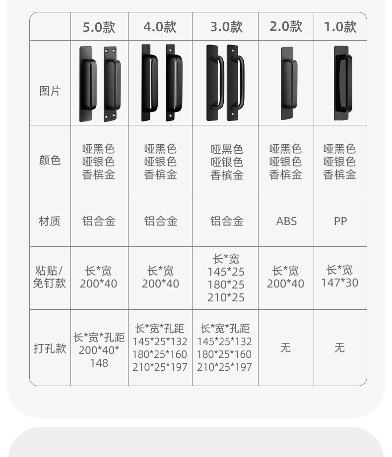 | Color Classification | [Fifth Generation Upgraded Adhesive Version],[5.0 Paste Style]Aluminum Alloy Matte Black-200*40,[5.0 Paste Style]Aluminum Alloy Matte Silver-200*40,[5.0 Paste Style]Aluminum Alloy Champagne Gold-200*40,[5.0 Paste Style]Aluminum Alloy Matte Black-200*40 2 Pieces,[5.0 Paste Style]Aluminum Alloy Matte Silver-200*40 2 Pieces,[5.0 Paste Style]Aluminum Alloy Champagne Gold-200*40 2 Pieces,[Fifth Generation Upgrade Nail-Free Glue],[5.0 Nail-Free Glue]Aluminum Alloy Matte Black-200*40,[5.0 Nail-Free Glue]Aluminum Alloy Matte Silver-200*40,[5.0 Nail-Free Glue]Aluminum Alloy Champagne Gold-200*40,[5.0 Nail-Free Glue]Aluminum Alloy Matte Black-200*40 2 Pieces,[5.0 Nail-Free Glue]Aluminum Alloy Matte Silver-200*40 2 Pieces,[5.0 Nail-Free Glue]Aluminum Alloy Champagne Gold-200*40 2 Pieces,[Fifth Generation Upgraded Perforated Model],[5.0 Punch Hole Model]Aluminum Alloy Matte Black-200*40,[5.0 Punch Hole Model]Aluminum Alloy Matte Silver-200*40,[5.0 Punch Hole Model]Aluminum Alloy Champagne Gold-200*40,[Fourth Generation Upgraded Adhesive Version],[4.0 Paste Style]Aluminum Alloy Matte Black-145*25,[4.0 Paste Style]Aluminum Alloy Matte Black-180*25,[4.0 Paste Style]Aluminum Alloy Matte Black-210*25,[4.0 Paste Style]Aluminum Alloy Matte Silver-145*25,[4.0 Paste Style]Aluminum Alloy Matte Silver-180*25,[4.0 Paste Style]Aluminum Alloy Matte Silver-210*25,[4.0 Paste Style]Aluminum Alloy Champagne Gold-145*25,[4.0 Paste Style]Aluminum Alloy Champagne Gold-180*25,[4.0 Paste Style]Aluminum Alloy Champagne Gold-210*25,[Fourth Generation Upgraded Perforated Model],[4.0 Punch Hole Model]Aluminum Alloy Matte Black-145*25,[4.0 Punch Hole Model]Aluminum Alloy Matte Black-180*25,[4.0 Punch Hole Model]Aluminum Alloy Matte Black-210*25,[4.0 Punch Hole Model]Aluminum Alloy Matte Silver-145*25,[4.0 Punch Hole Model]Aluminum Alloy Matte Silver-180*25,[4.0 Punch Hole Model]Aluminum Alloy Matte Silver-210*25,[4.0 Punch Hole Model]Aluminum Alloy Champagne Gold-145*25,[4.0 Punch Hole Model]Aluminum Alloy Champagne Gold-180*25,[4.0 Punch Hole Model]Aluminum Alloy Champagne Gold-210*25,[Second Generation Upgraded Adhesive Version],[2.0 Paste Style]Abs Matte Black-Width 200*40,[2.0 Paste Style]Abs Matte Silver-Width 200*40,[2.0 Paste Style]Abs Matte Gray-Width 200*40,[2.0 Paste Style]Abs Champagne Gold-Width 200*40,No Punching Abs Door and Window Handles White 2 Pcs,[Stainless Steel]Drawer Handle Silver 24*38,[Stainless Steel]Drawer Handle Silver 30*38 |