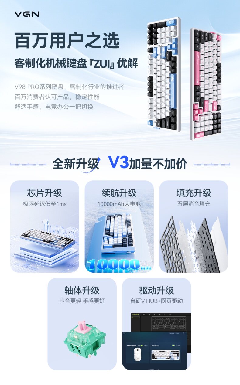 | Color Classification | V98Pro V3 Hyacinth Glacier Axis,V98Pro V3 Cow Axis Sea Salt,V98Pro V3 Polar Fox Axis Polar Limited,V98Pro V3 Polar Fox Axis Sea Salt,V98Pro V3 Azure Blue Ice Cream Axis Pro,V98Pro V3 Dai Jade Axis Sea Salt,V98Pro V3 Dai Jade Axis Strawberry Bear Limited,V98Pro V3 Wps Co-Branded Model Daiyu Axis,V98Pro V3 Wps Co-Branded Model Daiyu Axis + Wps Super Membership Annual Card,V98Pro V3 Hyacinth Glacier Axis + [Love Keycap Combination Pack],V98Pro V3 Polar Fox Switch Sea Salt + [Love Keycap Combination Pack],V98Pro V3 Cow Axis Sea Salt 1,V98Pro V3 Polar Night Gradient Side Engraving Night Demon Axis,V98Pro V3 Peach Pink Gradient Side Engraving Glacier Axis,V98Pro V3 - No Axis, Ming Dynasty Collaboration Edition,V98Pro V2 Polar Fox Axis - Arctic Edition (Limited Release),V98Pro V2 Polar Fox Axis Glacier,V98Pro V2 Polar Fox Axis Midnight,V98Pro V2 Crystal Wine Red Axis Pro Sea Salt,V98Pro V2 Crystal Wine Red Switch Pro - Blackcurrant,V98Pro V2 Vaporwave Axis Pro Sea Salt,V98Pro V2 Vaporwave Axis Pro Blackcurrant,V98Pro V2 Box Ice Cream Axis Pro Sea Salt,V98Pro V2 Box Ice Cream Axis Pro - Blackcurrant,V98Pro V2 Box Ice Cream Axis Pro Nubani Source (Limited Edition),V98Pro V2 Blueberry Ice Cream Switch - Sea Salt,V98Pro V2 Blueberry Ice Cream Switch - Blackcurrant,V98Pro V2 Zhiqiu Axis Maple Sugar (Limited Edition),V98Pro V2-Polar Fox Axis-Jotaro (JOJO joint model),V98Pro V2 - Arctic Fox Switch - Xu Lun (Jojo Collaboration Edition),Polar Fox Axis Polar Night,Polar Fox Axis Glacier,Crystal Burgundy Pro - Sea Salt,Crystal Burgundy Pro - Blackcurrant,Vaporwave Axis Pro - Blackcurrant,Steamwave Axis Pro Sea Salt,Box Ice Cream Axis Pro - Sea Salt,Box Ice Cream Axis Pro - Blackcurrant,Box Ice Cream Axis Pro - Nubani Source (Limited Edition),Blueberry Ice Cream Shaft Sea Salt,Blueberry Ice Cream Shaft - Blackcurrant,Zhiqiu Axis Maple Sugar (Limited Edition),Polar Fox Axis-Xu Lun (Jojo Co-Branded Model) |