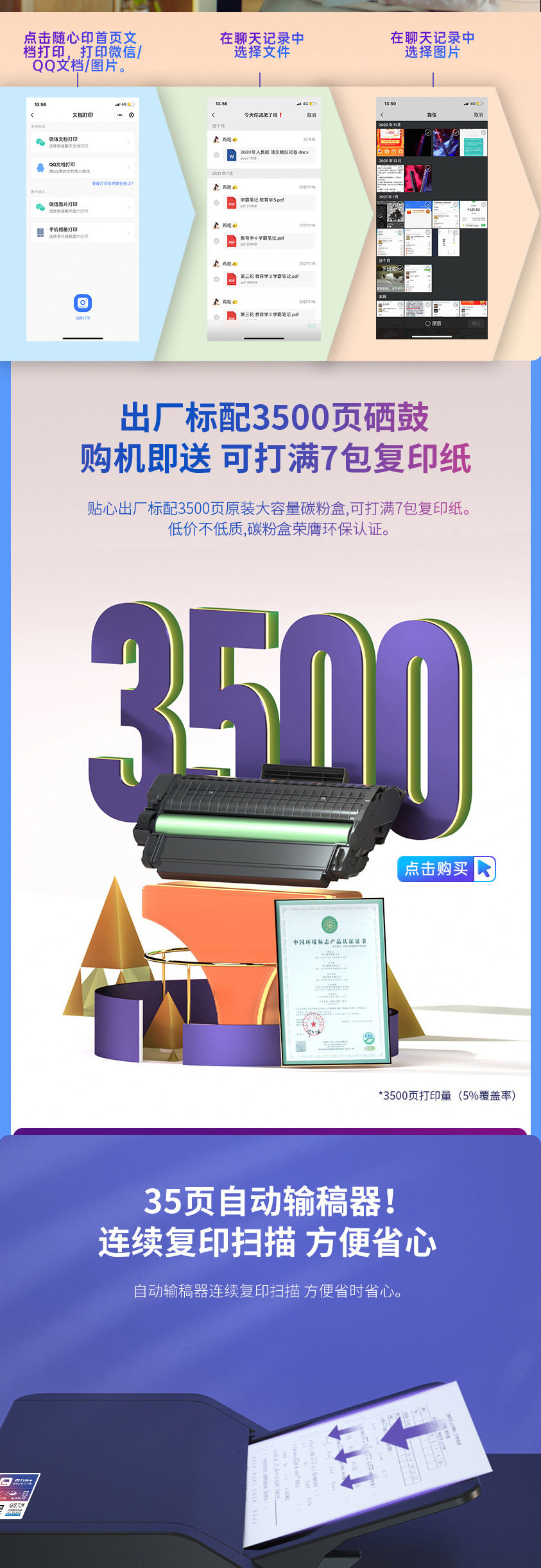 | Color Classification | M2500Adw [Double-Sided Printing + Mobile Phone Wireless + 35-Page Document Feeder],M2500Adw+ [1 Piece of 3500-Page Easy-To-Add Powder Toner Cartridge + 2 Bottles of Toner],M2500Adw+ [1 Piece of 3500-Page Original Toner Cartridge],M2500Adnw [Double-Sided Printing + Mobile Phone Wireless + 35-Page Document Feeder + Network Cable Port],M2500Adnw+ [1 3500-Page Easy-To-Add Powder Toner Cartridge + 2 Bottles of Toner],M2500Adnw+ [1 Piece of 3500-Page Original Toner Cartridge],M2000Dw [Double-Sided Printing + Mobile Phone Wireless],M2000Dw+ [1 Piece of 4500 Pages Easy-To-Add Powder Toner Cartridge + 2 Bottles of Toner],M2000Dw+ [1 Piece of 4500-Page Original Toner Cartridge],M2000Dnws [Double-Sided Printing + Mobile Phone Wireless + Network Cable Port],M2000Dnws+ [1 4500-Page Easy-To-Add Powder Toner Cartridge + 2 Bottles of Toner],M2000Dnws+ [1 Piece of 4500-Page Original Toner Cartridge] |