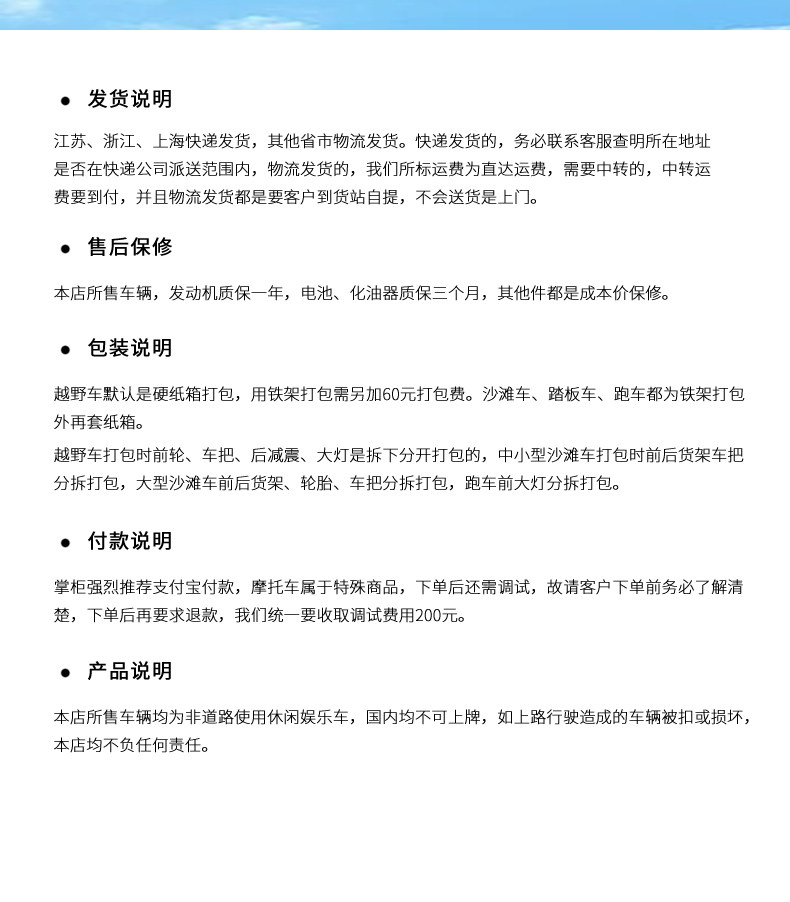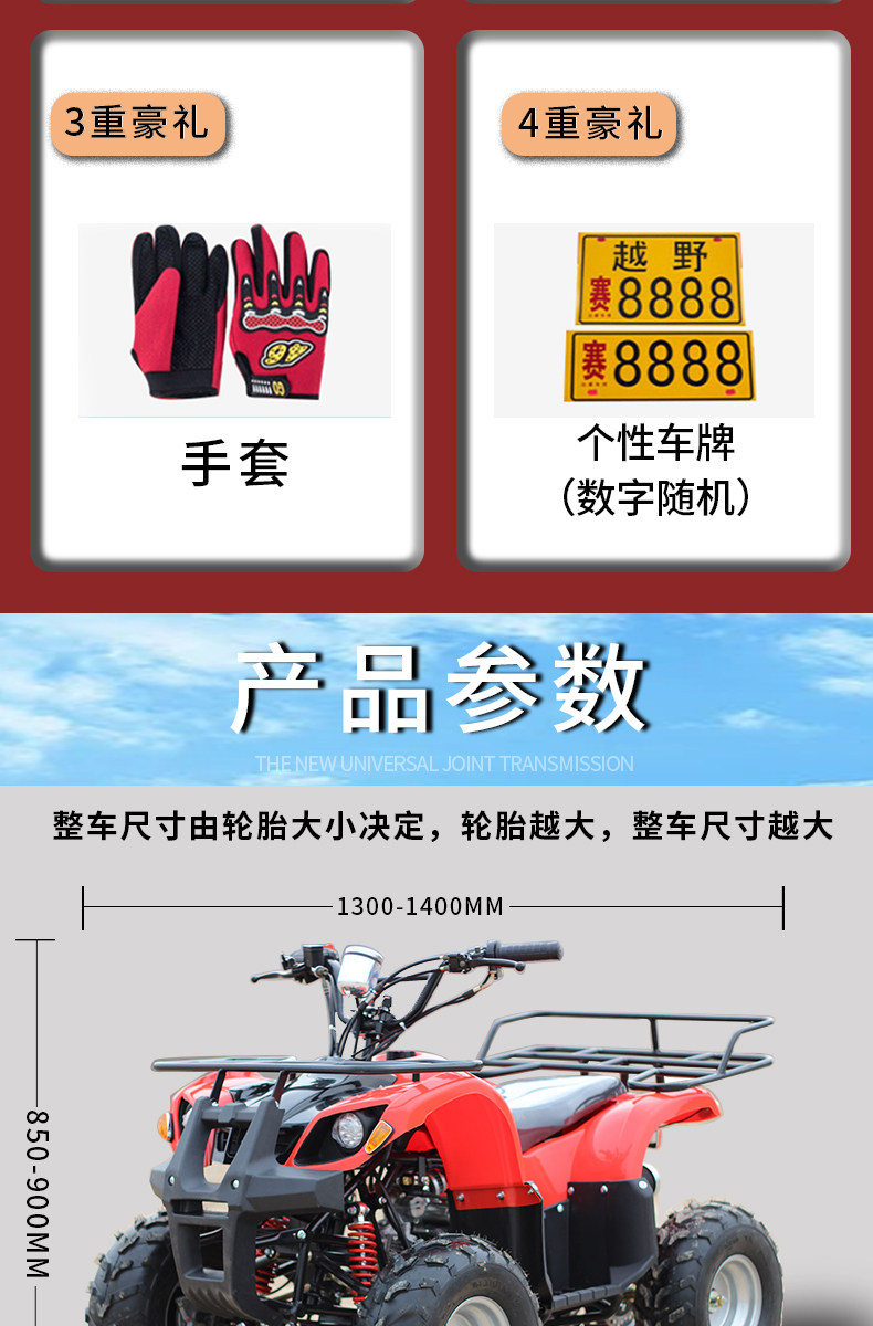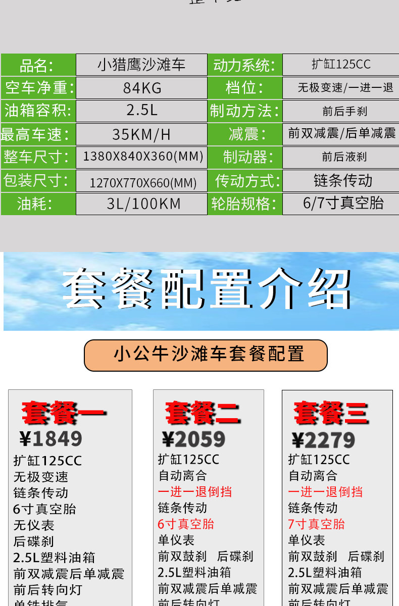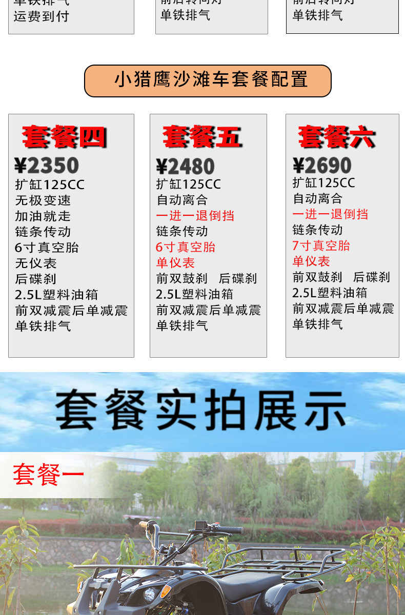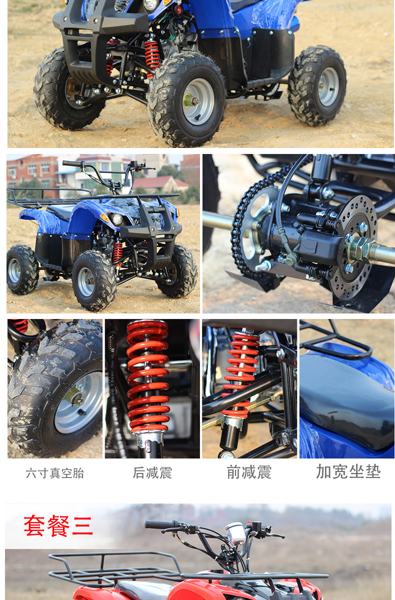| Color Classification | Package 1/Infinitely Variable Speed/Chain Transmission/ 6inch /No Instrument/Rear Disc/2.5L Plastic/Single Exhaust,Package 2/One in and One Out/Chain Transmission/ 6inch /Single Instrument/Front Drum and Rear Disc/2.5L Plastic/Single Exhaust,Package Three/One in and One Out/Chain Transmission/7inch/Single Instrument/Front Drum and Rear Disc/2.5L Plastic/Single Exhaust,Package Four / Infinitely Variable Speed (Ivt) / Chain Drive / 6inch / No Instrument Panel / Rear Disc Brakes / 2.5L Plastic Tank / Single Exhaust,Package Five/One in and One Out/Chain Transmission/ 6inch /Single Instrument/Front Drum and Rear Disc/2.5L Plastic/Single Exhaust,Package Six/One in and One Out/Chain Transmission/ 7inch /Single Instrument/Drum Brake Rear Disc/2.5L Plastic/Single Exhaust |