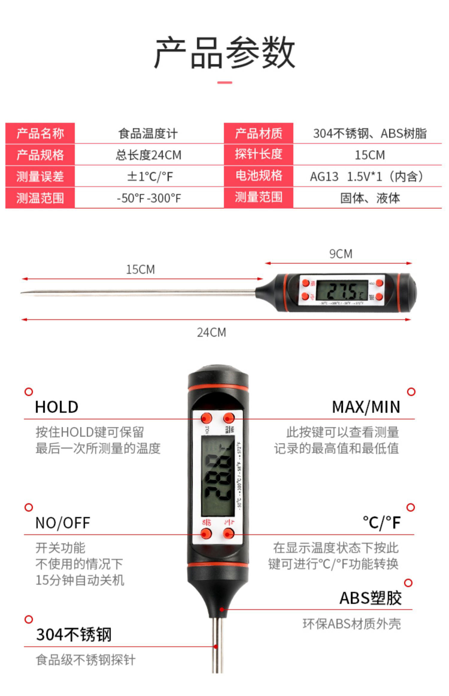 Probe Type Food Thermometer Table Milk Tea Shop Temperature Car Air Conditioner Water Oil Pen Type Digital Display High-Precision Thermometer
