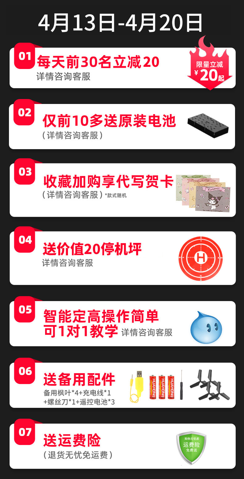 | Package Type | Official Standard Configuration,[A Battery]The First 10 People Every Day Will Receive an Original Battery + Replacement if It Breaks,[Two Batteries] + Broken and Replaced with New One + Remote Control Battery (90% of Parents Recommend),[Three Batteries] + Broken and Replaced with New One + Remote Control Battery (70% of Parents Recommend),[Four Batteries] + Broken and Replaced with New One + Remote Control Battery + Charging Cable |