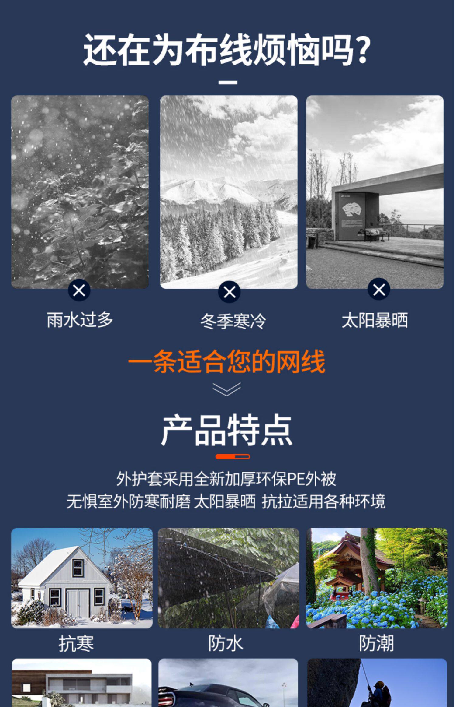 Color Classification 【Outdoor Gigabit】 Category 5E Classic Model,【Outdoor Gigabit】 Category 6 Gigabit High-Speed Model,【Outdoor 10g】 Category 7 Shielded High-Speed Cable,【Outdoor 10g】 Category 8 Shielded Cable for Enhanced Speed