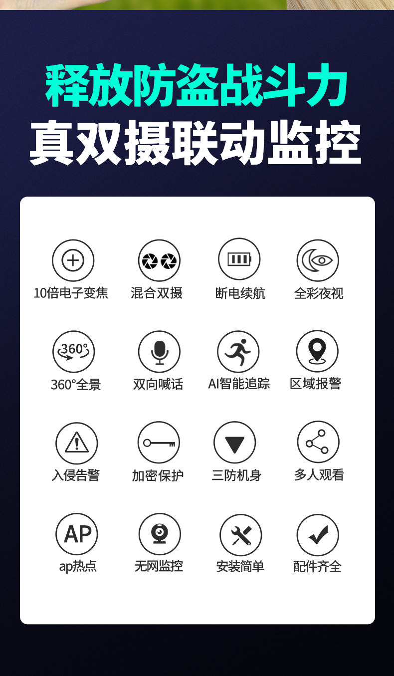 | Color Classification | Dual Lens + Dual Screen + Wifi Version (1 Unit Tops 2 Units),Dual Lens + Dual Screen + Power Outage Monitoring + Wifi Version (1 Unit Tops 2 Units),Three Lenses + Dual Screen + 10X Zoom + Wifi Version (1 Unit Can Replace 3 Units),Triple Lens + Dual Screen + Power Outage Monitoring + 10X Zoom + Wi-Fi Version (1 Unit Does the Work of 3),4g Version Dual Lens + Dual Screen + Power Outage Monitoring - Remote Monitoring of Mobile Phones Without Network (Choose This for Networkless Environment),Solar-Powered 4g Camera with 10X Zoom (See Everything, Near and Far) + Remote Monitoring Without Electricity or Network Connection |