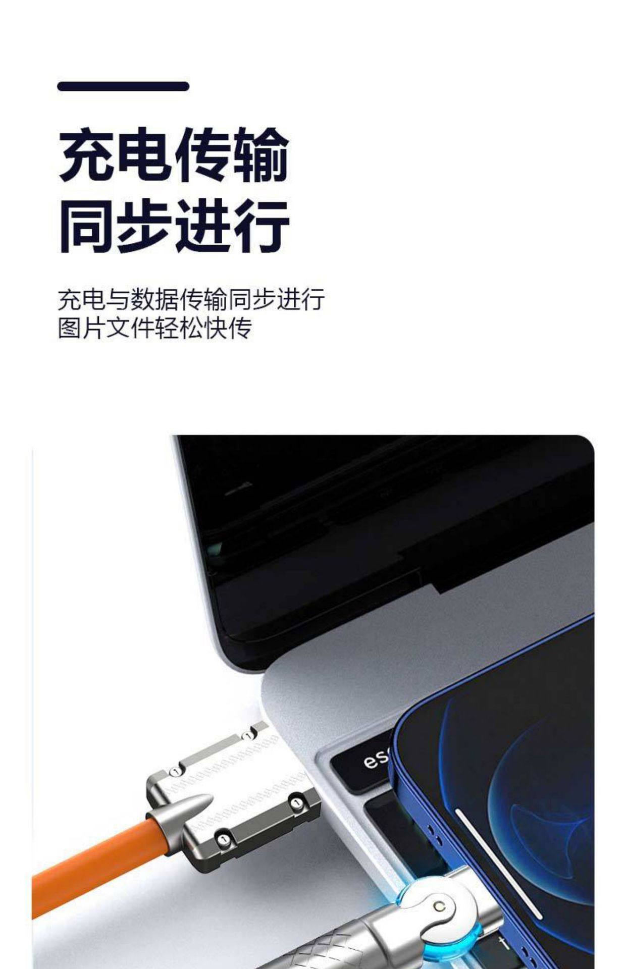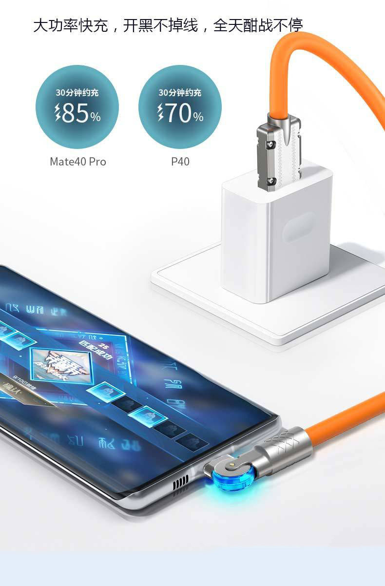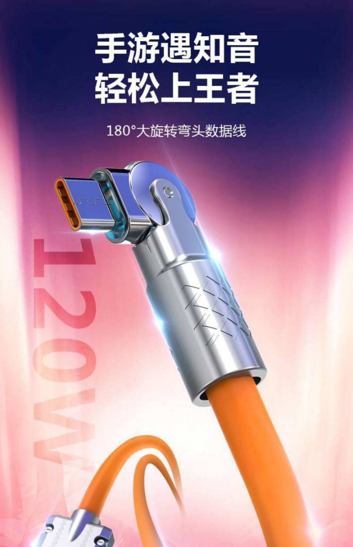 120W Data Cable Type-C Super Fast Charging Swivel Elbow Suitable for Apple 14, Huawei P30, Mate40, Honor iPhone 13, Xiaomi Mobile Phone Charging Cable, Vivo, Android, Oppo, Non-Blocking Cable