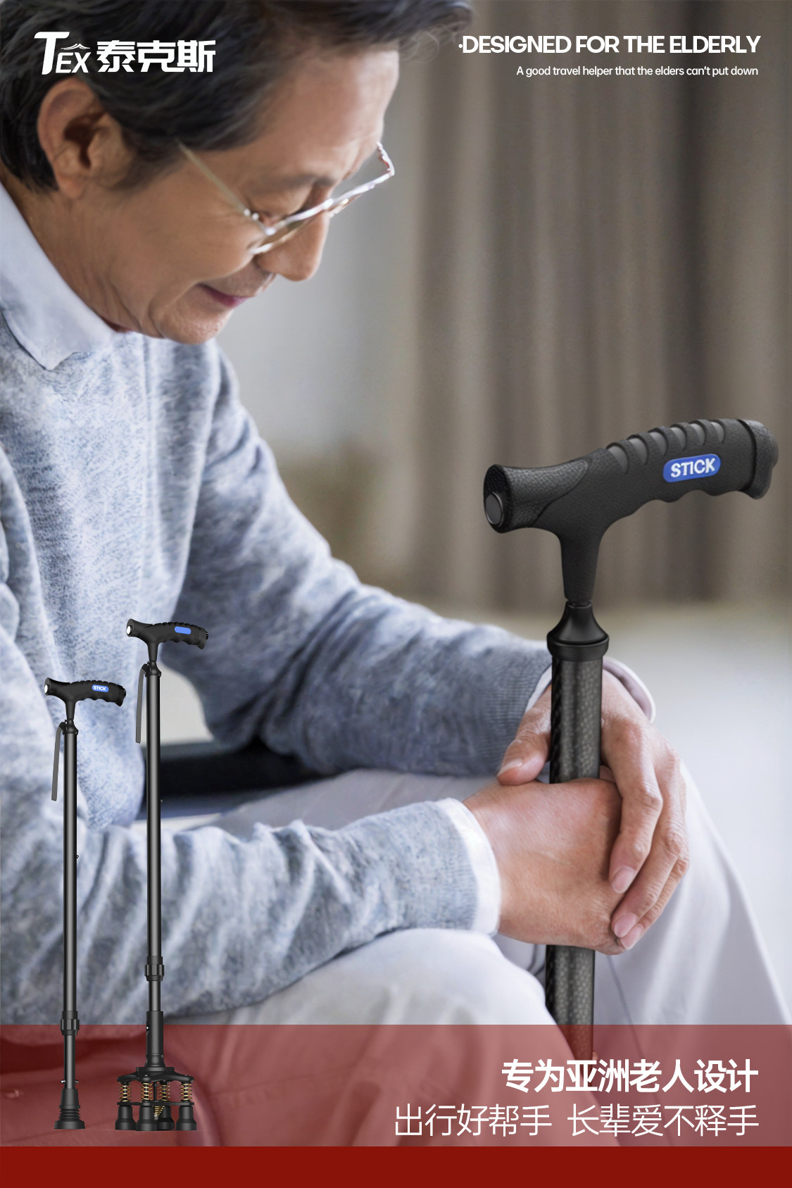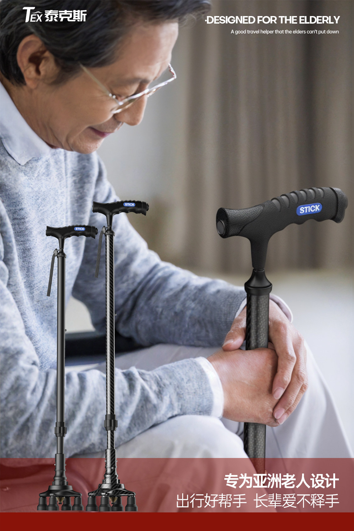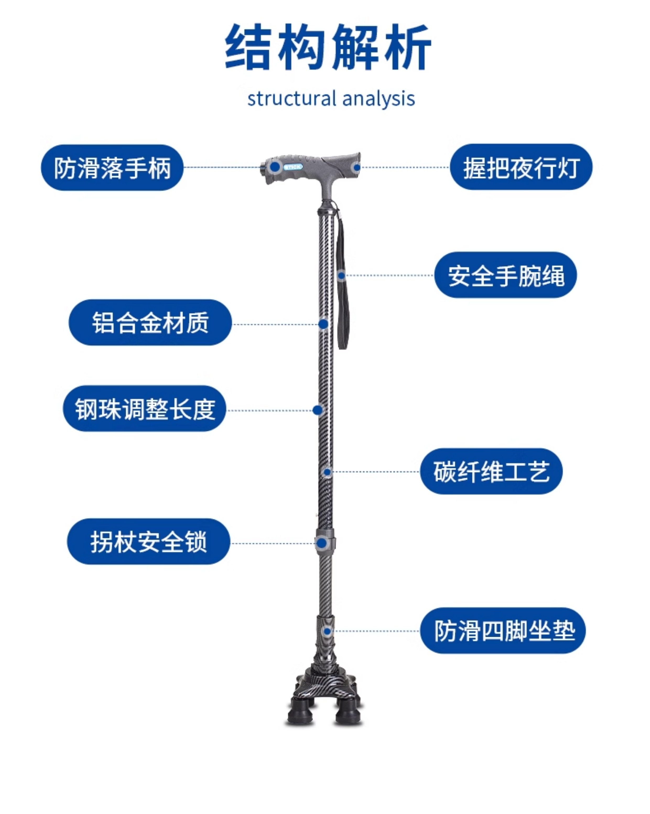 Cane for Elderly, Non-Slip, Lightweight, Telescopic, Four-Legged, Special Universal Bottom Rubber Head Walking Stick, Four-Corner Walking Aid