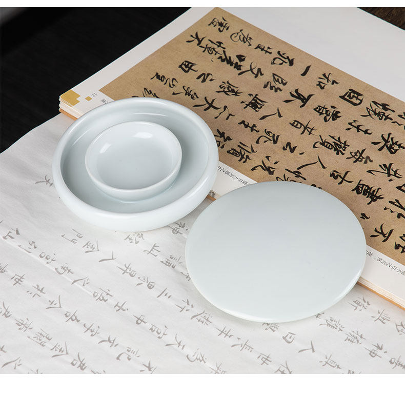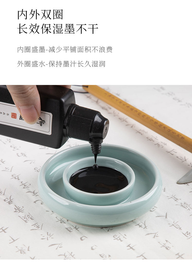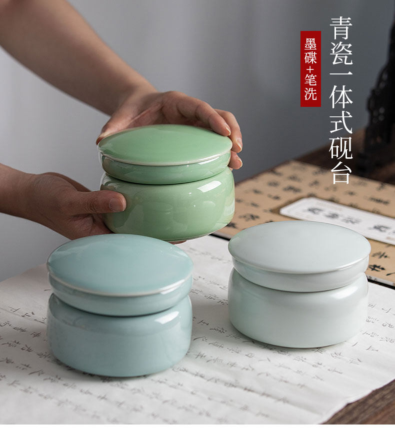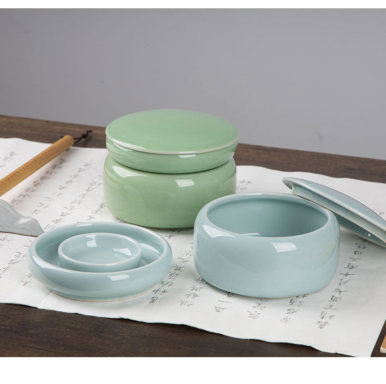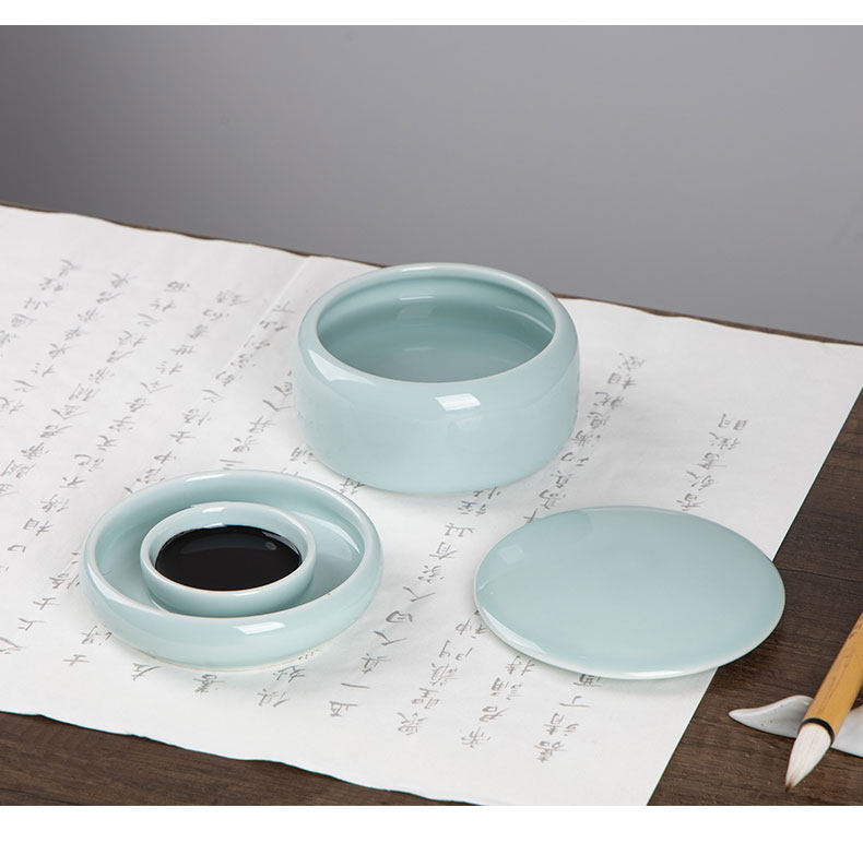 Celadon Inkstone for Calligraphy, Special Inkstone for Practicing Calligraphy, Ink Dish for Holding Ink, Ink Box with Lid, Double-Ring to Prevent Ink Drying, Creative Ceramic Inkstone, Pen Washer, Pen Licking Bowl, Calligraphy and Chinese Painting Supplies, Study Room Decoration