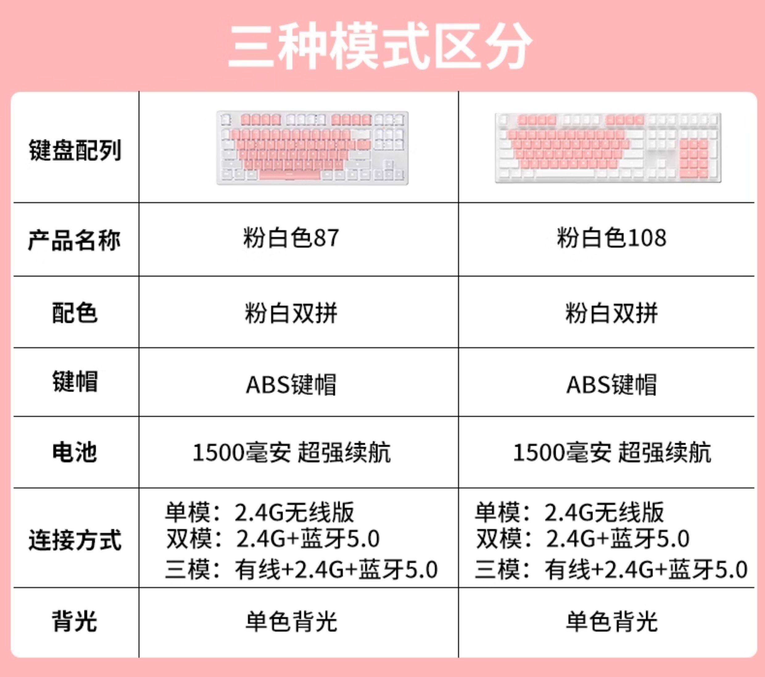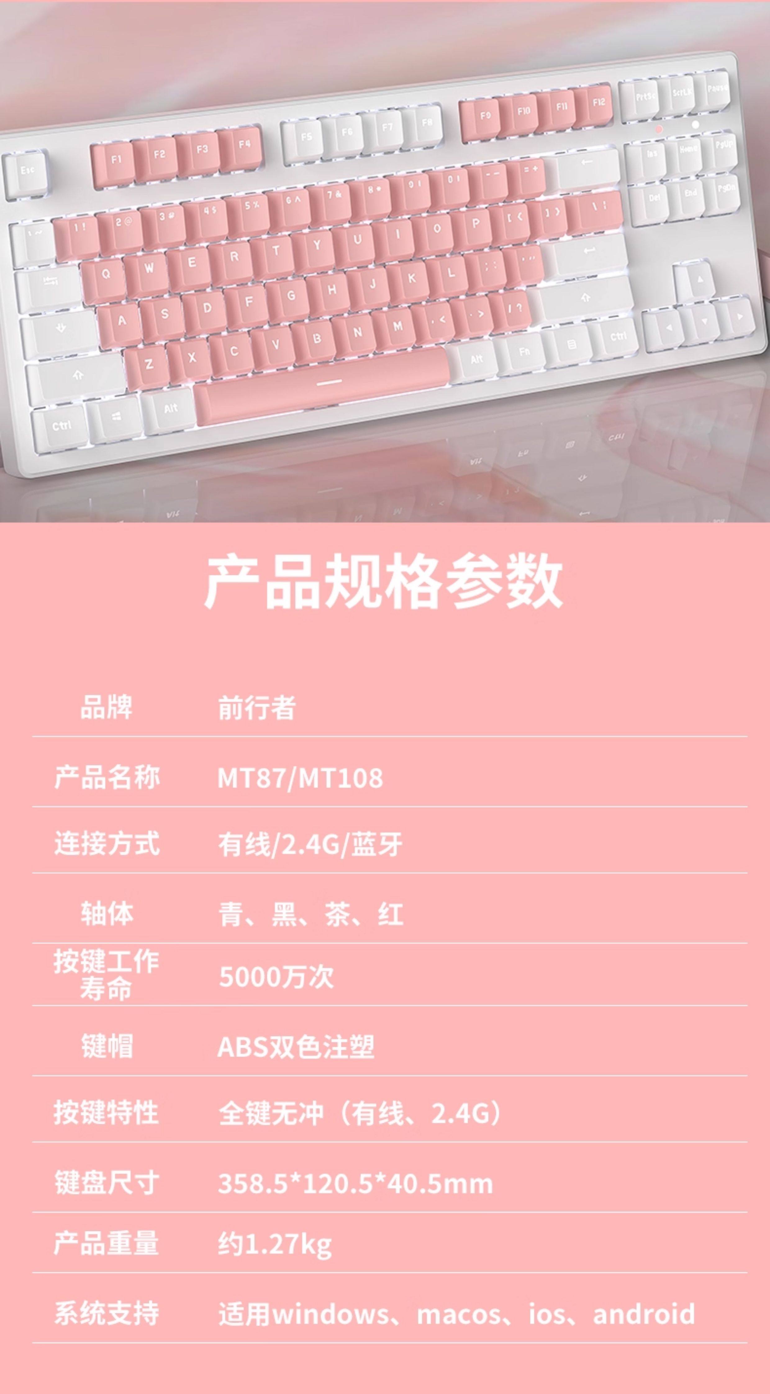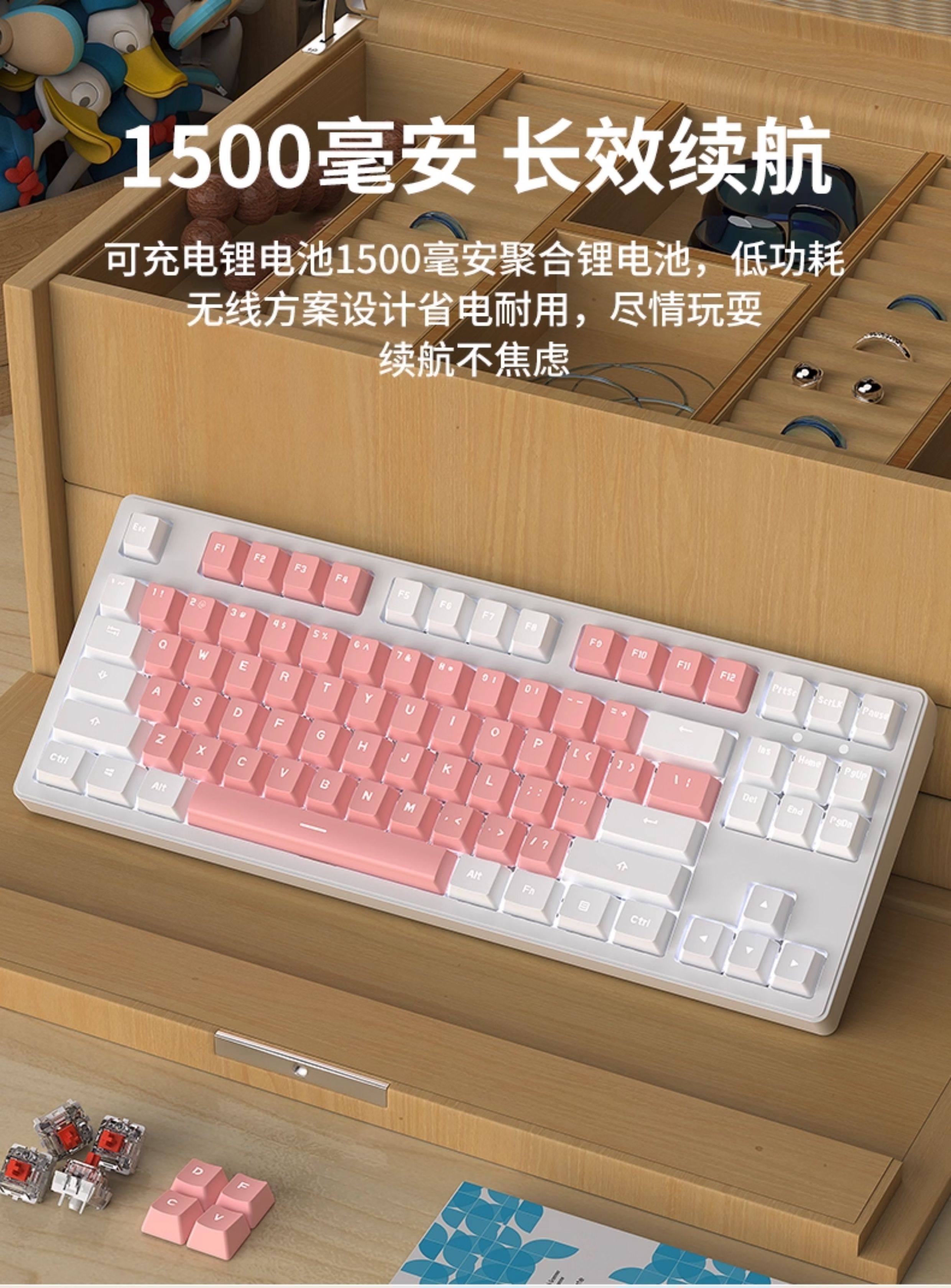 | Color Classification | Pink-White Light[Wireless Bluetooth Tri-Mode],Pink and White Macarons[Wireless Bluetooth Tri-Mode],White Powder Macarons[Wireless Bluetooth Tri-Mode],White-White Light[Wireless Bluetooth Tri-Mode],Blue and White Mediterranean[Wireless Bluetooth Tri-Mode],Pink-White Light[108 Keys - Wireless Bluetooth Tri-Mode],Pink and White Macarons[108 Keys - Wireless Bluetooth Tri-Mode],White-White Light[108 Keys - Wireless Bluetooth Tri-Mode],Blue and White Mediterranean[108 Keys - Wireless Bluetooth Tri-Mode],Snack Bunny[87-Key Wireless Tri-Mode Keyboard],Snack Bunny[108-Key Wireless Tri-Mode Keyboard],Naughty Bunny[87-Key Wireless Tri-Mode Keyboard],Naughty Bunny[108-Key Wireless Tri-Mode Keyboard],Snack Bunny Set[87-Key Wireless Tri-Mode Keyboard],Naughty Bunny Set[87-Key Wireless Tri-Mode Keyboard],Snack Bunny Set[108-Key Wireless Tri-Mode Keyboard],Naughty Bunny Set[108-Key Wireless Tri-Mode Keyboard],[87 Keys]White White Light-Keyboard and Mouse Set,[87 Keys]Pink White Light-Keyboard and Mouse Set,[87 Keys]Pink White Macaron-Keyboard and Mouse Set,[87 Keys]White Pink Macaron-Keyboard and Mouse Set,[108 Keys]White White Light-Keyboard and Mouse Set,[108 Keys]Pink White Light-Keyboard and Mouse Set,[108 Keys]Pink White Macaron-Keyboard and Mouse Set,[108 Keys]White Pink Macaron-Keyboard and Mouse Set,[Add to Favorites and Place an Order]Contact Customer Service to Get a Large Table Mat |