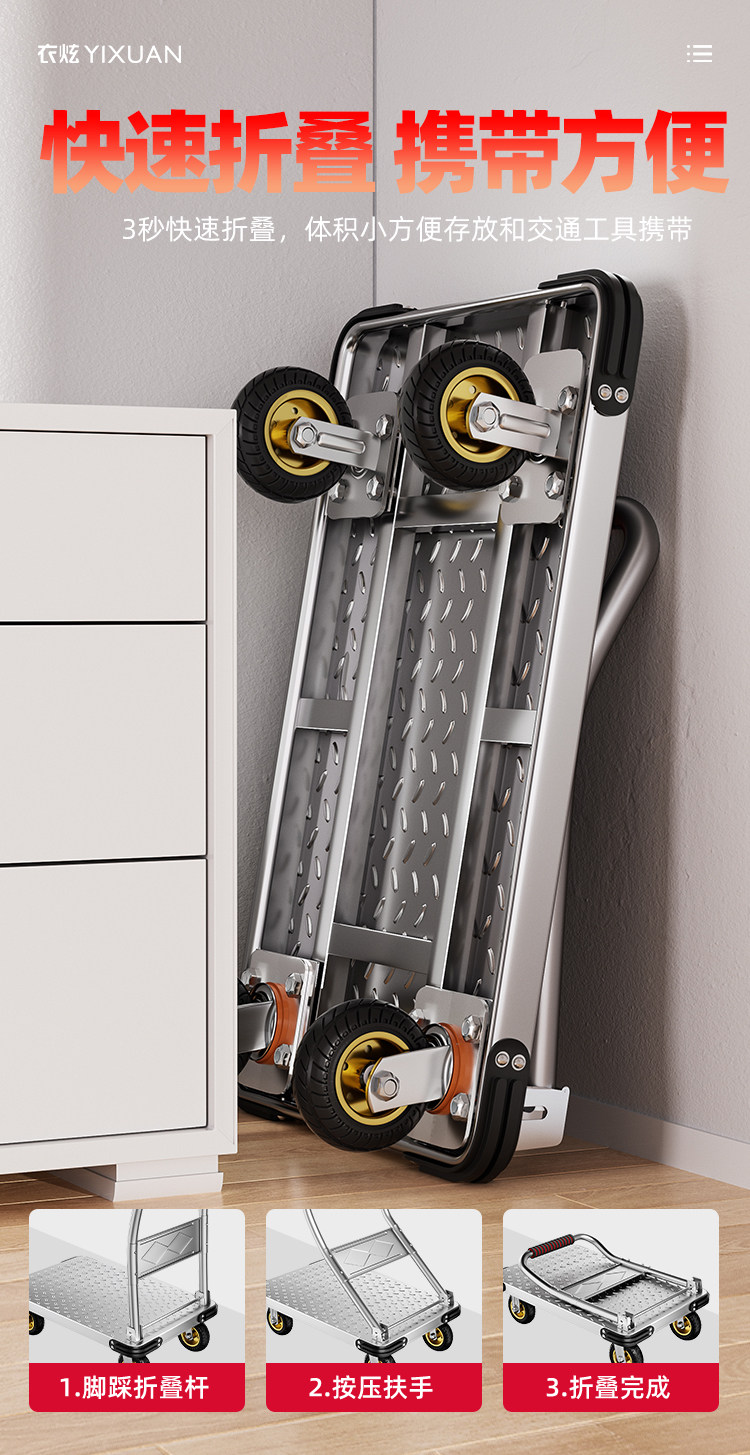 Handcart for Carrying Goods, Steel Plate Trolley, Hand-Pushed Cart, Transport Cart, Household Flatbed Cart, Portable Folding Cart, Hand-Pulled Cart