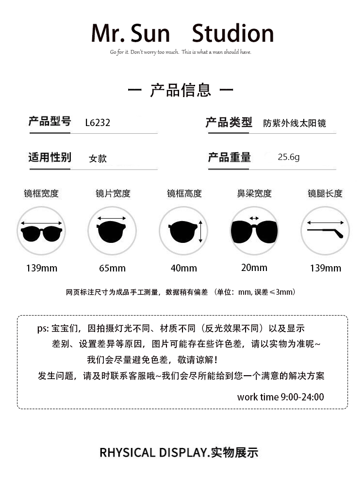| Color Classification | Black Frame Champagne Slices,Black Frame Black Film,White Frame Black Film,Tea Frame Black Film,Leopard Print Frame Tea Slices,Burgundy Frame Gray Piece |