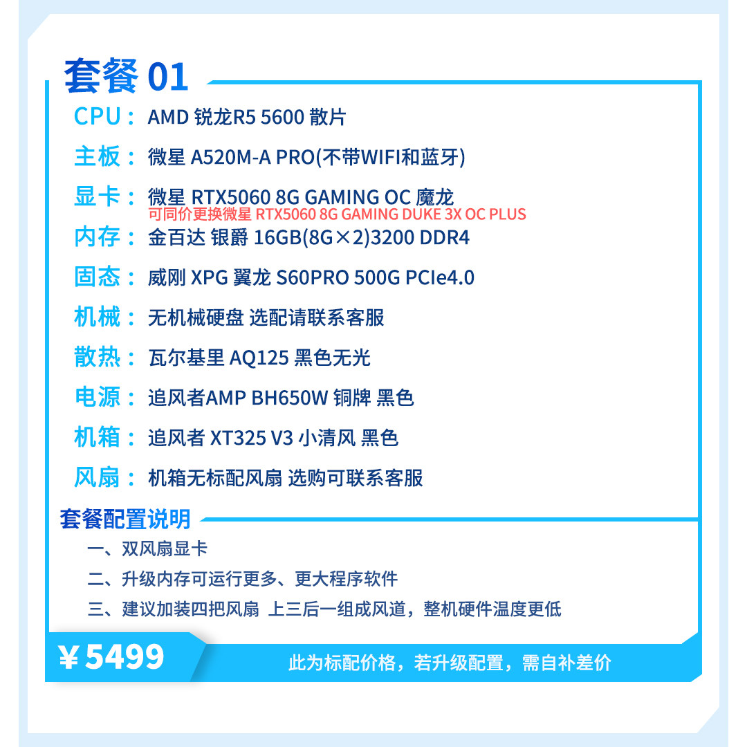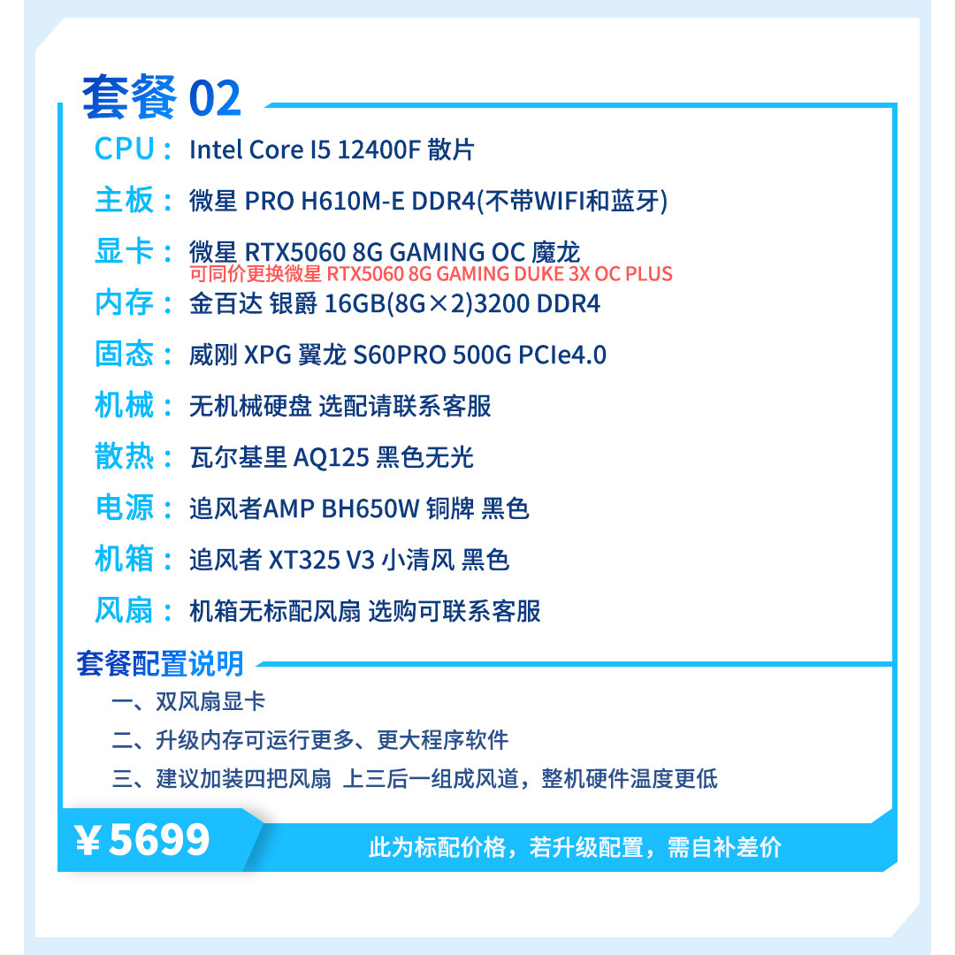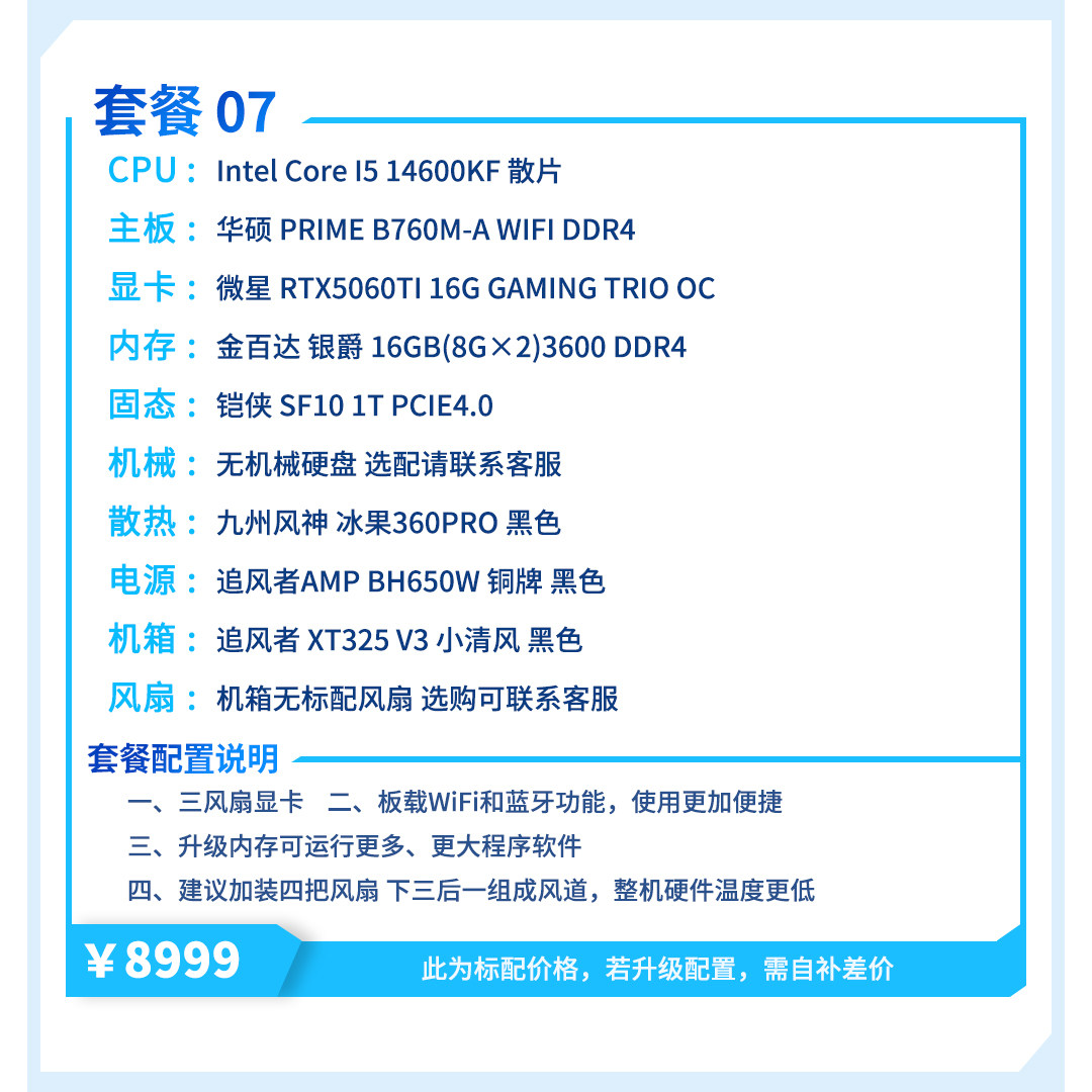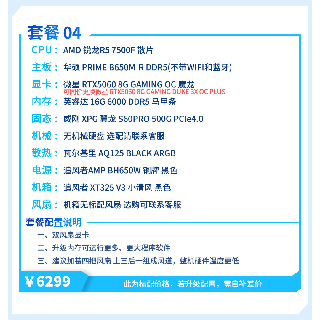 | Package Type | Package 1 (R5 5600+Rtx5060),Package 2 (I5 12400F+Rtx5060),Package Three (R7 5700X+Rtx5060),Package 4 (R5 7500F+Rtx5060),Package 5 (I5 12600Kf+Rtx5060),Package 6 (R5 9600X+Rtx5060Ti),Package 7 (I5 14600Kf+Rtx5060Ti),Package 8 (R7 9700X+Rtx5060Ti),Package 9 (R7 7800X3D+Rtx5060Ti) |