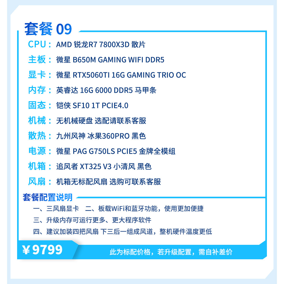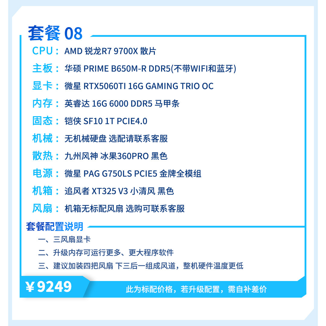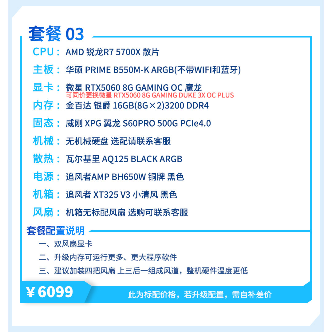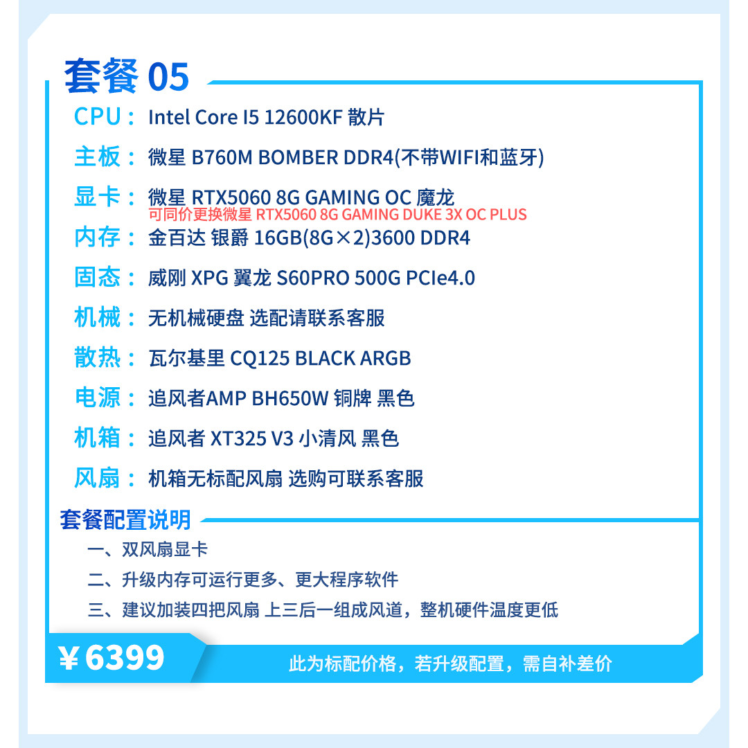 | Package Type | Package 1 (R5 5600+Rtx5060),Package 2 (I5 12400F+Rtx5060),Package Three (R7 5700X+Rtx5060),Package 4 (R5 7500F+Rtx5060),Package 5 (I5 12600Kf+Rtx5060),Package 6 (R5 9600X+Rtx5060Ti),Package 7 (I5 14600Kf+Rtx5060Ti),Package 8 (R7 9700X+Rtx5060Ti),Package 9 (R7 7800X3D+Rtx5060Ti) |