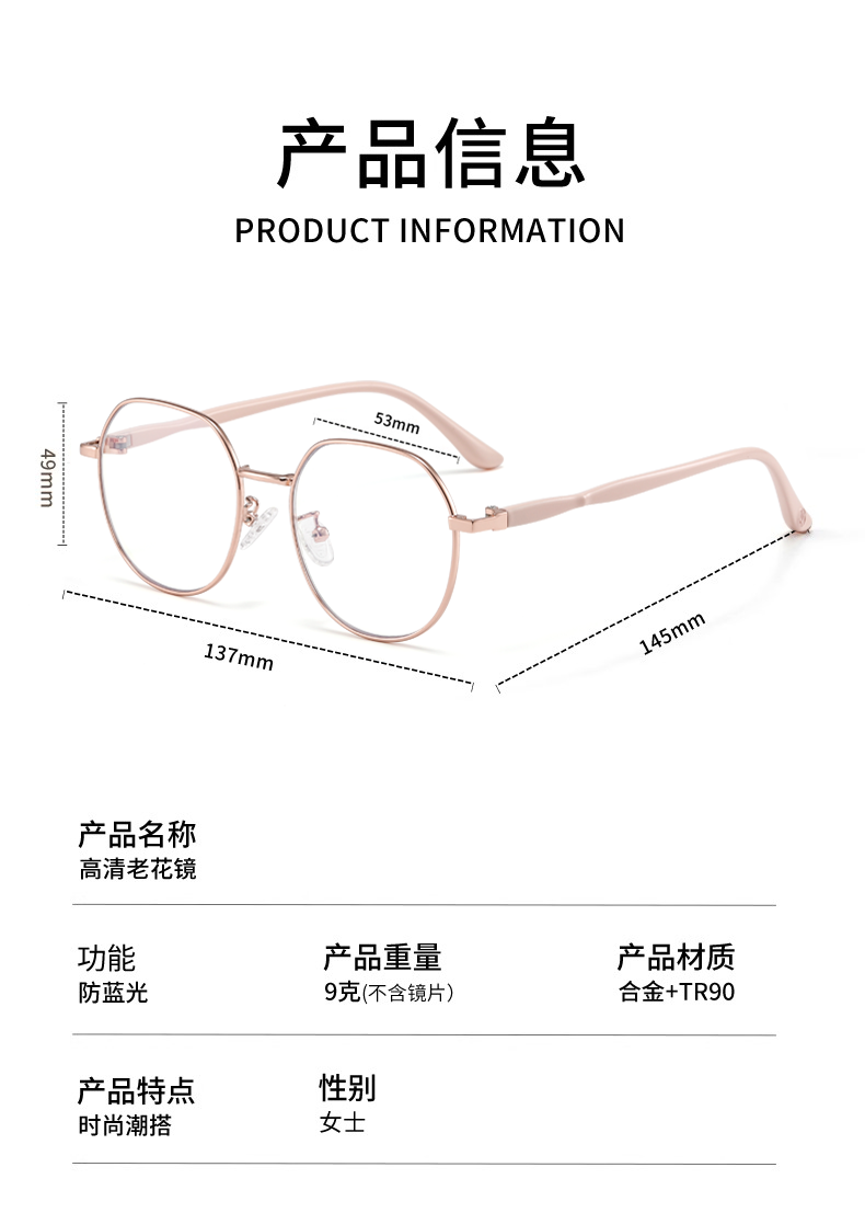 | Lens Refractive Index | [100 Degrees]High-Definition Anti-Blue Light Recommended for 46-49 Years Old,[150 Degrees]High-Definition Anti-Blue Light Recommended for 50-54 Years Old,[200 Degrees]High-Definition Anti-Blue Light Recommended for 55-59 Years Old,[250 Degrees]High-Definition Anti-Blue Light Recommended for 60-64 Years Old,[300 Degrees]High-Definition Anti-Blue Light Recommended for 65-69 Years Old,[350 Degrees]High-Definition Anti-Blue Light Recommended for 70-74 Years Old,[400 Degrees]High-Definition Anti-Blue Light Recommended for Those over 75 Years Old |