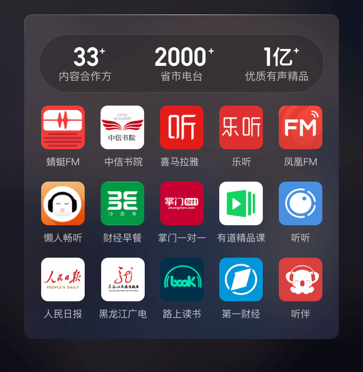 | Source of Content | Dragonfly Fm,Netease Cloud Music,Qq Music,Himalaya Fm |
