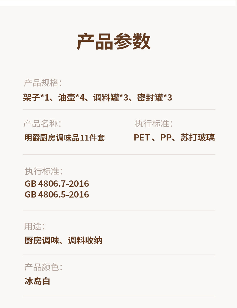 | Color Classification | [11-Piece Condiment Bottle Set] Oil and Vinegar Bottles*4+Condiment Jars*3+Sealed Jars*3+Storage Box*1 |